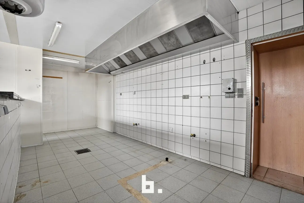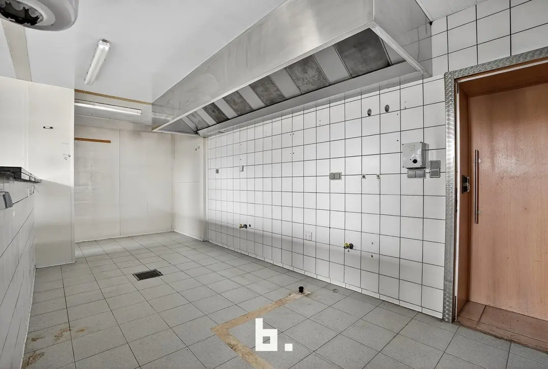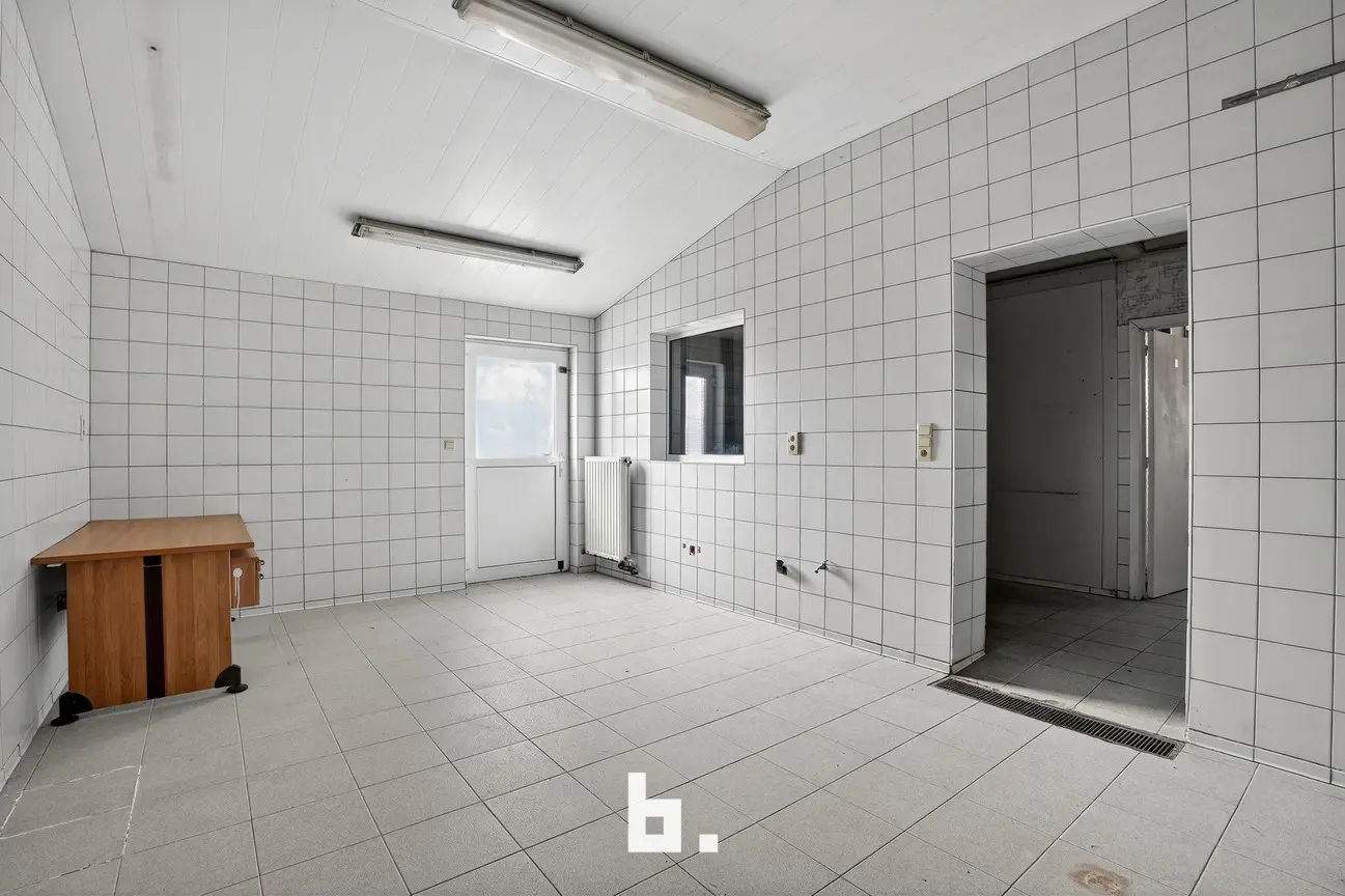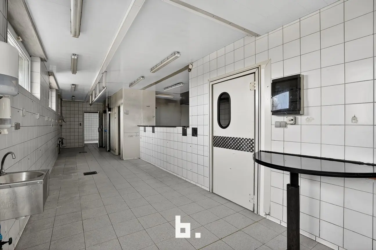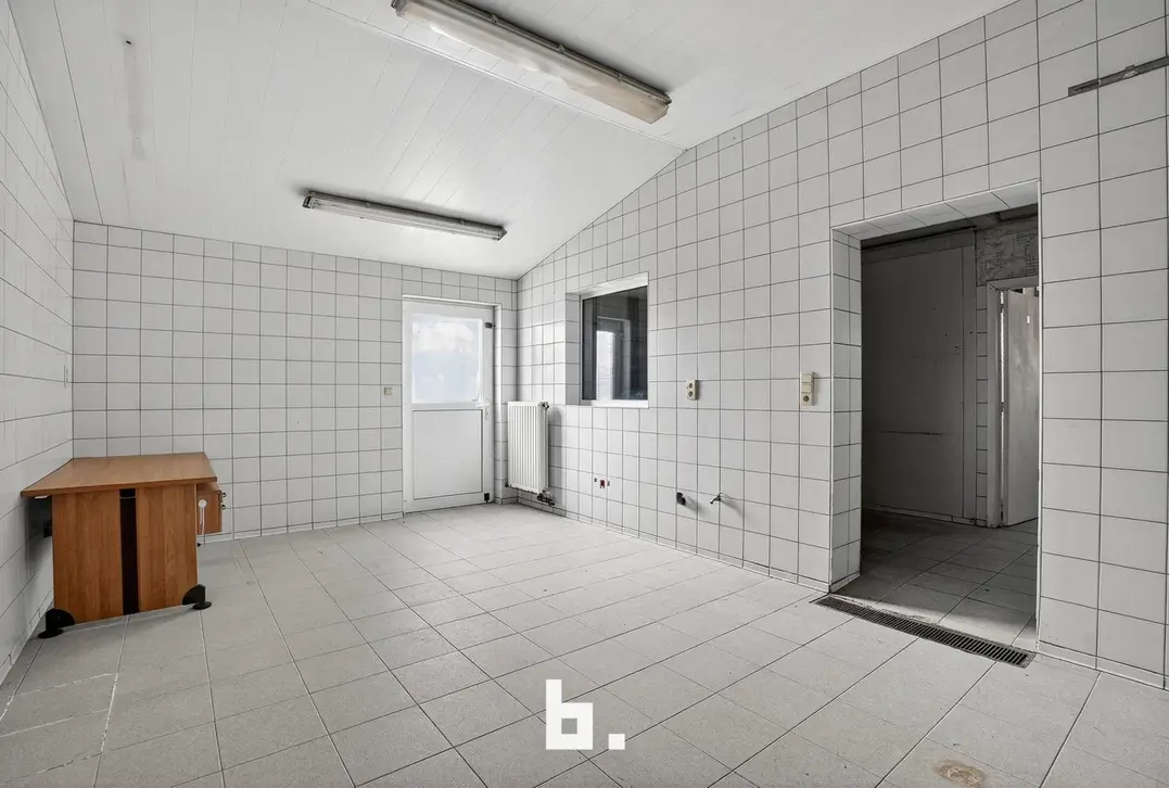 GLV: ruim kantoor/winkelruimte, archiefruimte en atelier met verschillende ruimtes, koelruimtes, toiletten en bergingen. Aparte toegang voor de winkel en atelier. Achter de winkel ligt de grote leefruimte en keuken.
