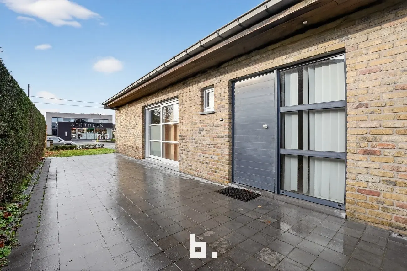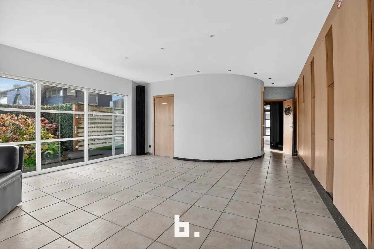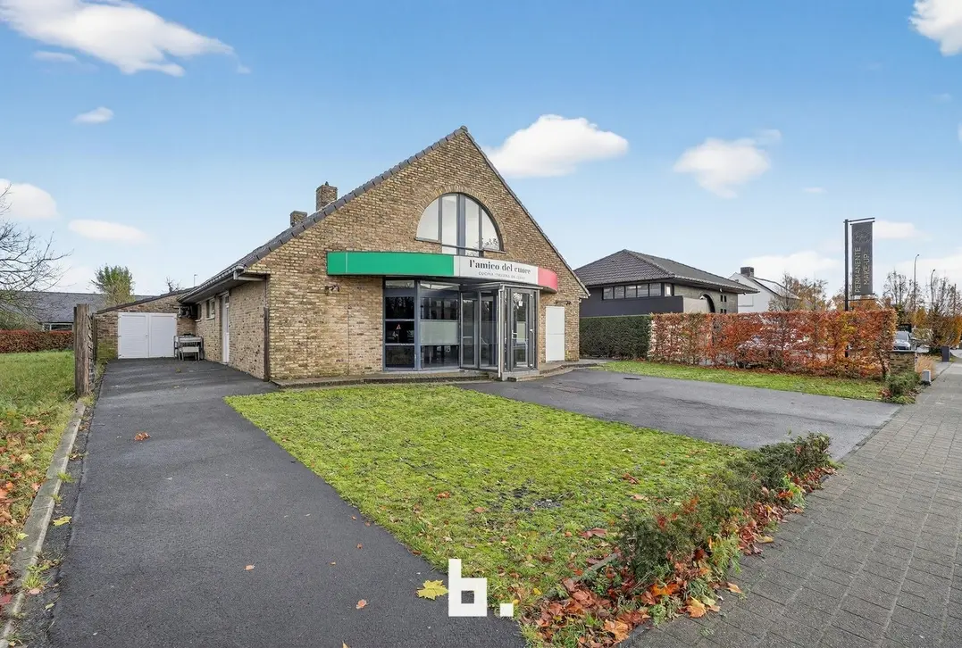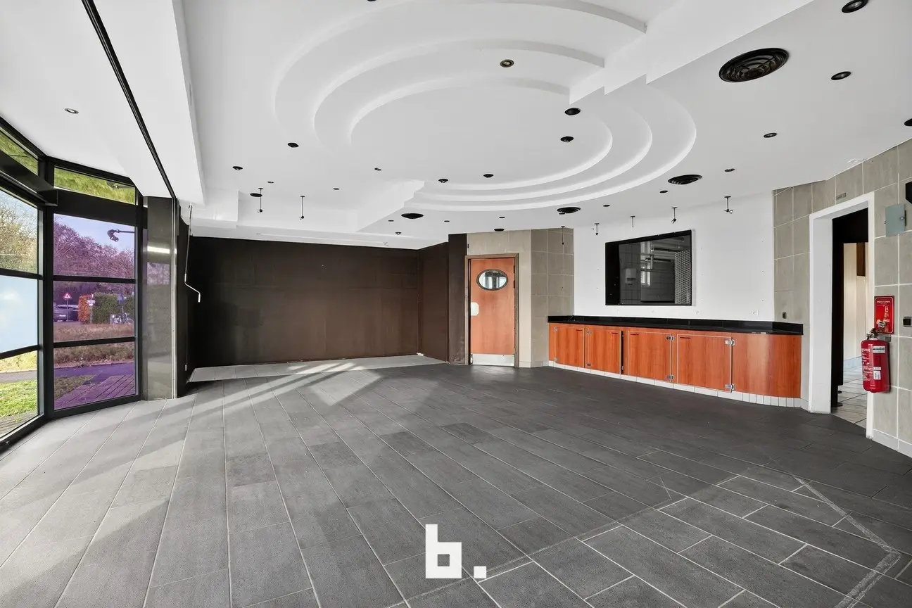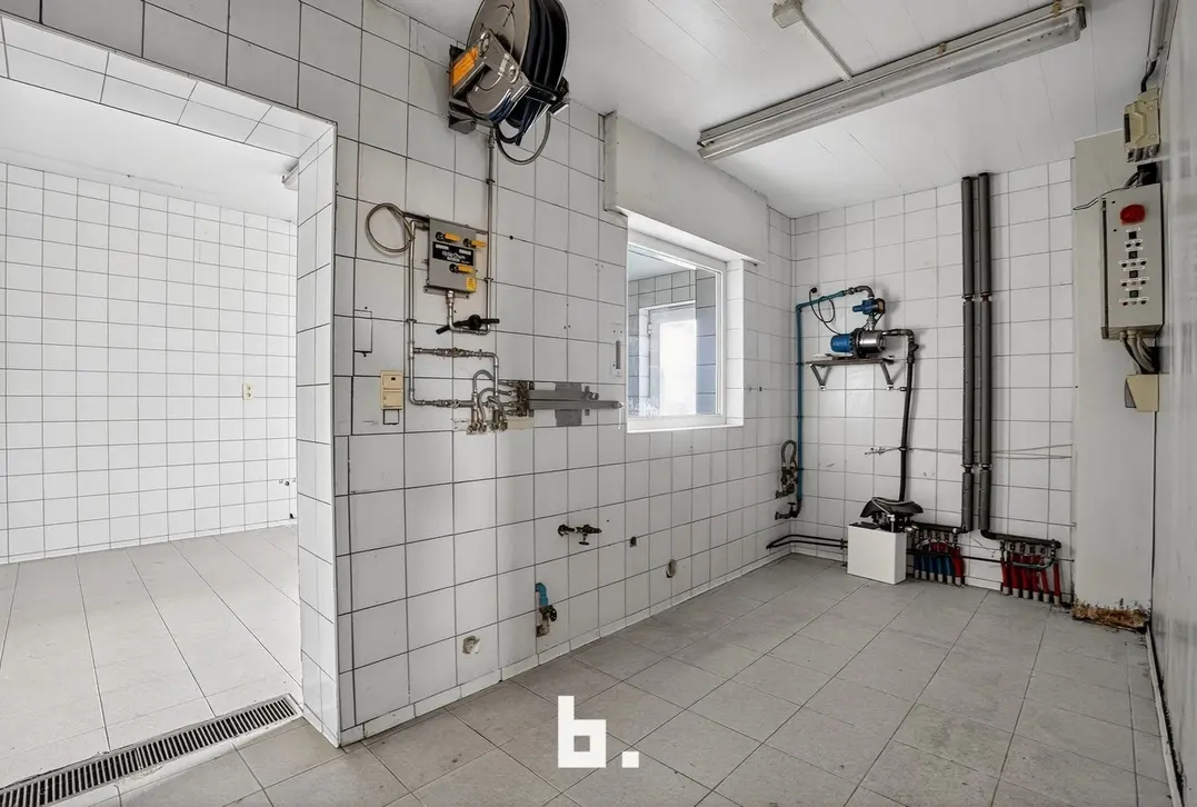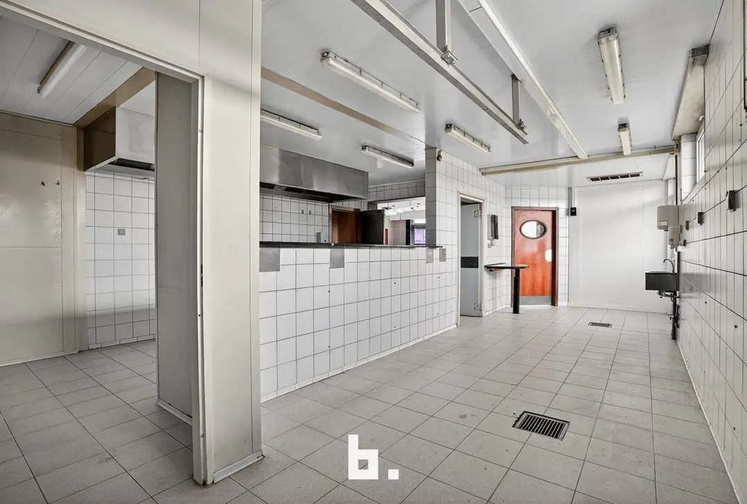 GLV: ruim kantoor/winkelruimte, archiefruimte en atelier met verschillende ruimtes, koelruimtes, toiletten en bergingen. Aparte toegang voor de winkel en atelier. Achter de winkel ligt de grote leefruimte en keuken.
