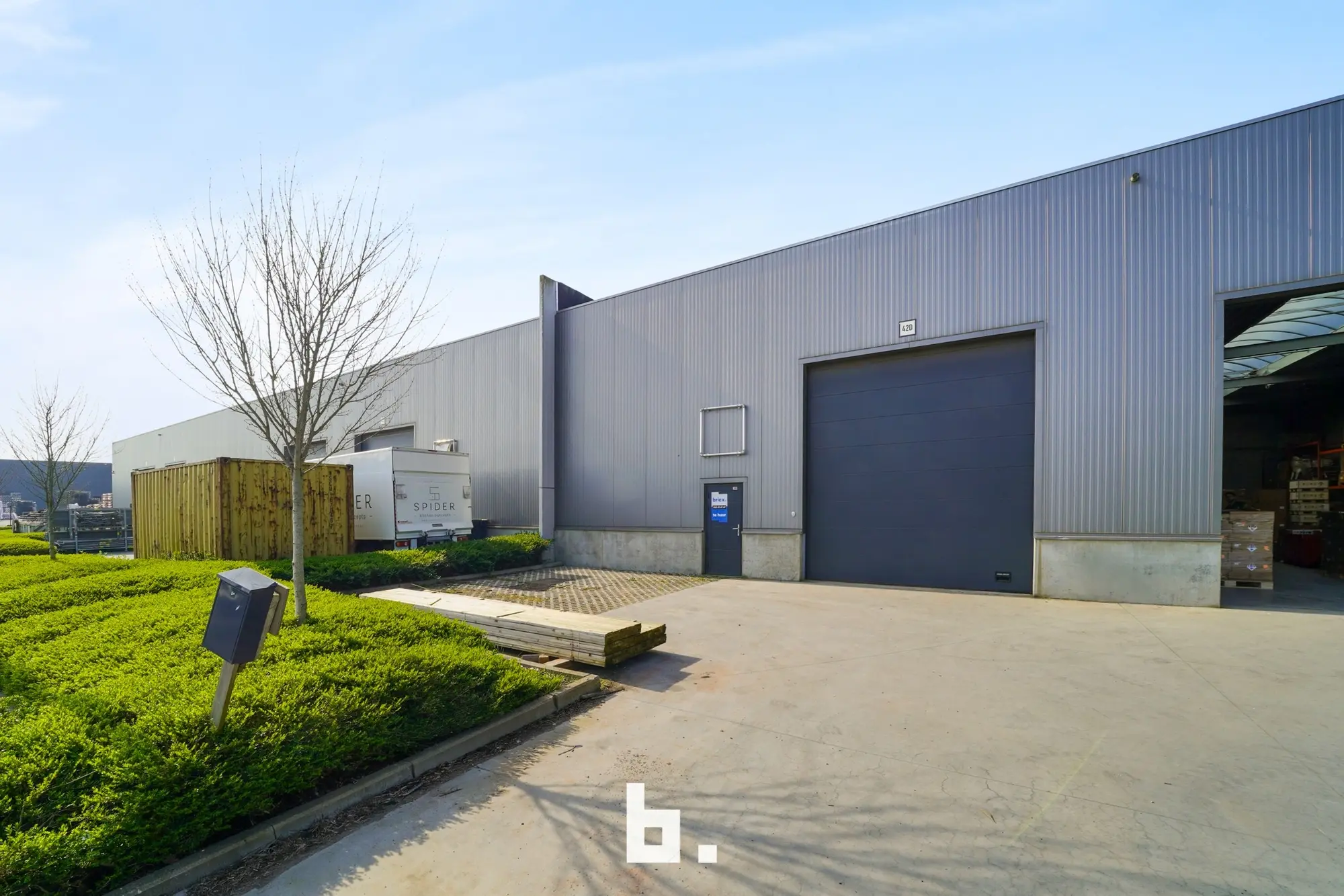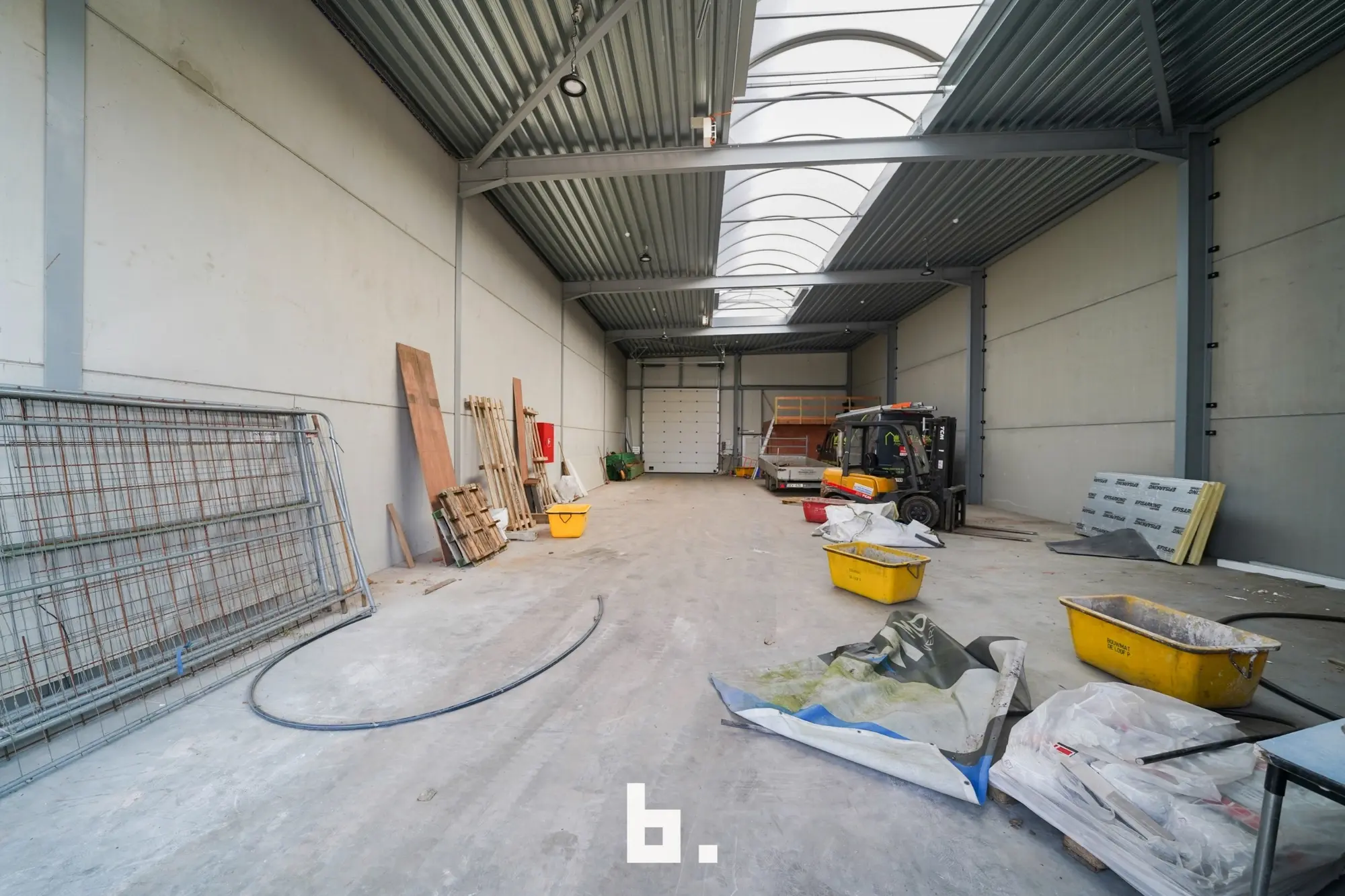 Deze multi- functionele loods is uitgerust met een 2 automatische sectionaalpoorten en een aparte inkomdeur met groot lichtstraat, wat zorgt voor aangename lichtinval.