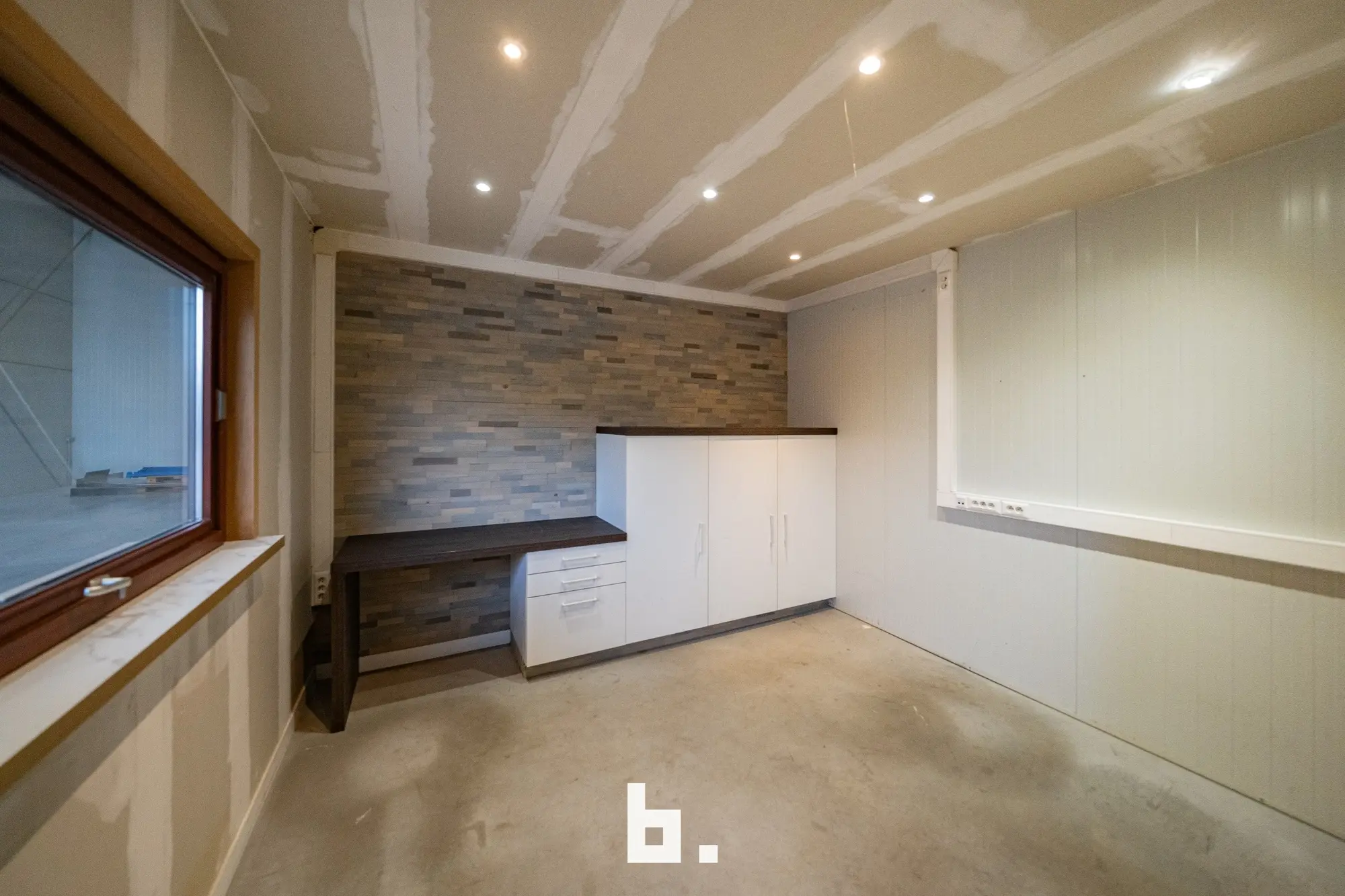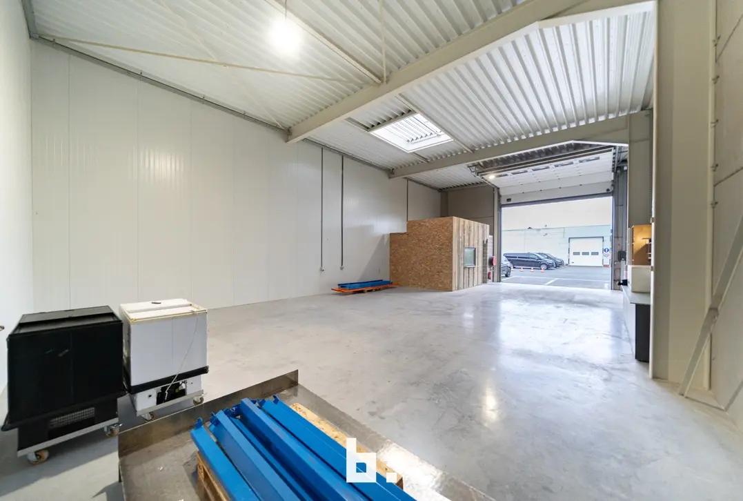 Nieuwbouw loods met grote hoogte van 6 meter elec toegangspoort, poly betoenvloer individuele water/elec meter, wc voorzien, tevens parkeerplaatsen buiten voor 2 wagens , daglicht via koepels en perfecte isolatie van het gebouw. totale oppervlakte is 184 m² in het deel van de loods is er ook een bureel ruimte.