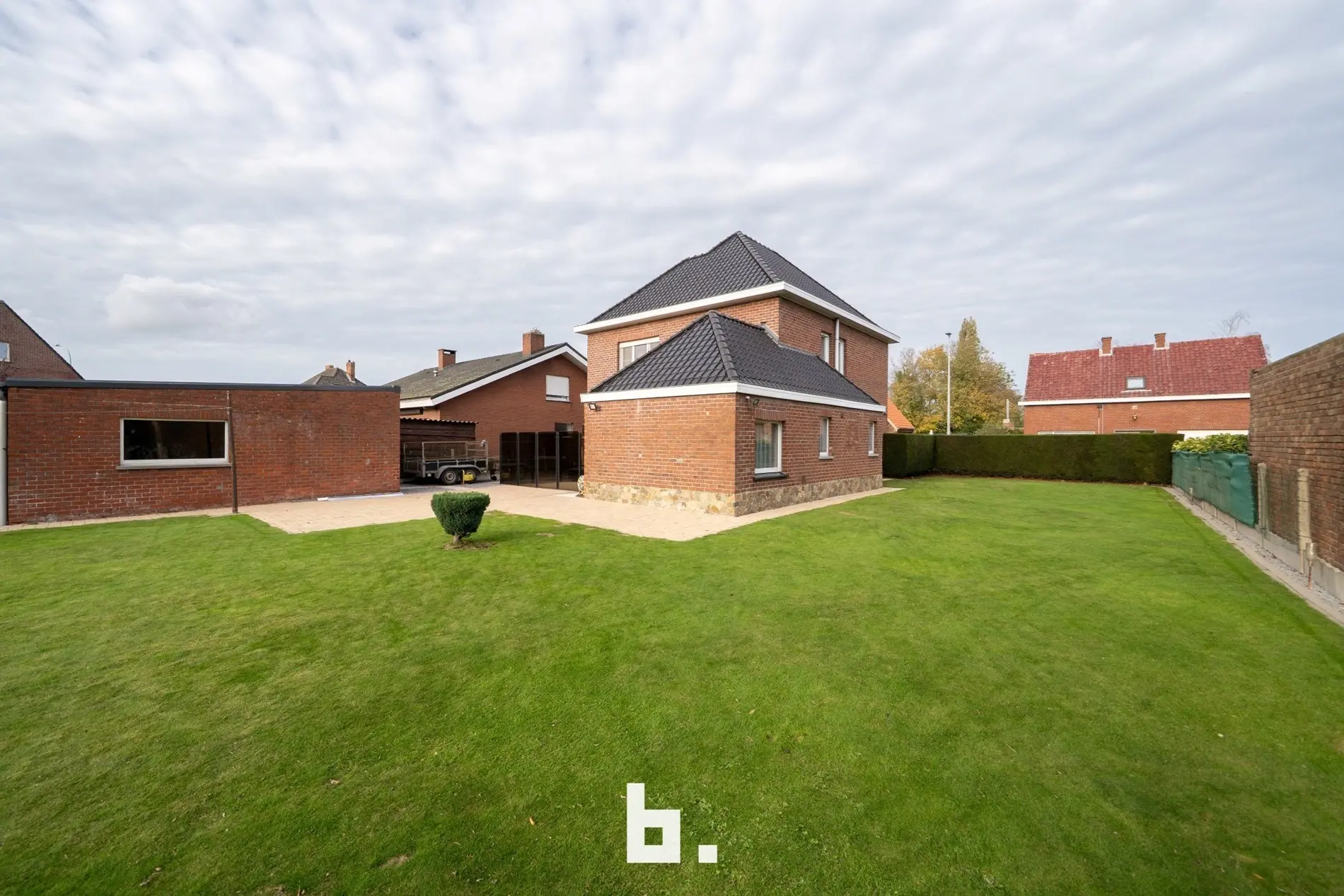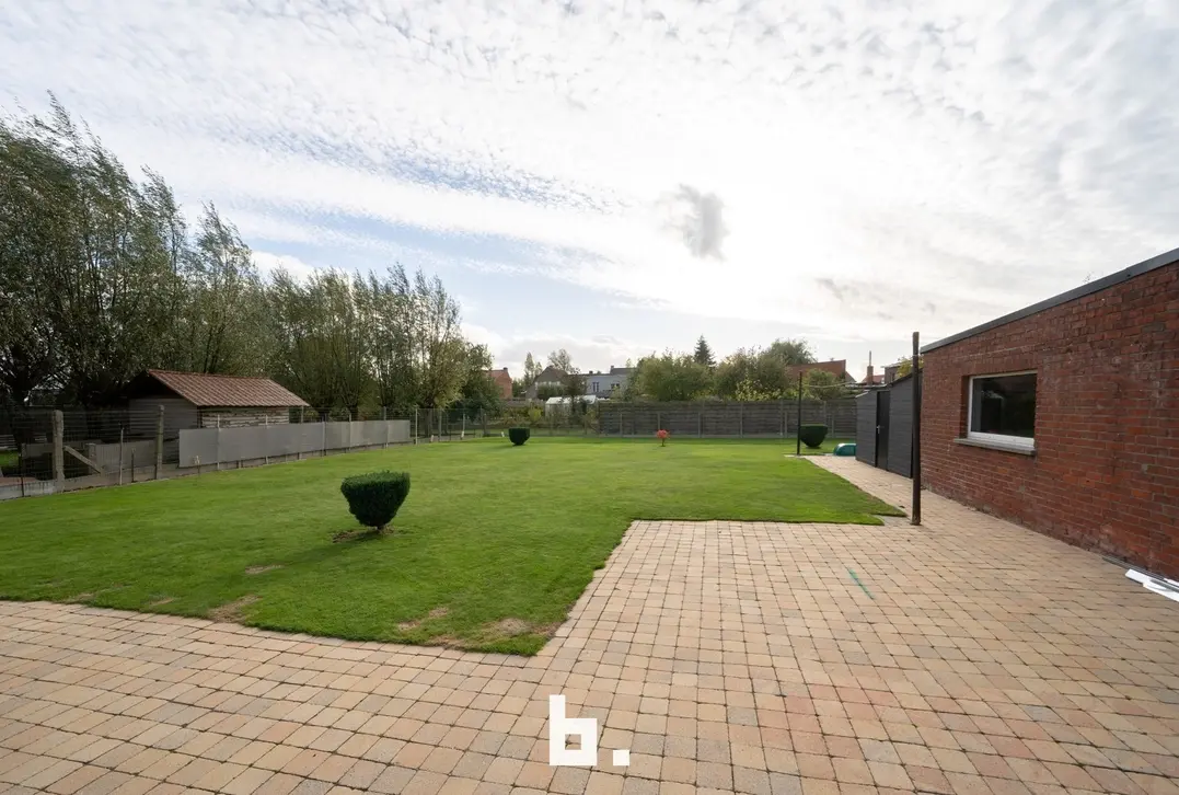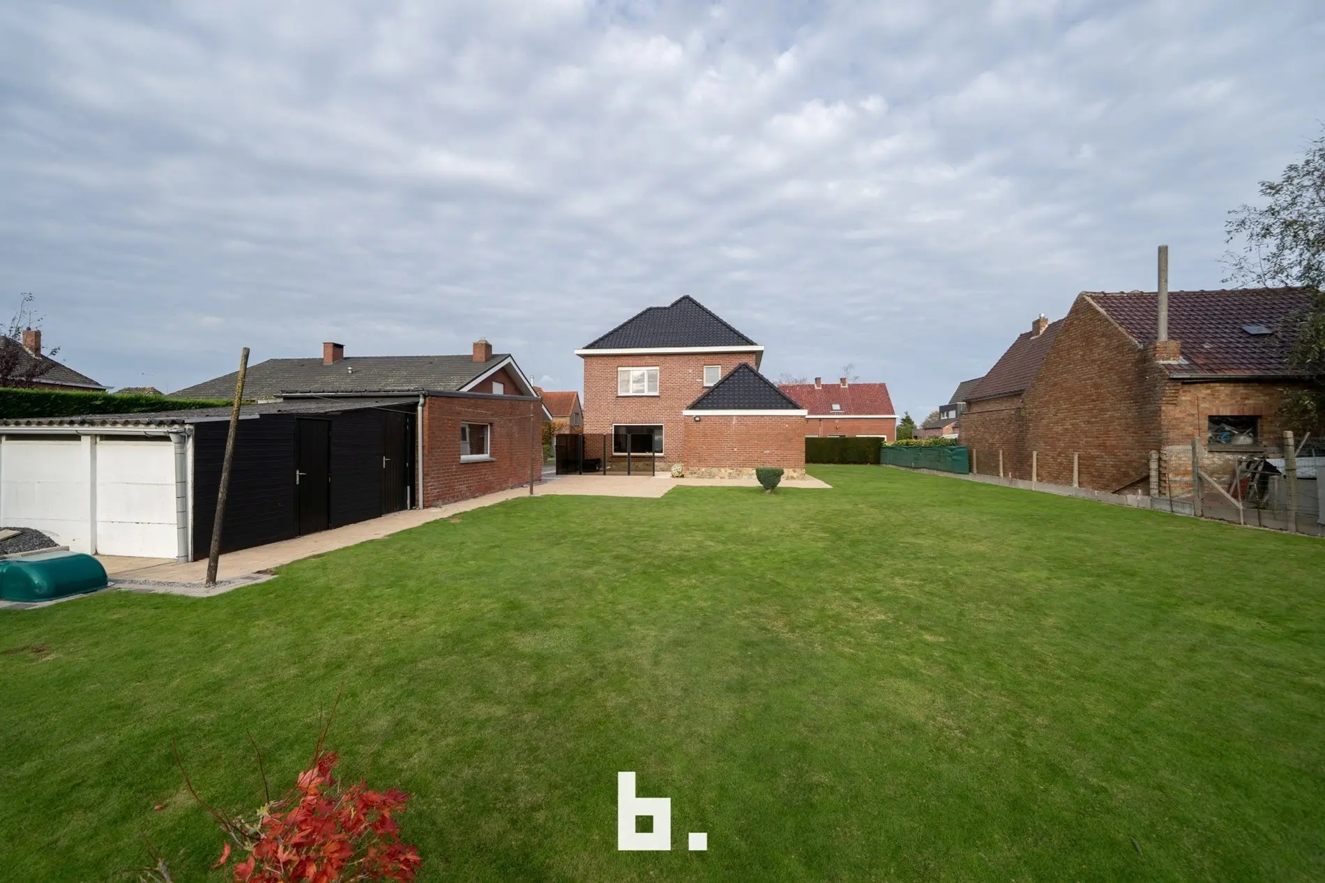 Grote tuin met gazon (robotmaaier over te nemen) en grote garage met bergingen.