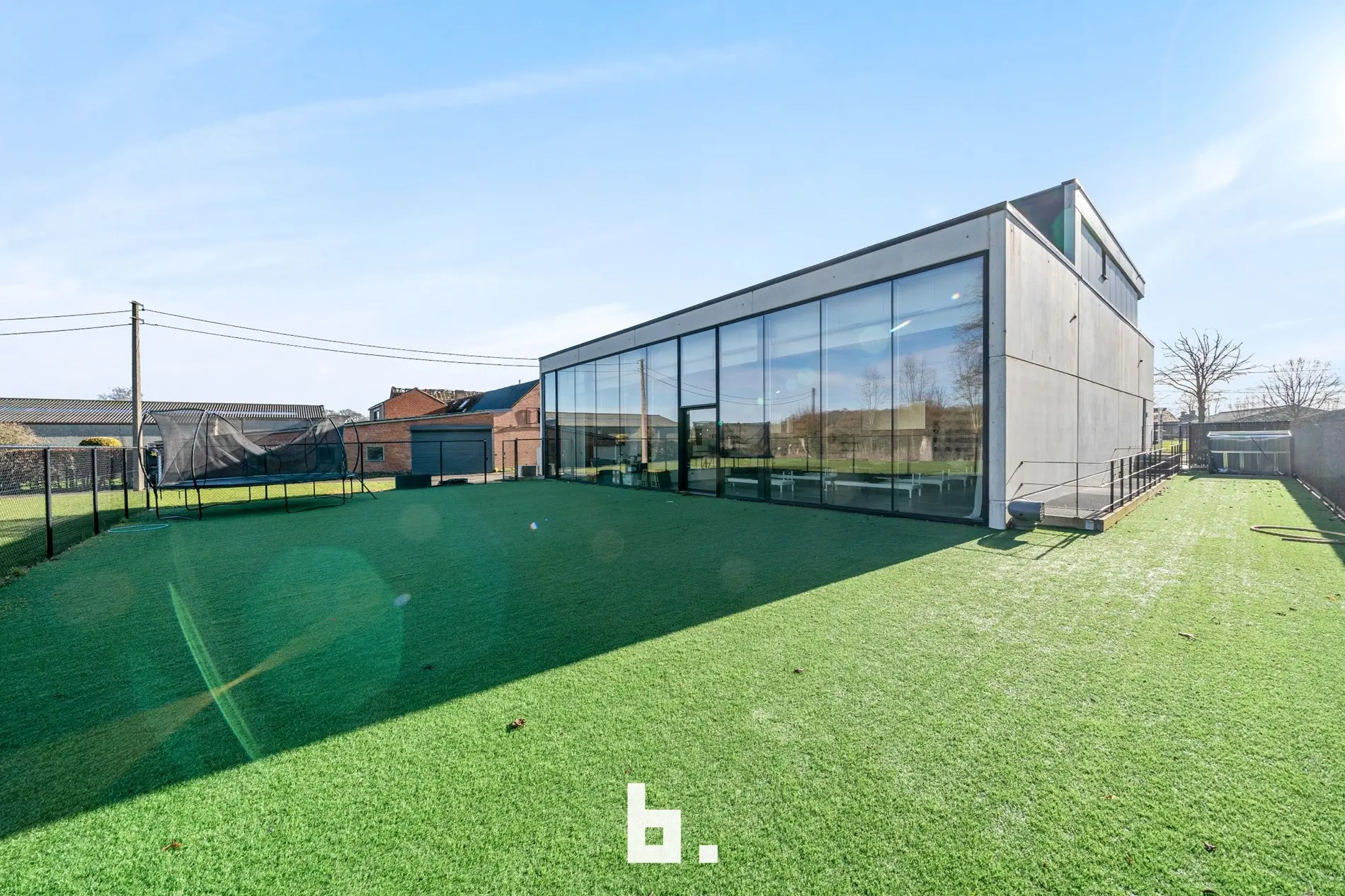 De aparte en ruime handelsruimte (± 110 m²) geniet van veel lichtinval en heeft zicht op en directe toegang tot de tuin, aangelegd met kunstgras en perfect bruikbaar voor diverse activiteiten. In het souterrain bevindt zich bovendien een extra polyvalente ruimte van ± 280 m², ideaal als grote studio, bijkomende sportruimte, kantoren of uitbreiding van de handelsactiviteit.