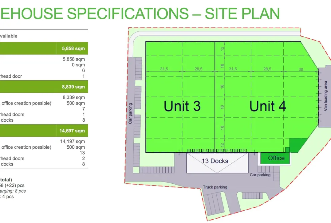 Dit magazijn is beschikbaar vanaf 5.858 m² tot 14.697 m² en heeft volgende specificaties: