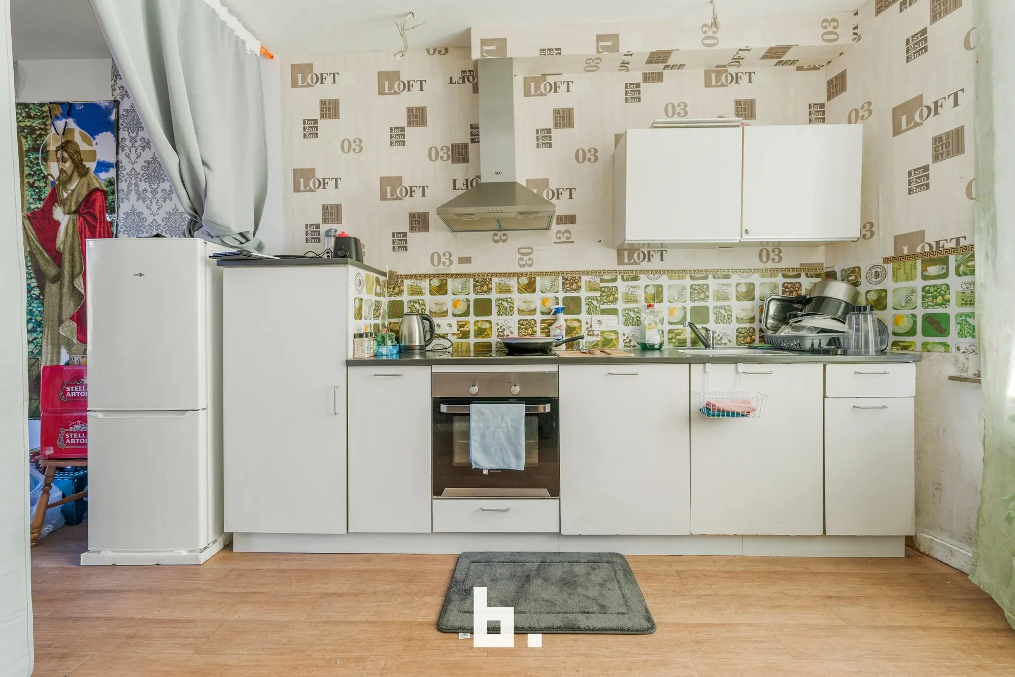 Appartement 1 (volledig gerenoveerd en verhuurd) bestaande uit: Inkomhal, leefruimte met open keuken, slaapkamer, badkamer en ruime stadstuin