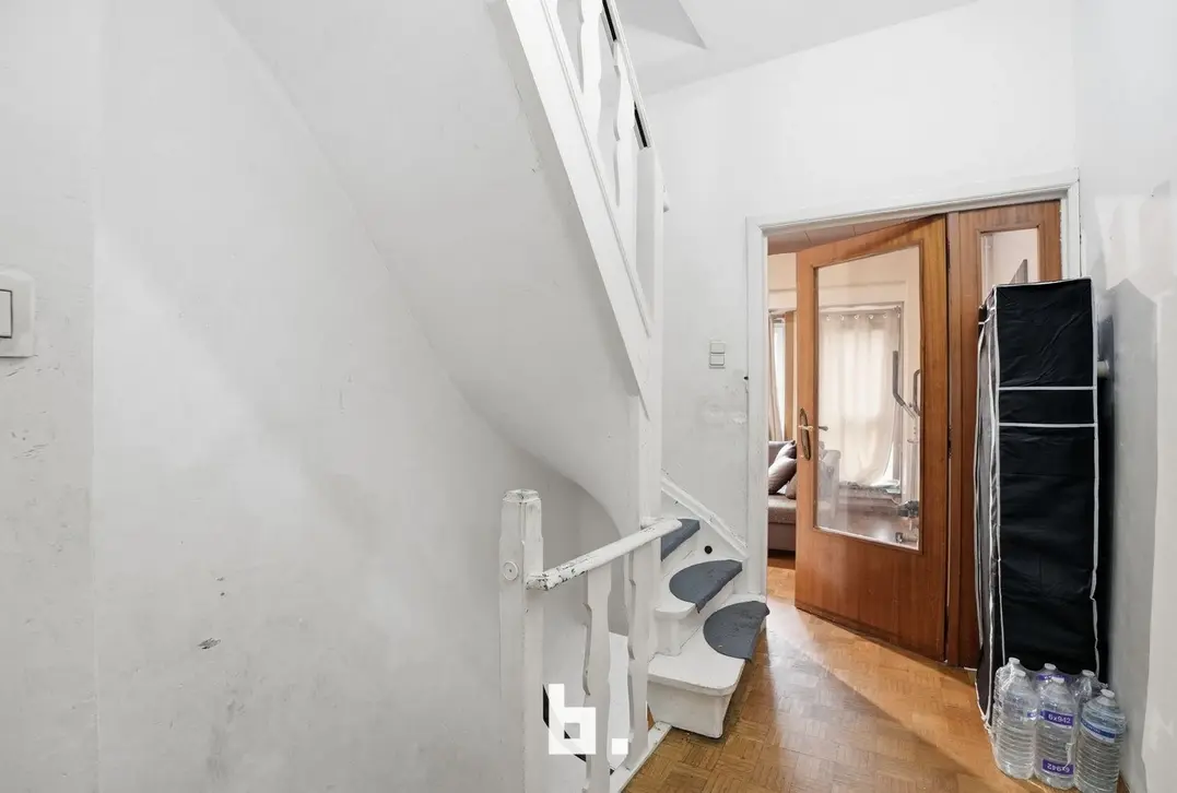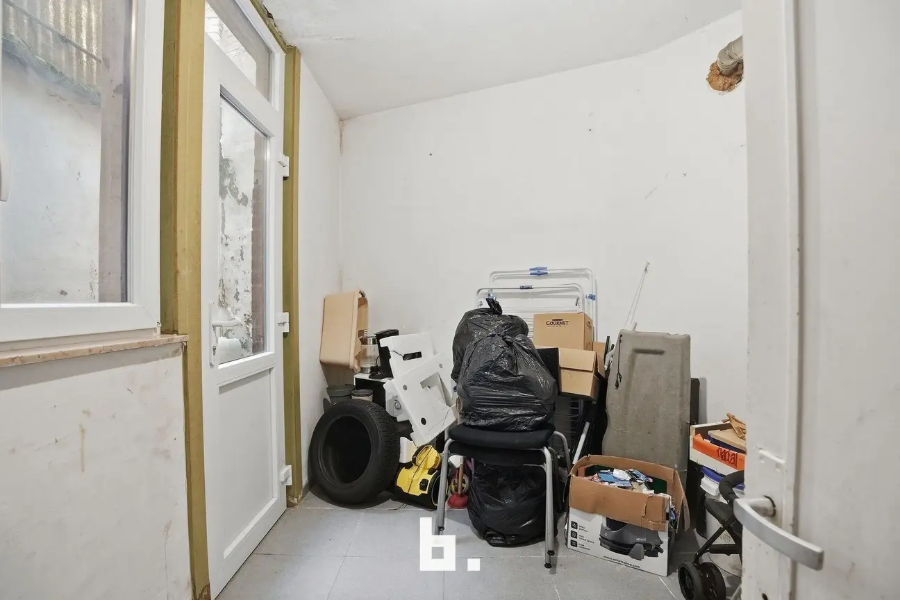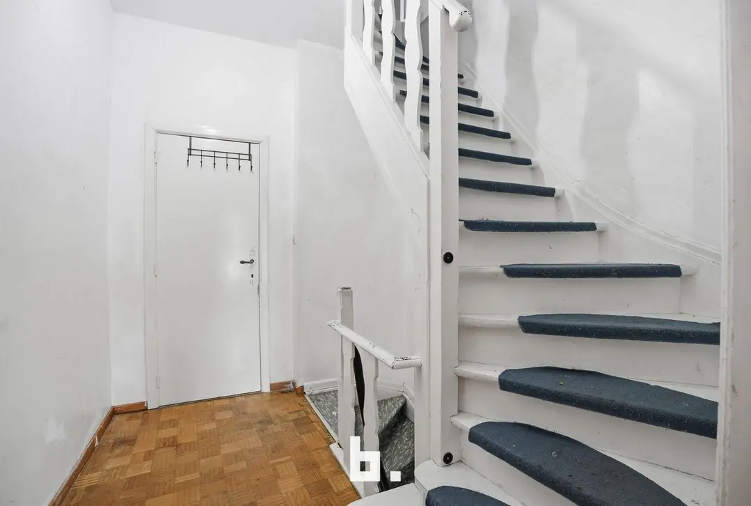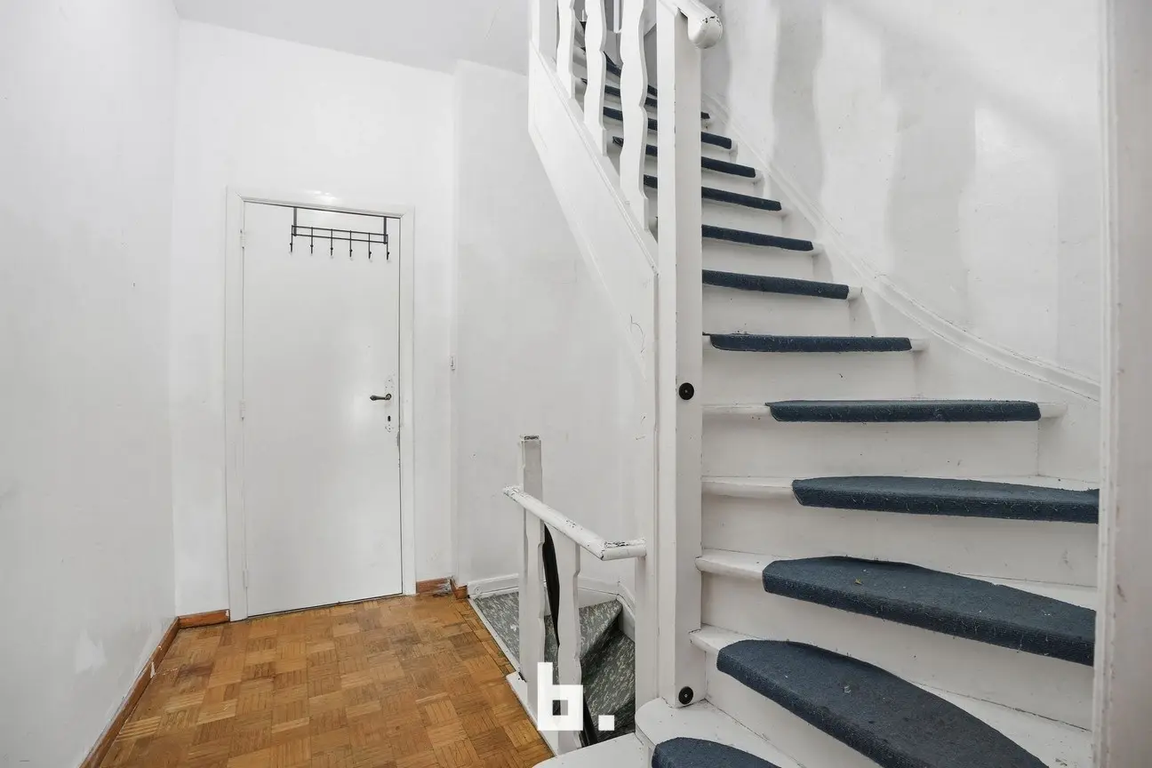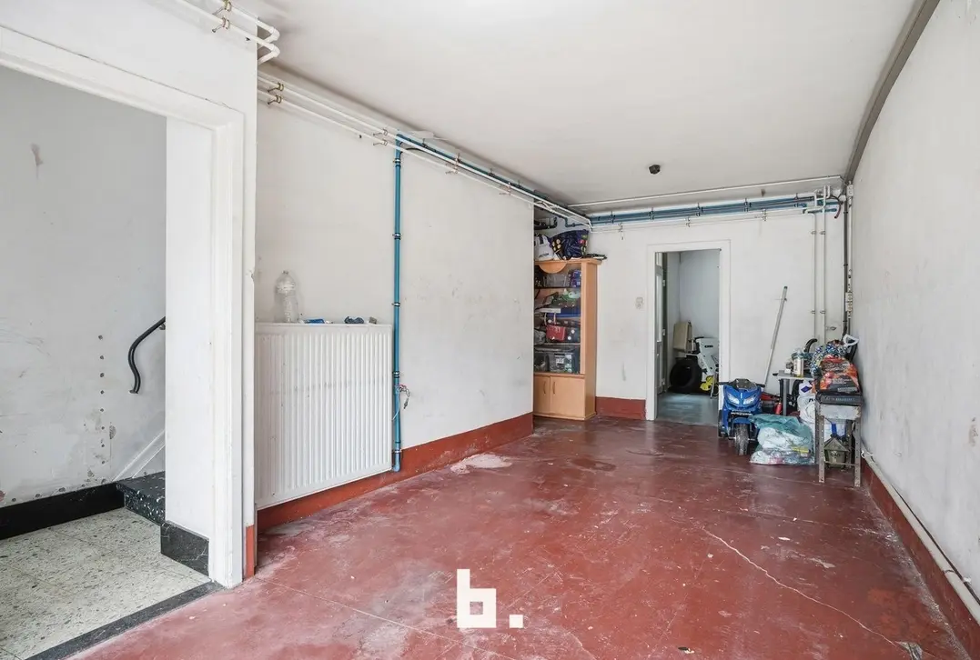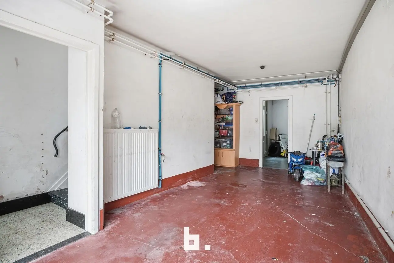Gelijkvloers: Inkomhal met trap, ruime inpandige garage, praktische berging, kelder en koer met uitweg via dienstdoorgang.