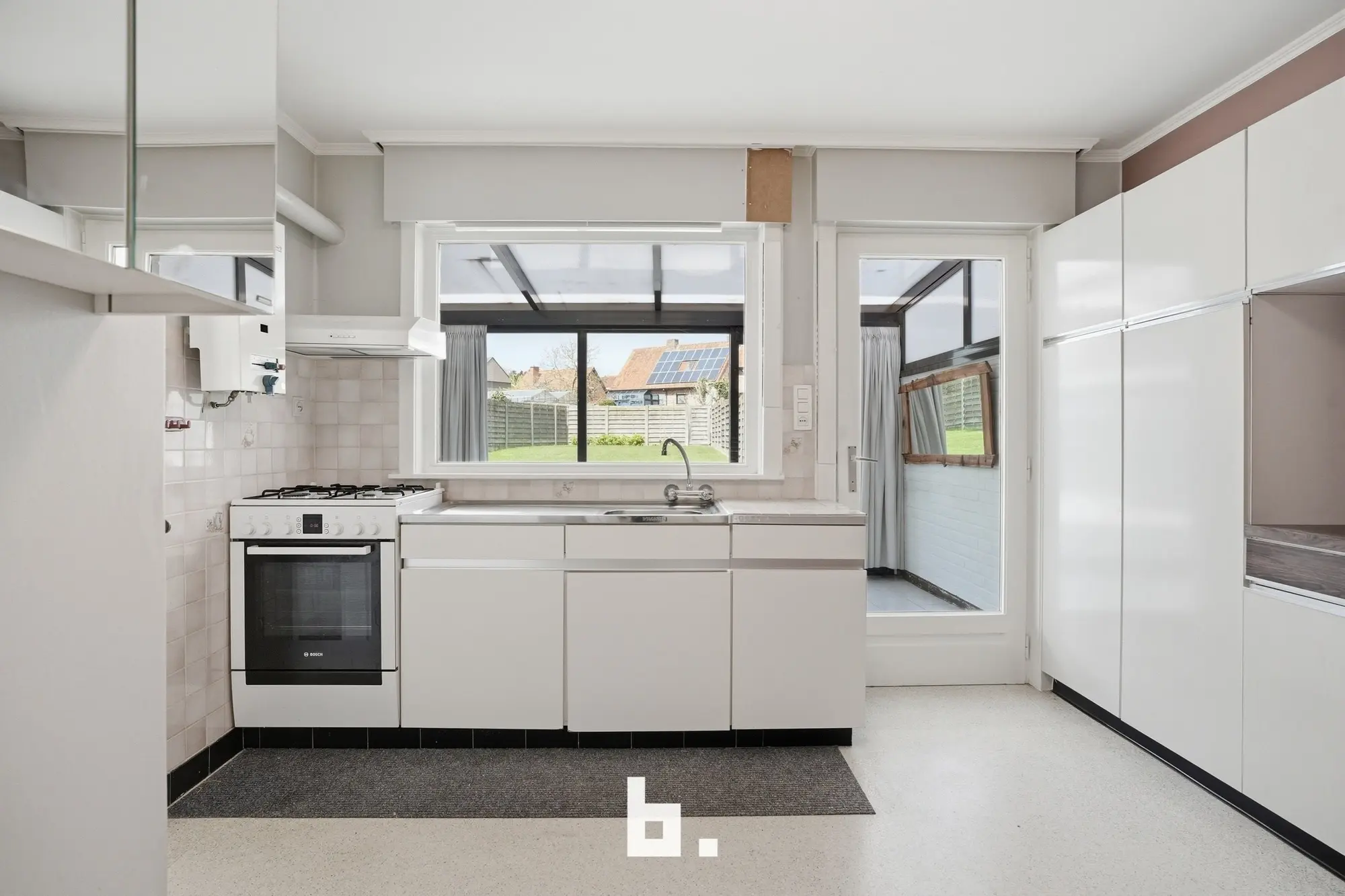 Bij het betreden van de woning wordt u verwelkomd in een lichtrijke woonkamer die in verbinding staat met de keuken. De grote raampartijen zorgen voor een aangename lichtinval en een open gevoel. Aansluitend werd een veranda voorzien, ideaal om het hele jaar door te genieten van het zicht op de tuin.