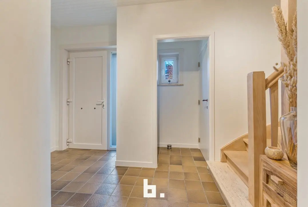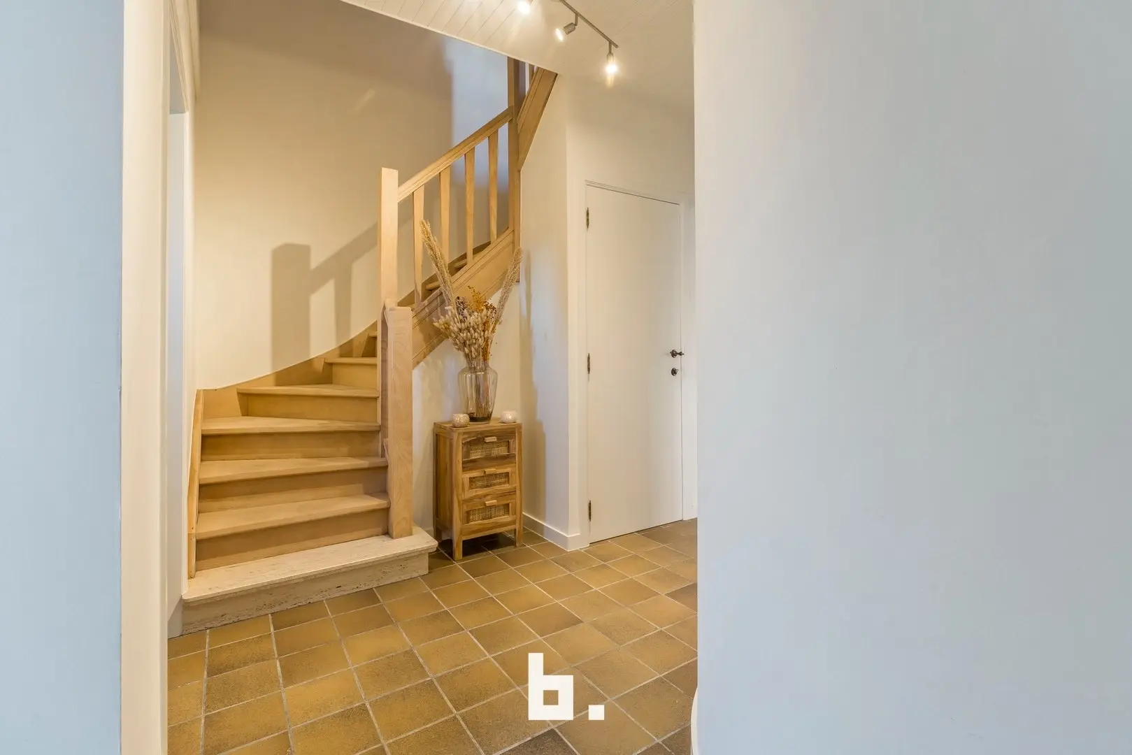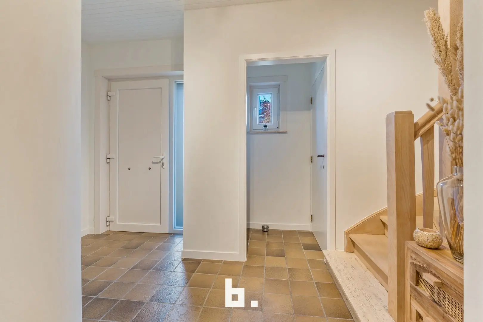 Een ruime inkomhal met apart gastentoilet leidt naar de lichtrijke keuken met veel lichtinval. Aansluitend bevindt zich de gezellige leefruimte, voorzien van een open haard met authentieke schouw. Hiernaast ligt de grote, lichtrijke veranda met directe toegang tot de tuin en de inpandige garage. Verder is er op het gelijkvloers nog een berging aanwezig.