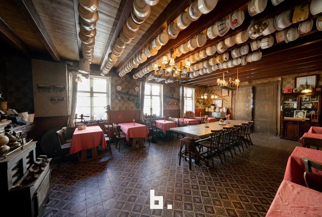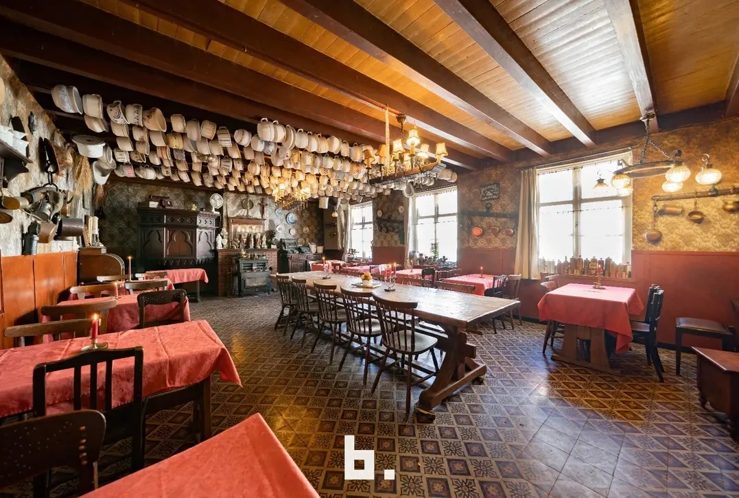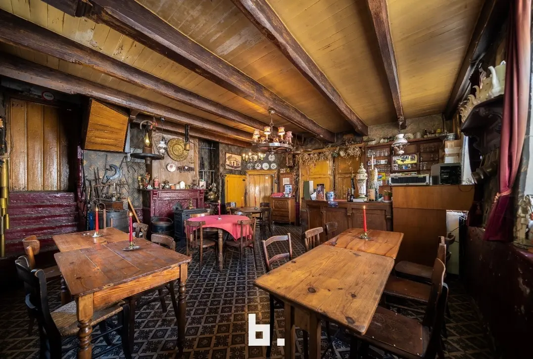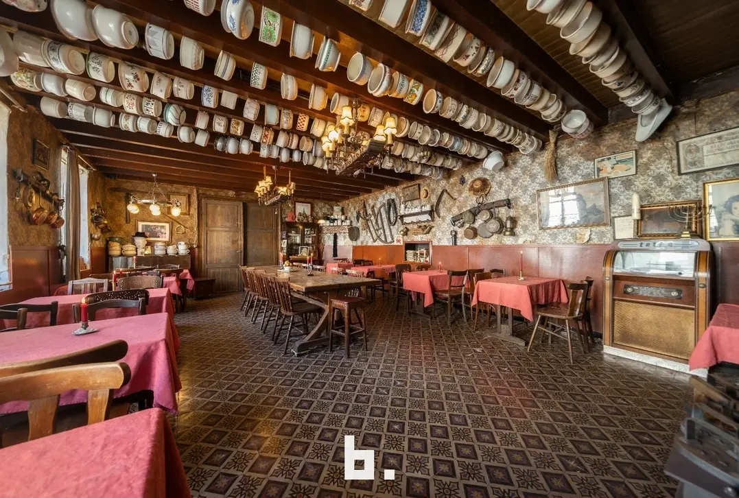 De indeling is als volgt: BENEDENVERDIEPING: café met bar, eet-/feestzaal (nog gefungeerd als gemeentehuis), keuken, ruime kelder, binnenterras, toiletten, bijgebouw/bakhuis. VOUTE: momenteel gebruikt als leefruimte/slaapkamer. ZOLDERVERDIEPING: grote te renoveren ruimte met mogelijkheid tot het creëren van diverse kamers, via een klein niveauverschil is er nog een ruimte met mogelijkheid tot 2 kamers.