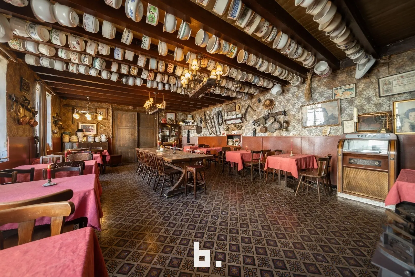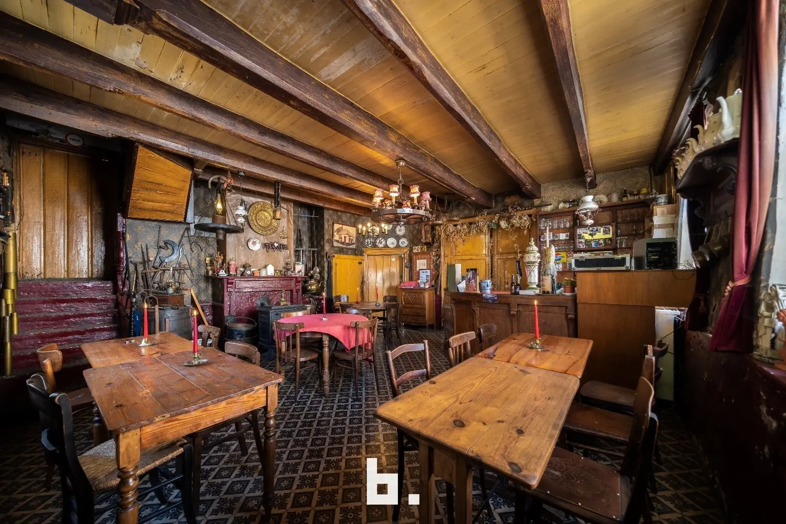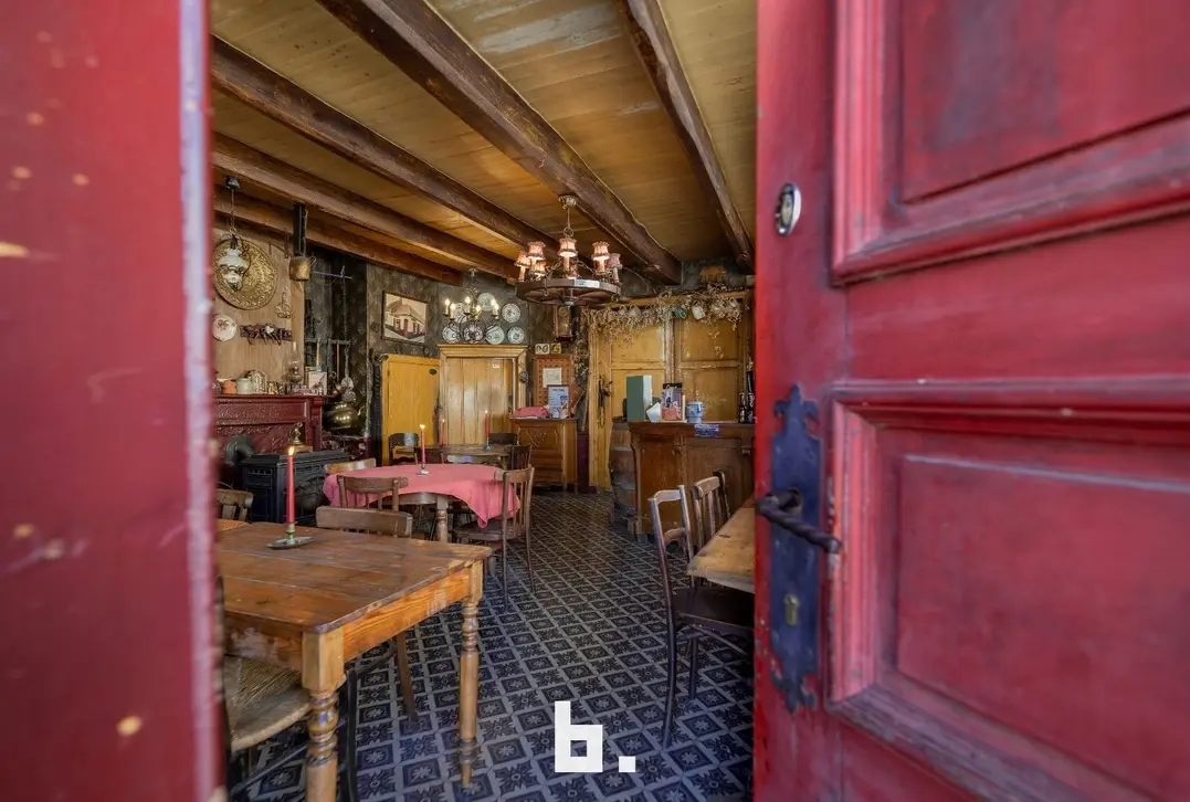 De indeling is als volgt: BENEDENVERDIEPING: café met bar, eet-/feestzaal (nog gefungeerd als gemeentehuis), keuken, ruime kelder, binnenterras, toiletten, bijgebouw/bakhuis. VOUTE: momenteel gebruikt als leefruimte/slaapkamer. ZOLDERVERDIEPING: grote te renoveren ruimte met mogelijkheid tot het creëren van diverse kamers, via een klein niveauverschil is er nog een ruimte met mogelijkheid tot 2 kamers.