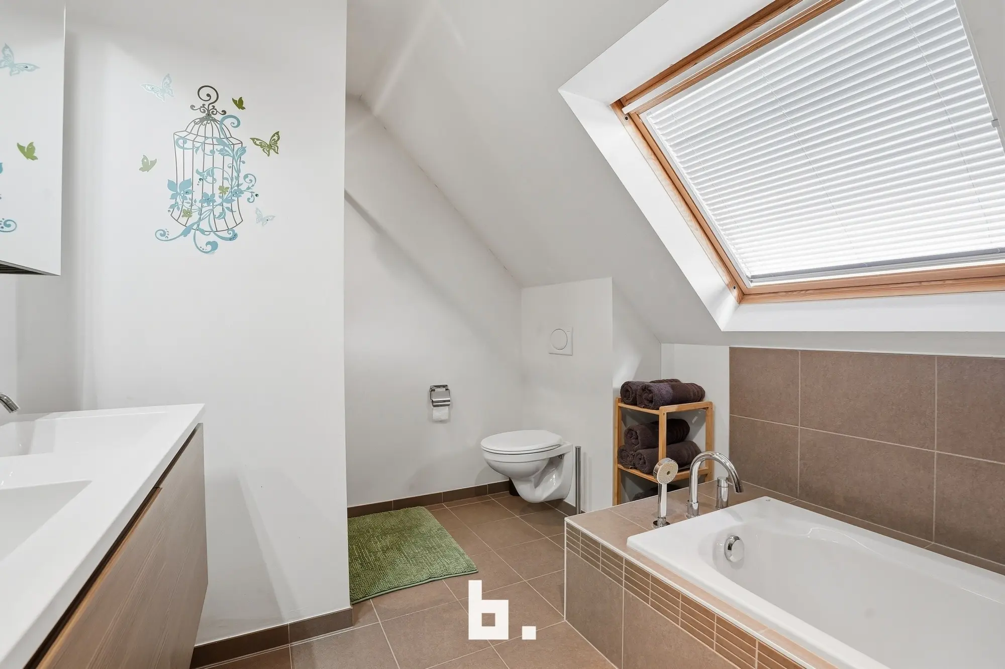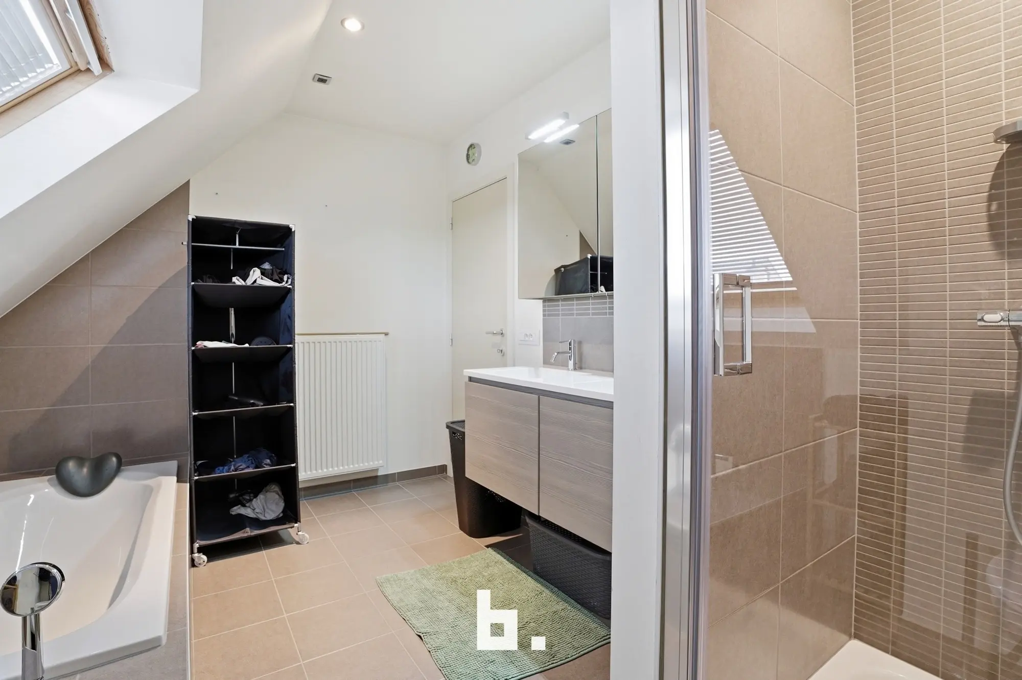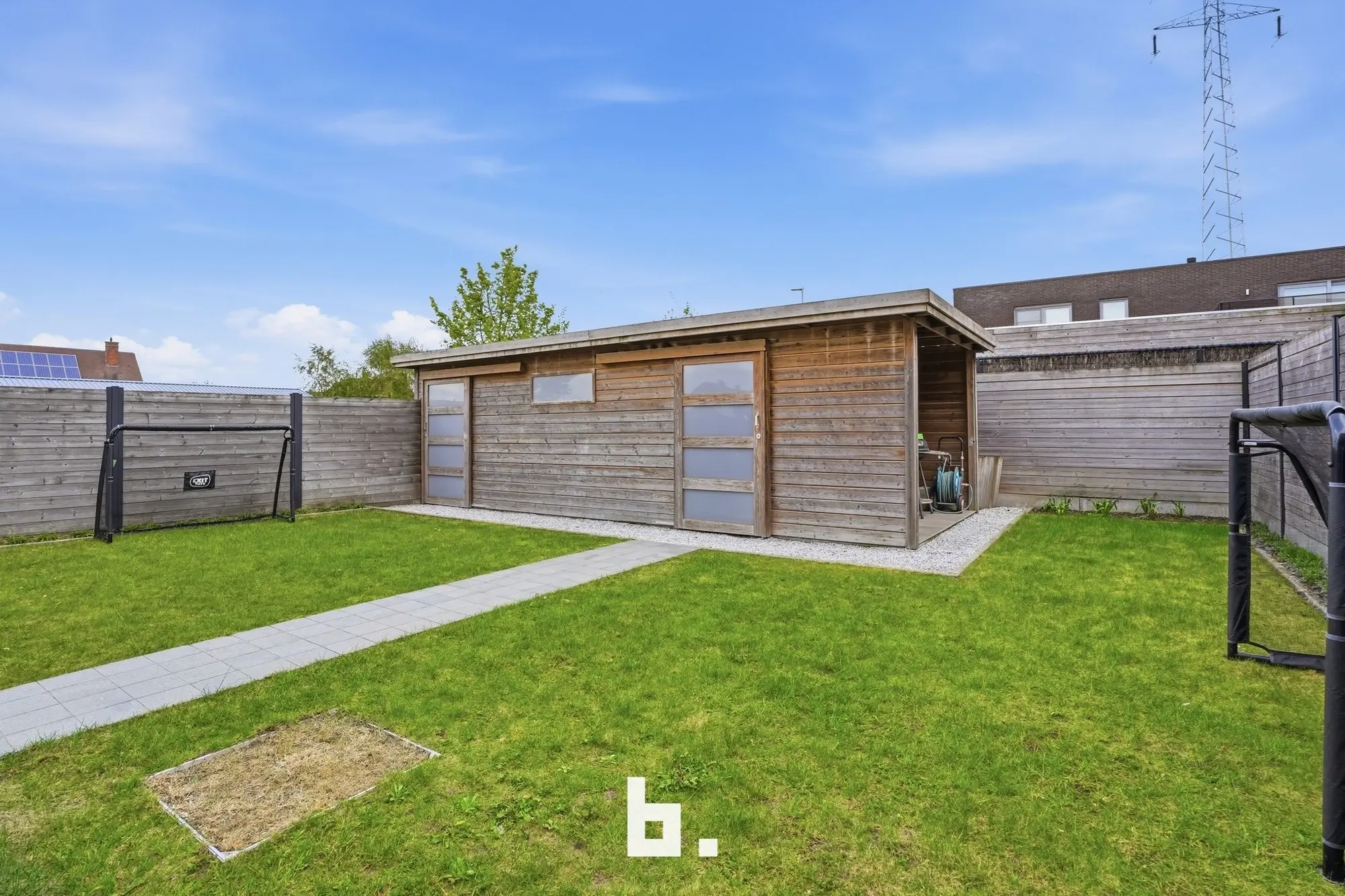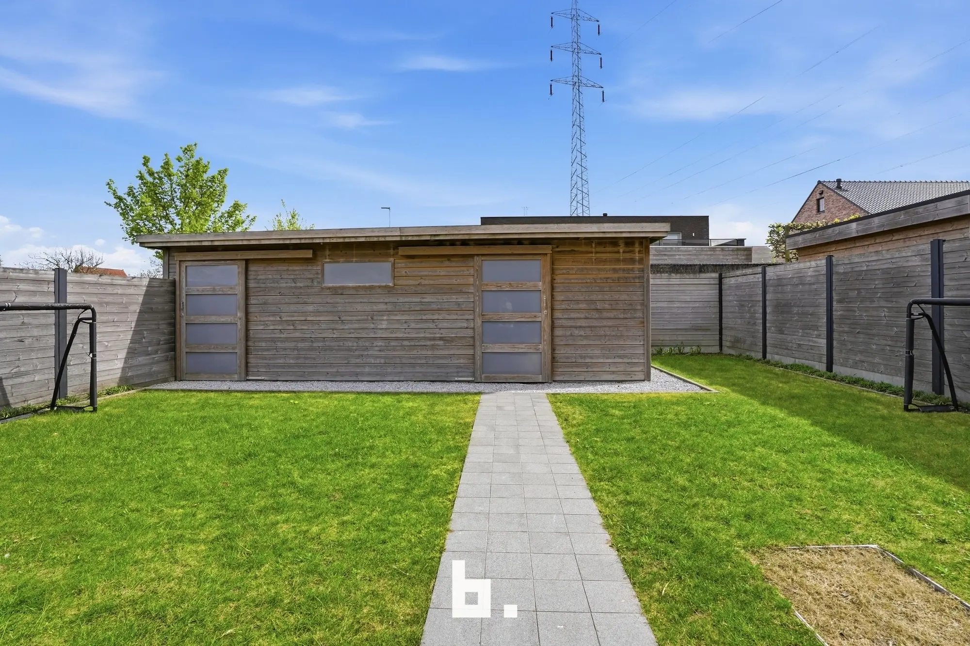 Via de inkomhal met ingemaakte kast en gastentoilet komt u door in de woonkamer. De woonkamer heeft zeer veel aangenaam natuurlijk lichtinval. Aansluitend hebben we de halfopen keuken met alle nodige toestellen. Via de keuken komen we in de ruime garage waar ook alle technieken voorzien zijn. En handig als extra bergruimte. Op de eerste verdieping vinden we een ruime nachthal, drie volwaardige slaapkamers en de badkamer. De zolder met valtrap is handig als extra bergruimte. Buiten in de tuin genieten we van het zonnige terras. Extra garage/tuinhuis achteraan de tuin met inrit via de zijstraat.