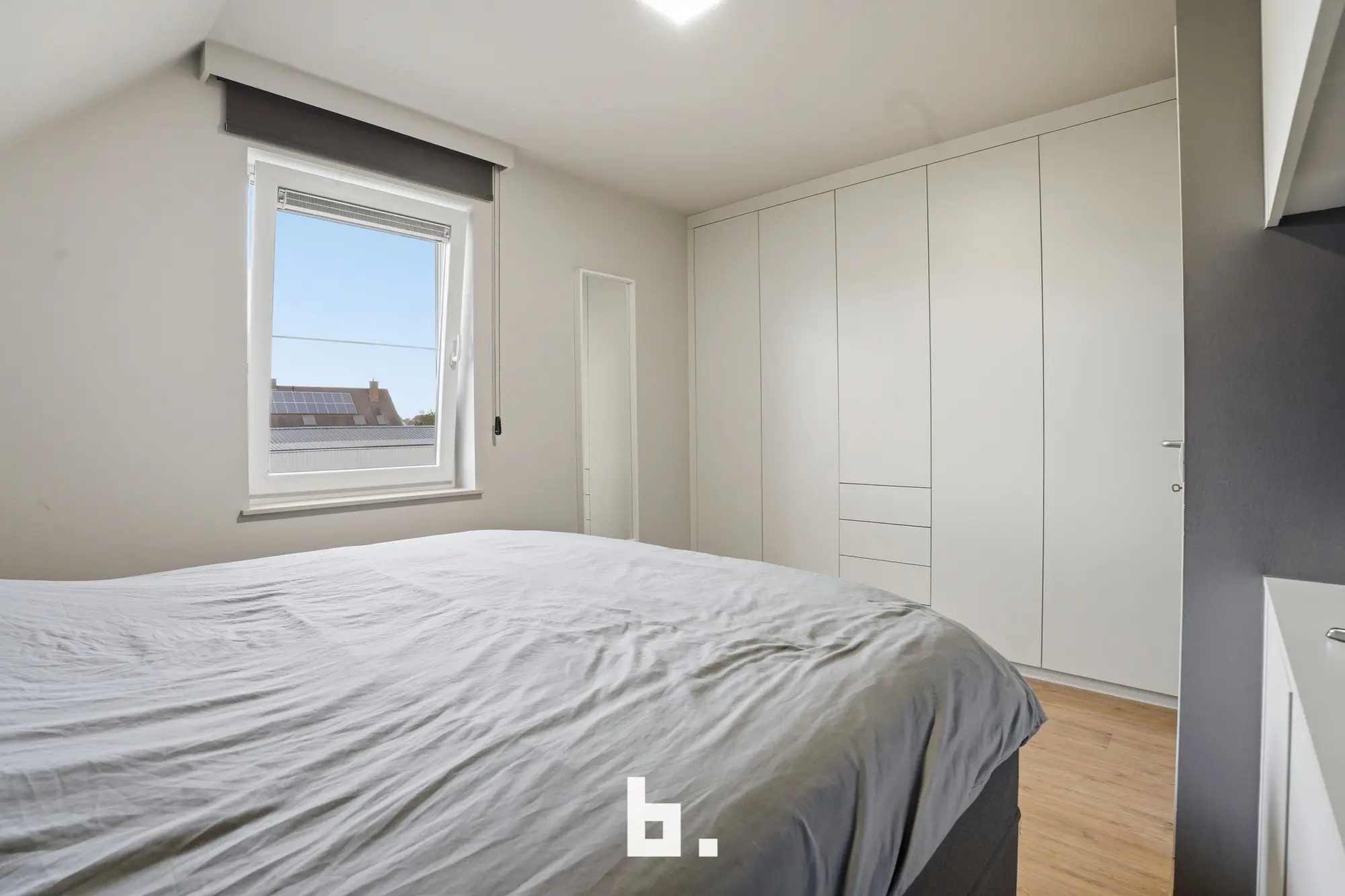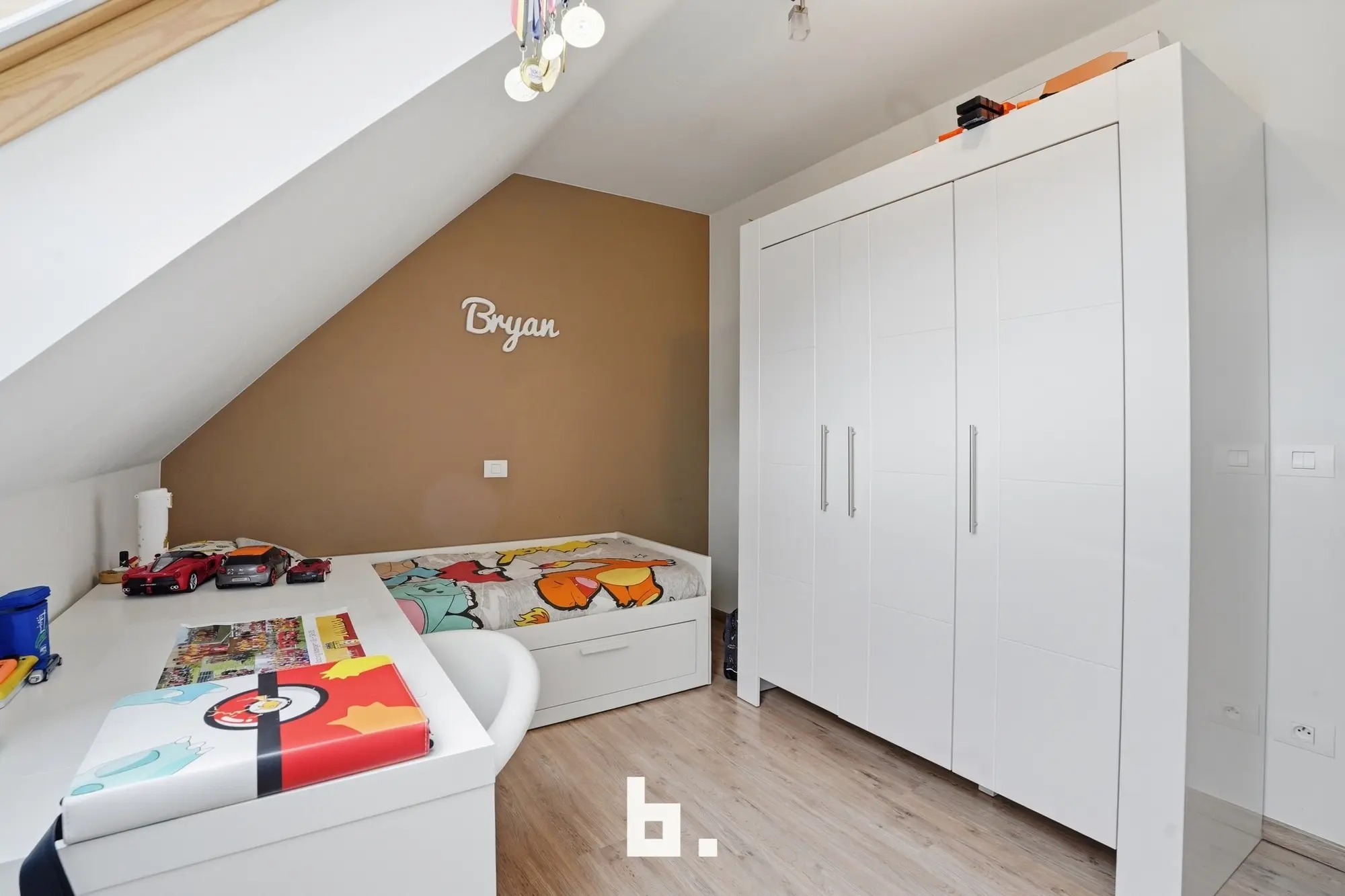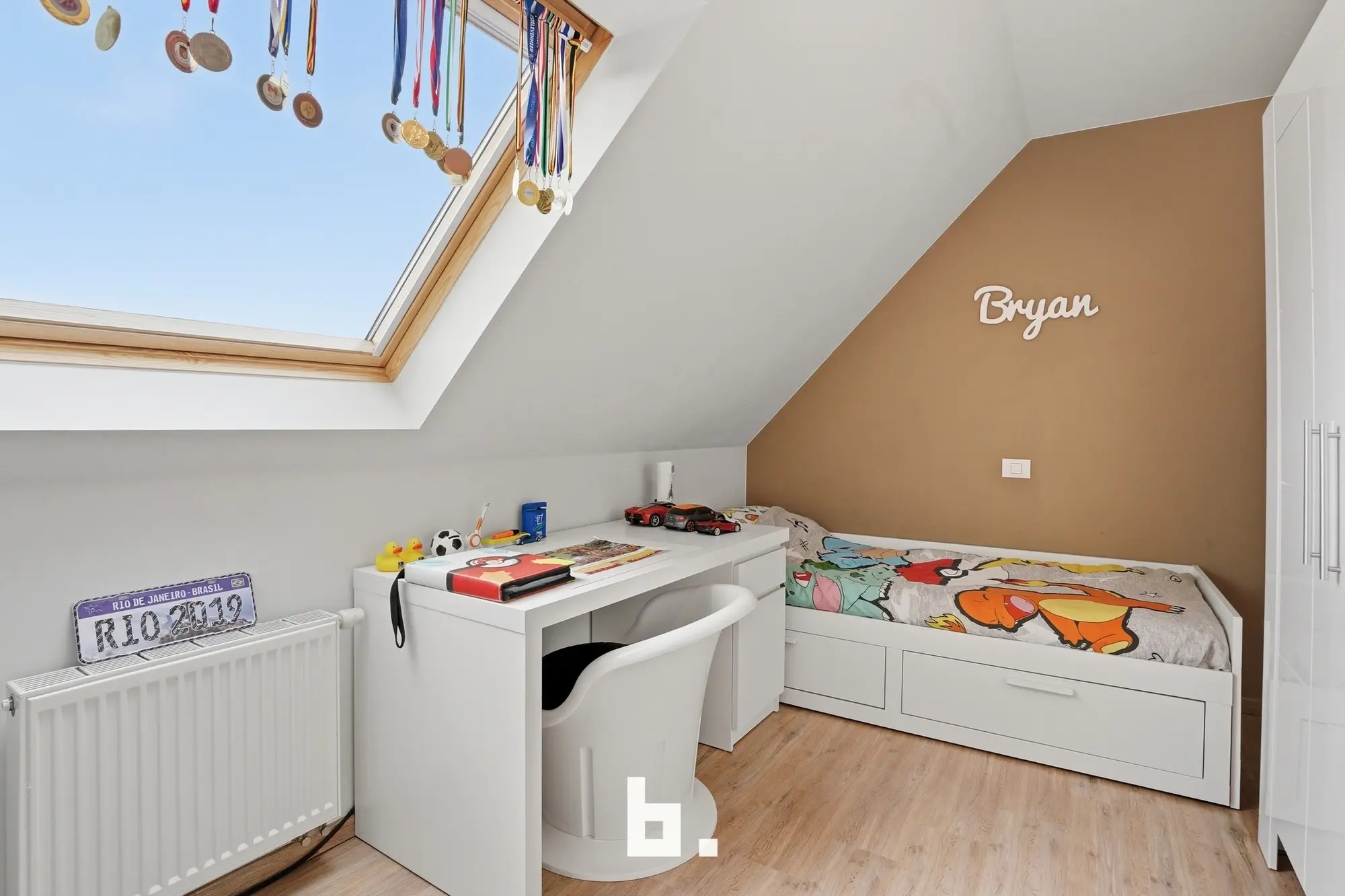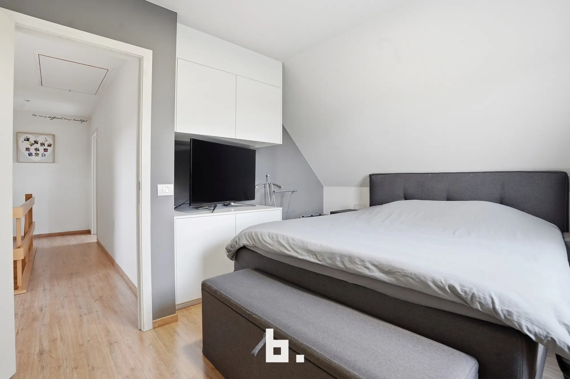 Via de inkomhal met ingemaakte kast en gastentoilet komt u door in de woonkamer. De woonkamer heeft zeer veel aangenaam natuurlijk lichtinval. Aansluitend hebben we de halfopen keuken met alle nodige toestellen. Via de keuken komen we in de ruime garage waar ook alle technieken voorzien zijn. En handig als extra bergruimte. Op de eerste verdieping vinden we een ruime nachthal, drie volwaardige slaapkamers en de badkamer. De zolder met valtrap is handig als extra bergruimte. Buiten in de tuin genieten we van het zonnige terras. Extra garage/tuinhuis achteraan de tuin met inrit via de zijstraat.