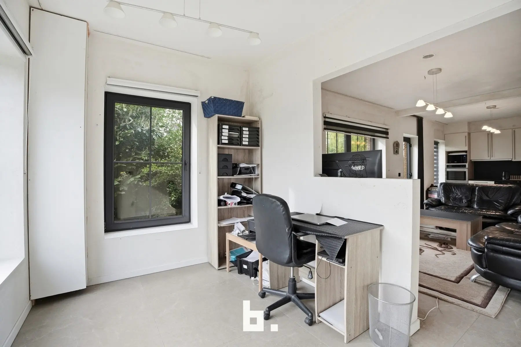 Via de inkomhal met vestiaire en gastentoilet komt u in de lichtrijke en royale leefruimte met eetplaats en zithoek met zicht op de tuin. De keuken is nog volledig naar eigen smaak in te richten. Daarnaast beschikt de woning over een polyvalente ruimte (momenteel zithoek met keuken), maar kan dienen als kantoor, praktijk met kitchenette of hobbykamer. Praktisch te gebruiken door een aparte deur naar de zijkant van de woning. Verder een douchekamer met toilet, een wasplaats en een inpandige garage. De zonnige groene tuin en de ruime kelder vormen een extra troef.