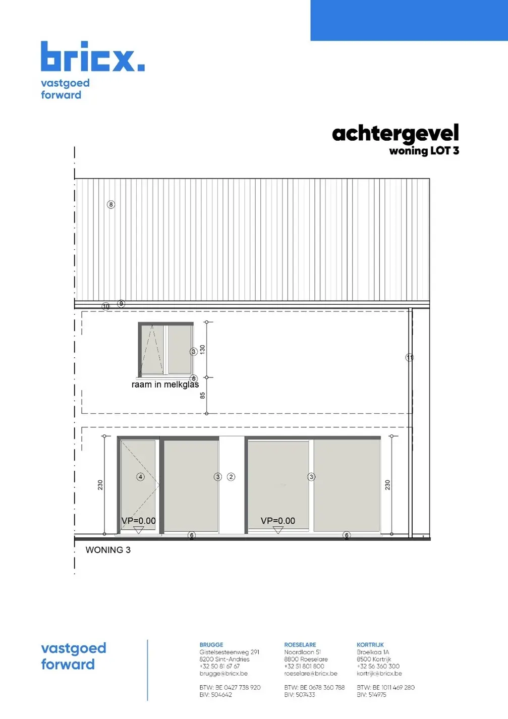 De strakke architectuur combineert een wit-grijze gevelsteen met zwarte/antraciet ramen in pvc en een zwart hellend dak. Alle woningen zijn voorzien van superisolerend glas, ventilatiesysteem D en een regenwaterput van 7.500L.
