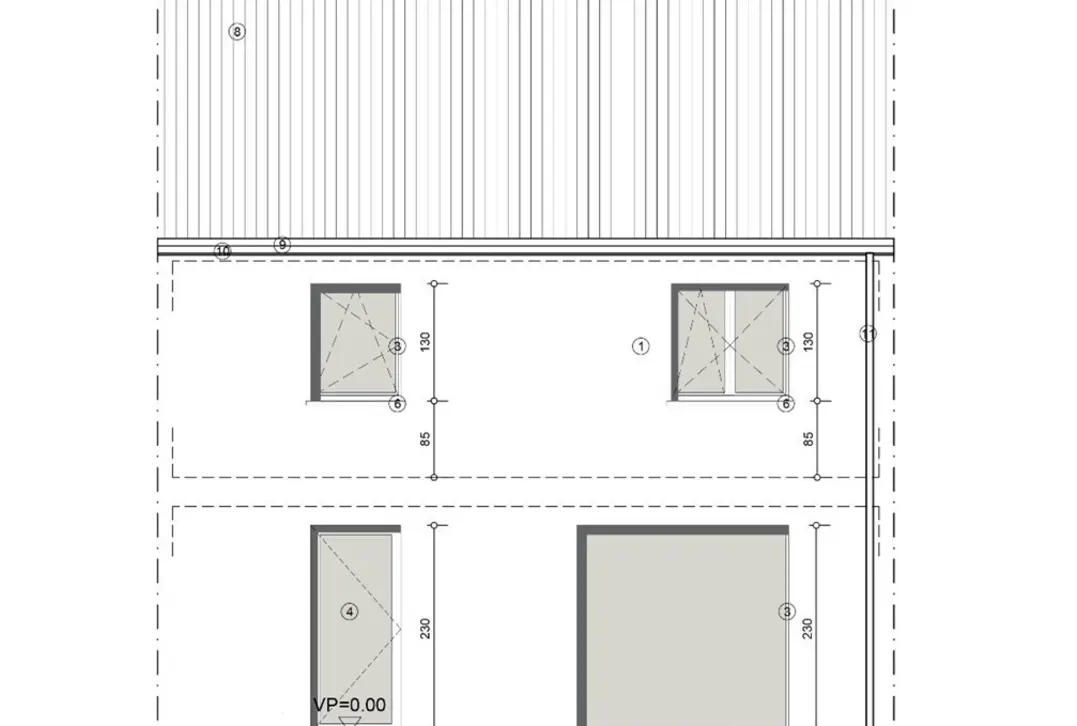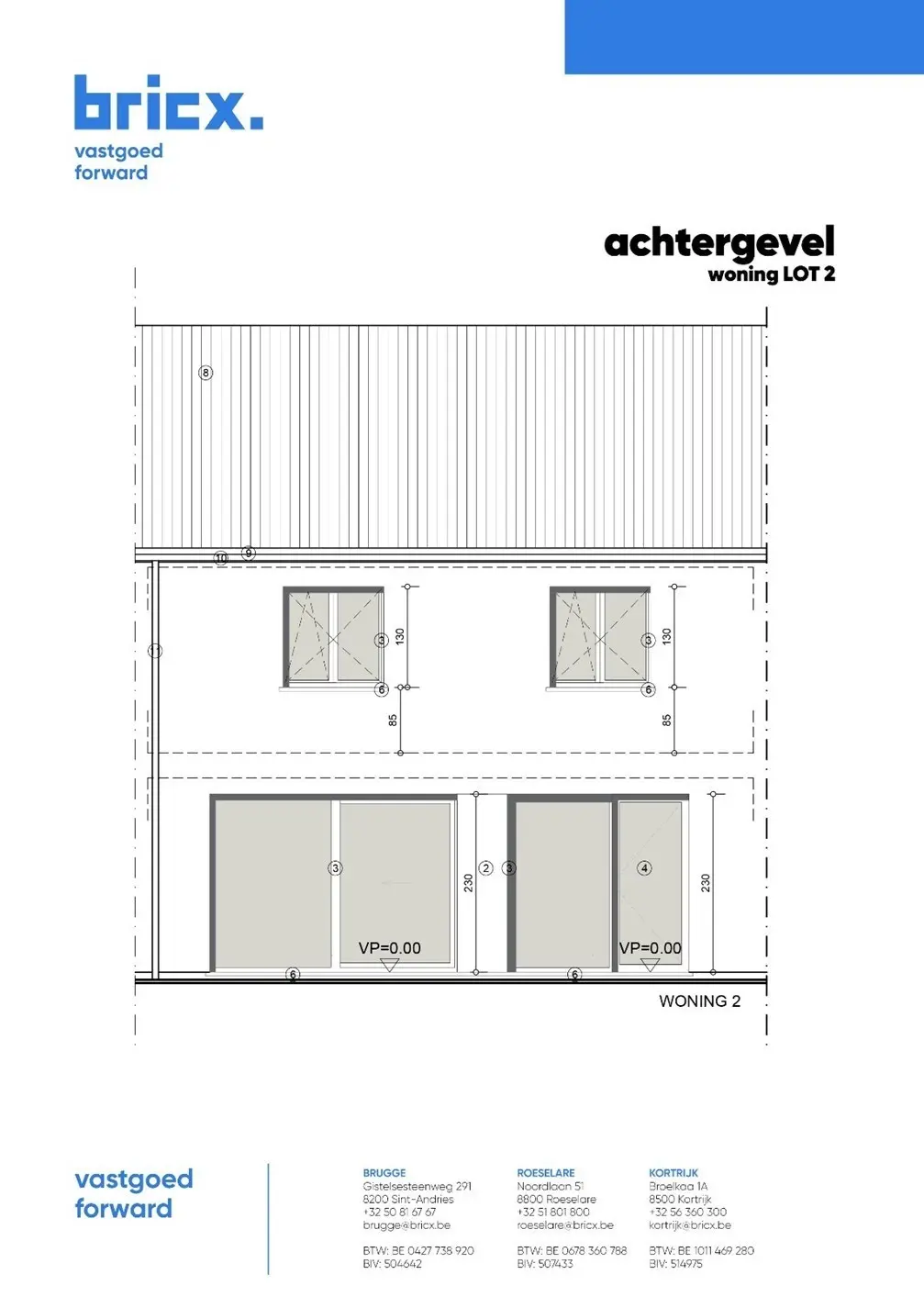 De strakke architectuur combineert een wit-grijze gevelsteen met zwarte/antraciet ramen in pvc en een zwart hellend dak. Alle woningen zijn voorzien van superisolerend glas, ventilatiesysteem D en een regenwaterput van 7.500L.