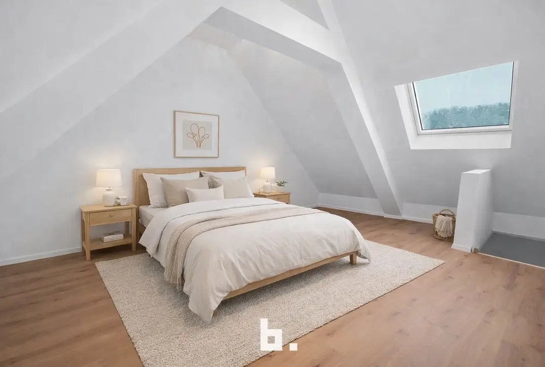 Via een vaste open trap bereikt u de zolderverdieping, waar een ruime polyvalente ruimte werd ingericht. Deze ruimte leent zich perfect als derde slaapkamer, bureau of hobbyruimte.