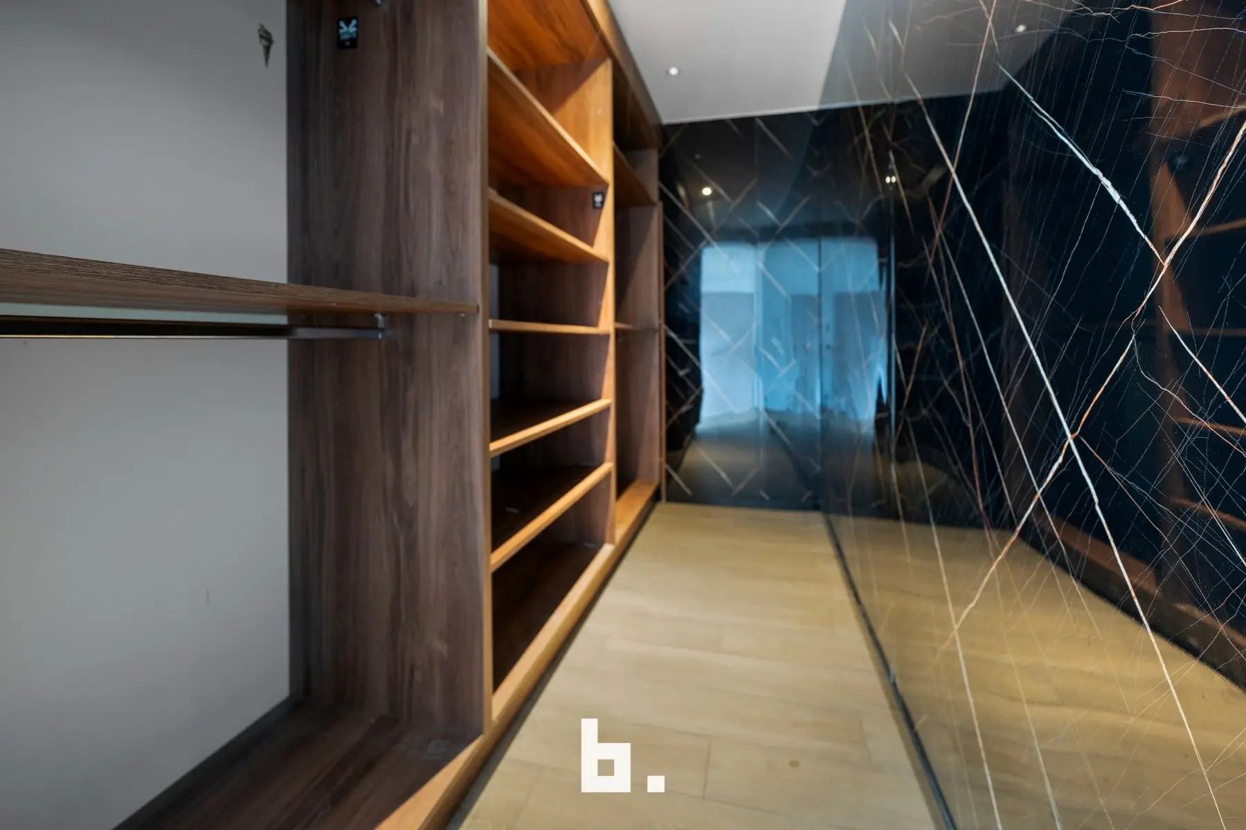 Als we terug op het gelijkvloers zijn komen we via de dubbele deur aan de keuken uit in de tweede gang met tweede badkamer, tweede toilet en tweede wasplaats. Verder hebben we de ruime inpandige garage. In die gang komen we via de trap boven in een tweede keuken met leefruimte, daarnaast een masterbedroom met dressing en een tweede dakterras achteraan de woning.
