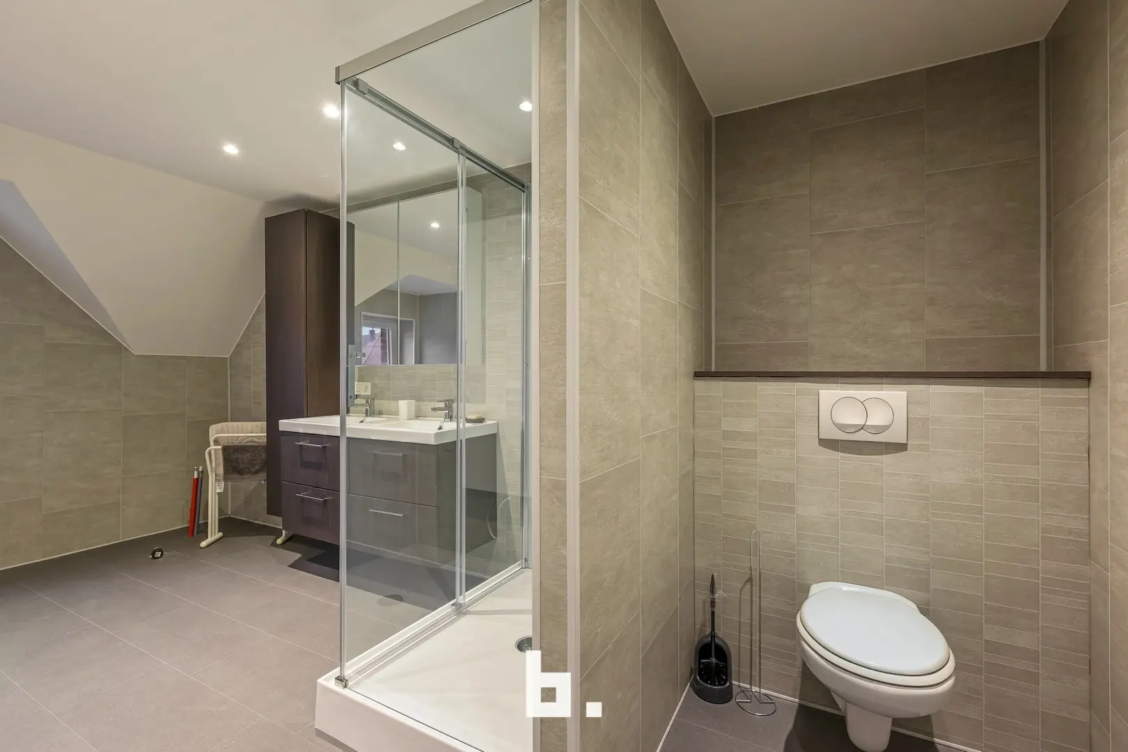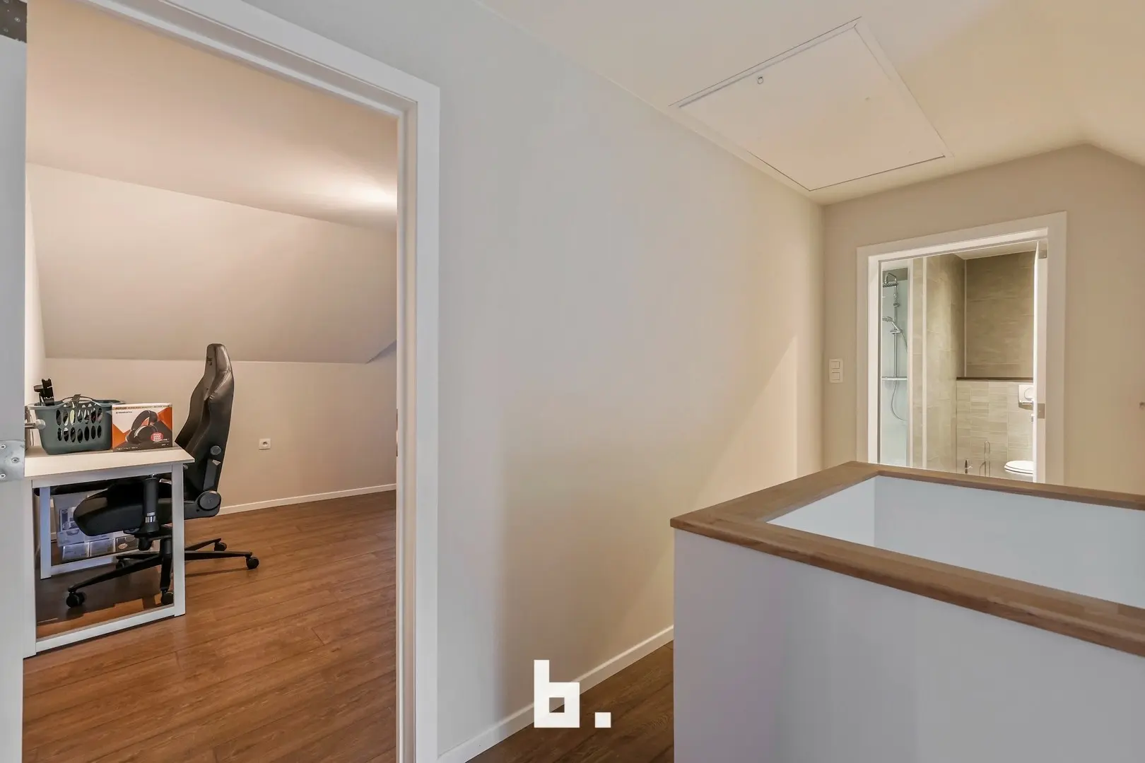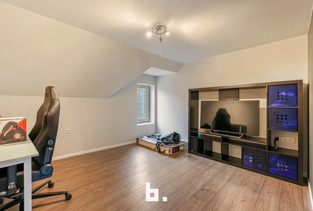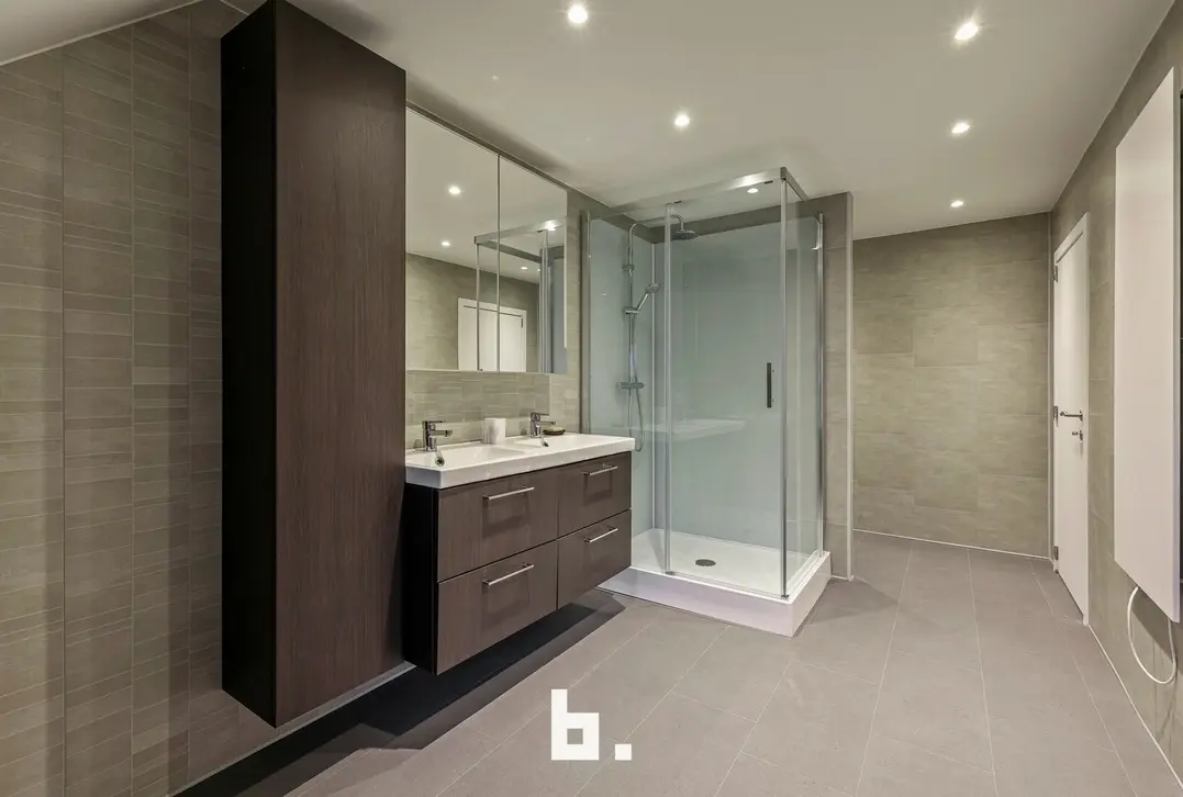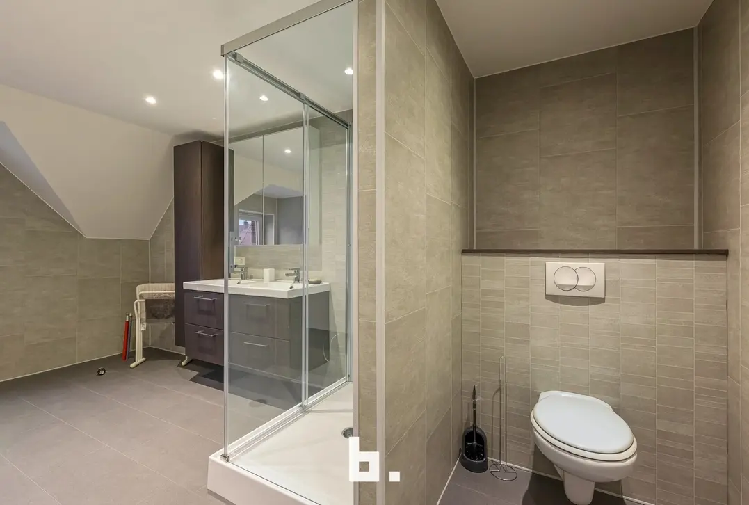 Op de bovenverdieping werd de badkamer stijlvol ingericht met een douche en een lavabomeubel. Verder beschikt de woning over twee volwaardige slaapkamers, perfect als hoofd- en logeerkamer of bureauruimte.