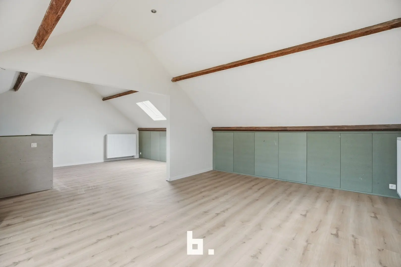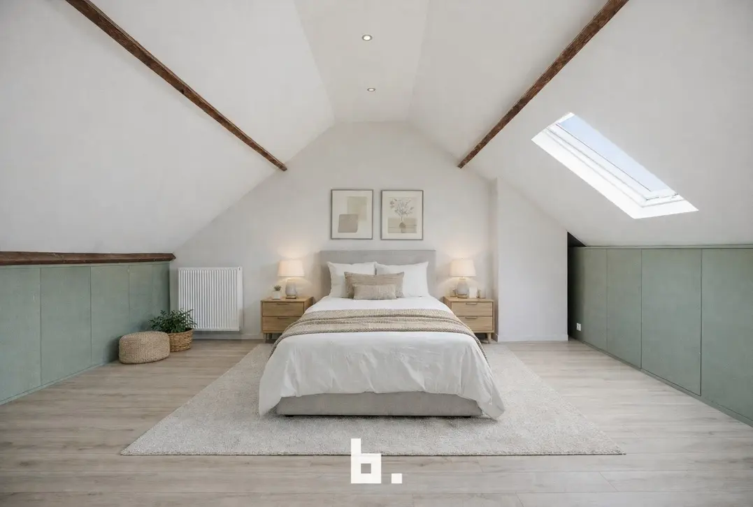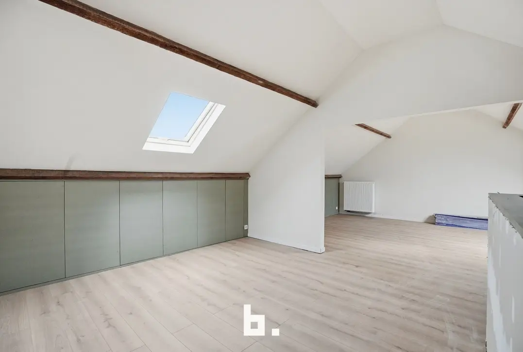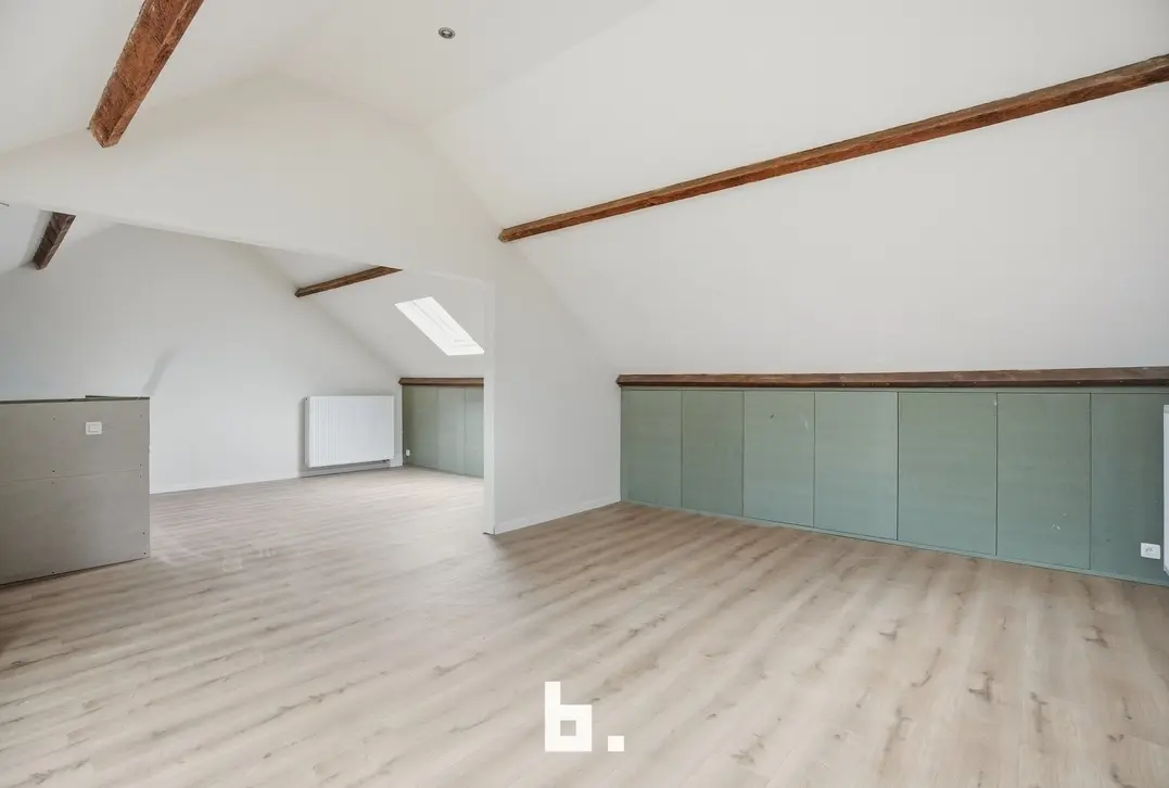 Op de eerste verdieping vindt u de nachthal, drie slaapkamers en een badkamer uitgerust met ligbad, douche , toilet en lavabo – ideaal voor een gezin of wie extra kamers wenst voor bureau of hobbyruimte. De afgewerkte zolder kan gebruikt worden als hobbyruimte of zeer grote slaapkamer(s).