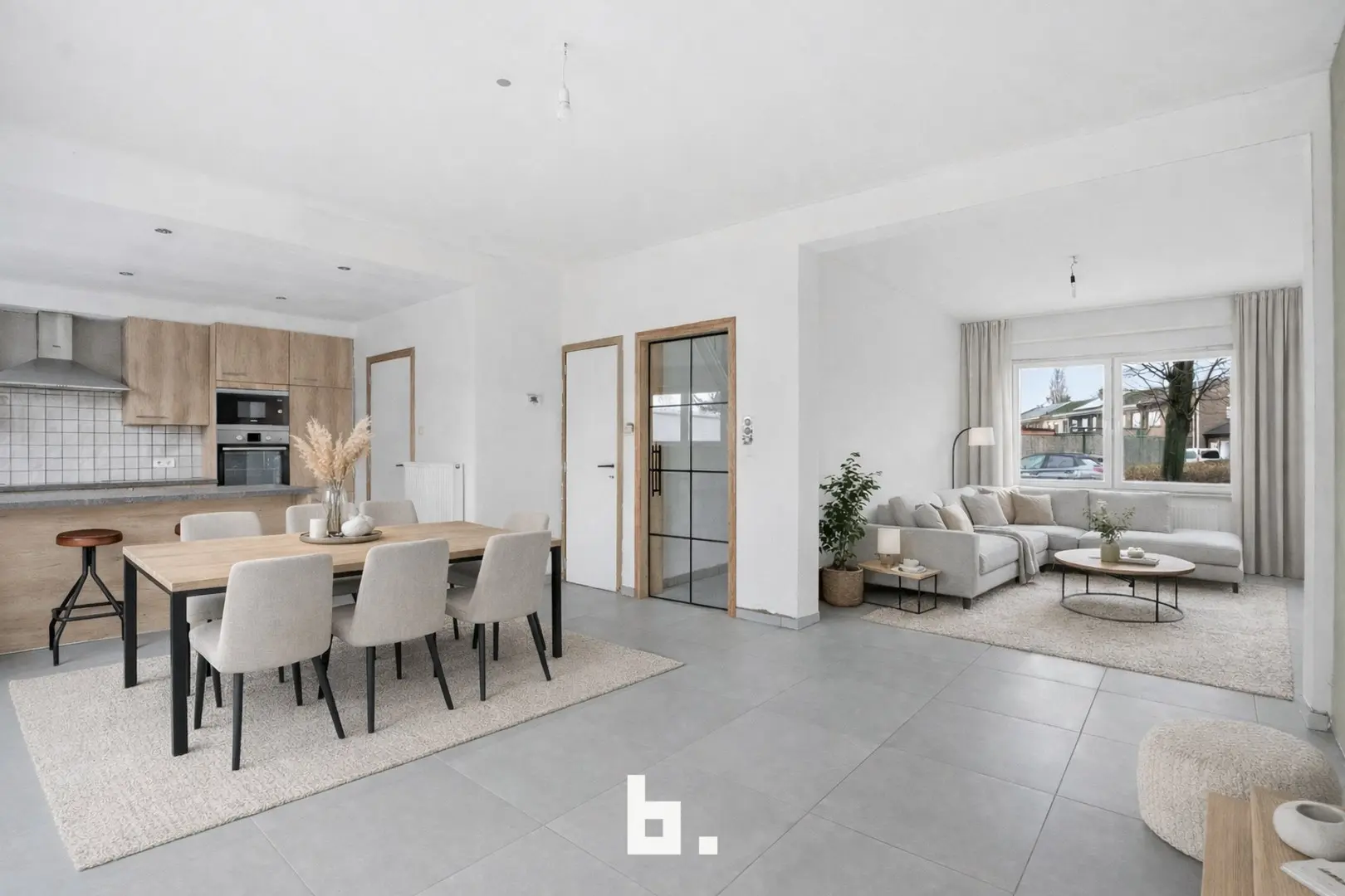 Bij het betreden van de woning komt u in de inkomhal met gastentoilet, die toegang geeft tot de ruime en lichtrijke leefruimte. Aansluitend bevindt zich de open keuken met verbinding naar de garage.