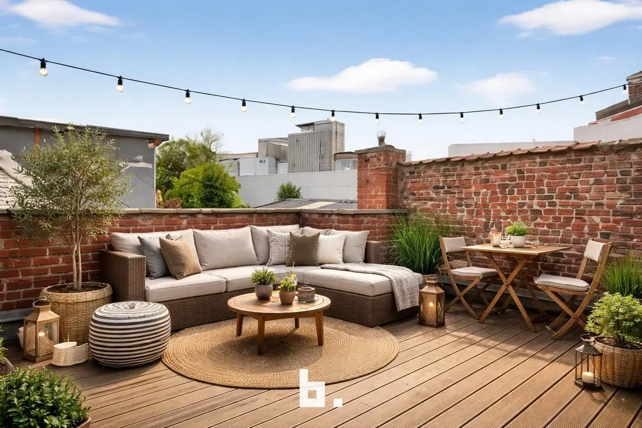 Buiten vind je een stadskoer, een extra berging, een technische ruimte en op de verdieping een ruim terras waar je heerlijk kan genieten van de zon. De laatste zes foto's geven een idee hoe deze woning kan worden ingericht.