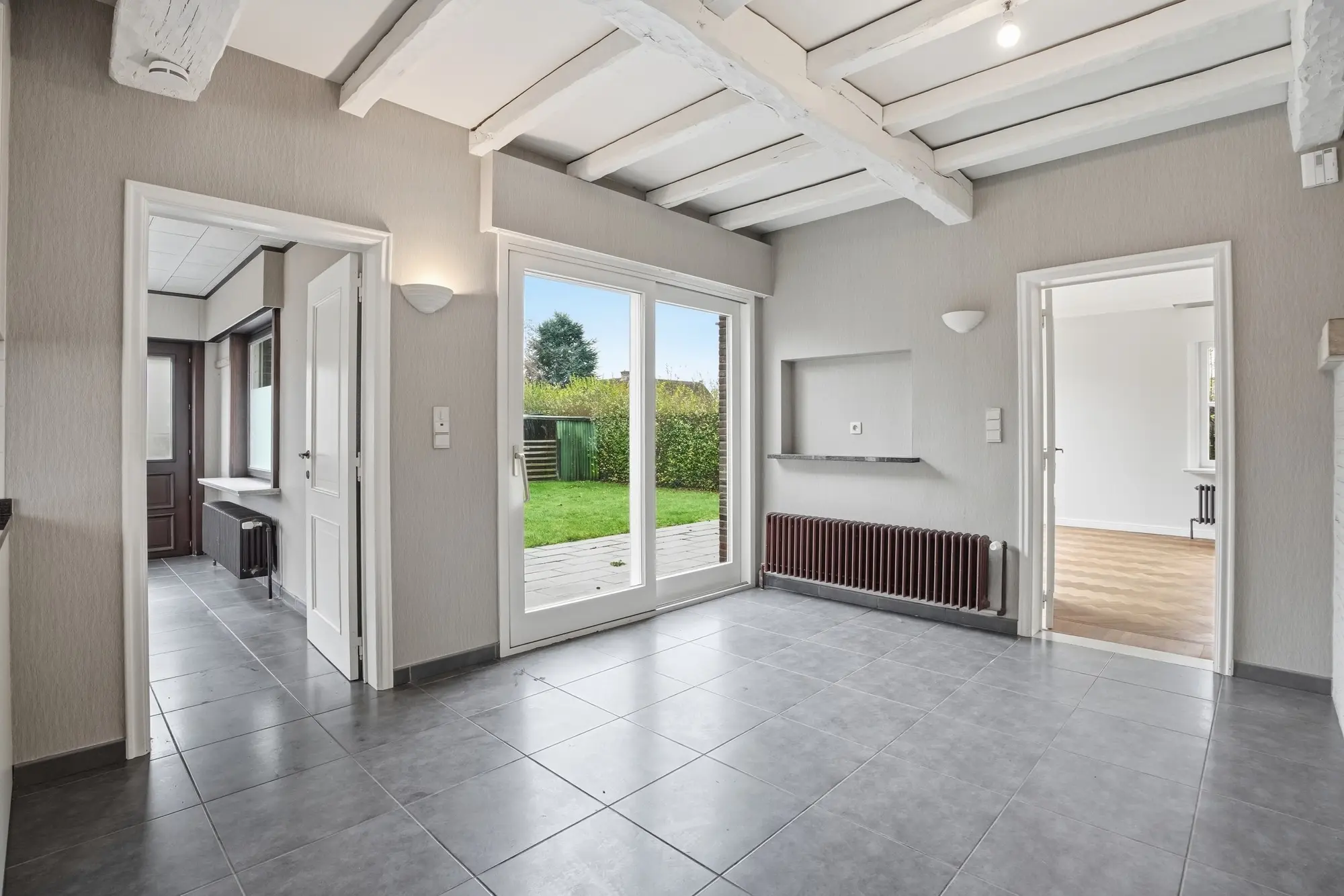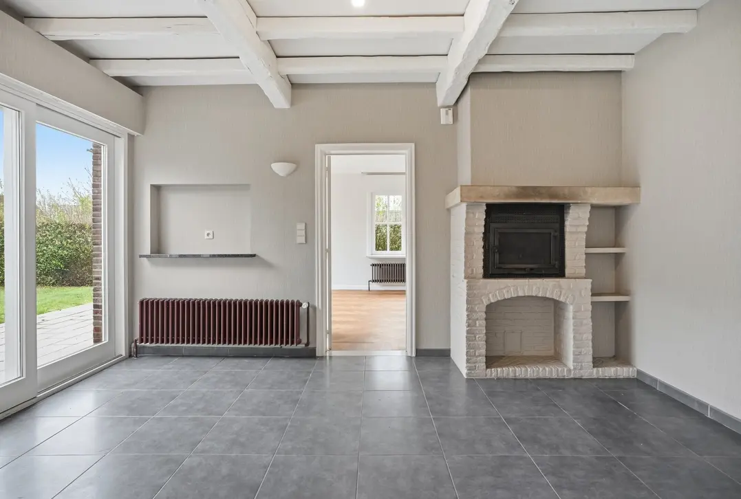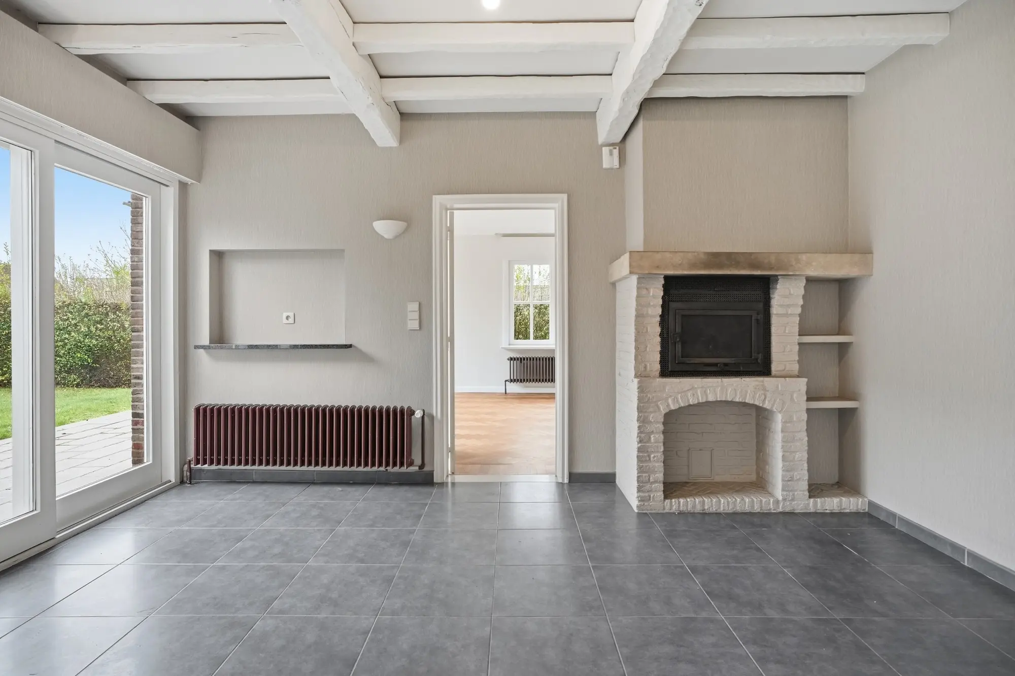 Via de statische inkomhal met gastentoilet kom je de woning binnen. Verder kom je in de leefruimte met open haard, mozaïek parket en zicht op de tuin. Aansluitend heb je een ruime leefkeuken met een extra houten haard en ook veel natuurlijk lichtinval. Achteraan de keuken is een bureel wat ook dienst kan doen als hobbykamer of slaapkamer. Naast de keuken heb je nog een berging en toegang tot de kelder, waar de verwarming en technieken aanwezig zijn en ruimte voor wijnliefhebbers.