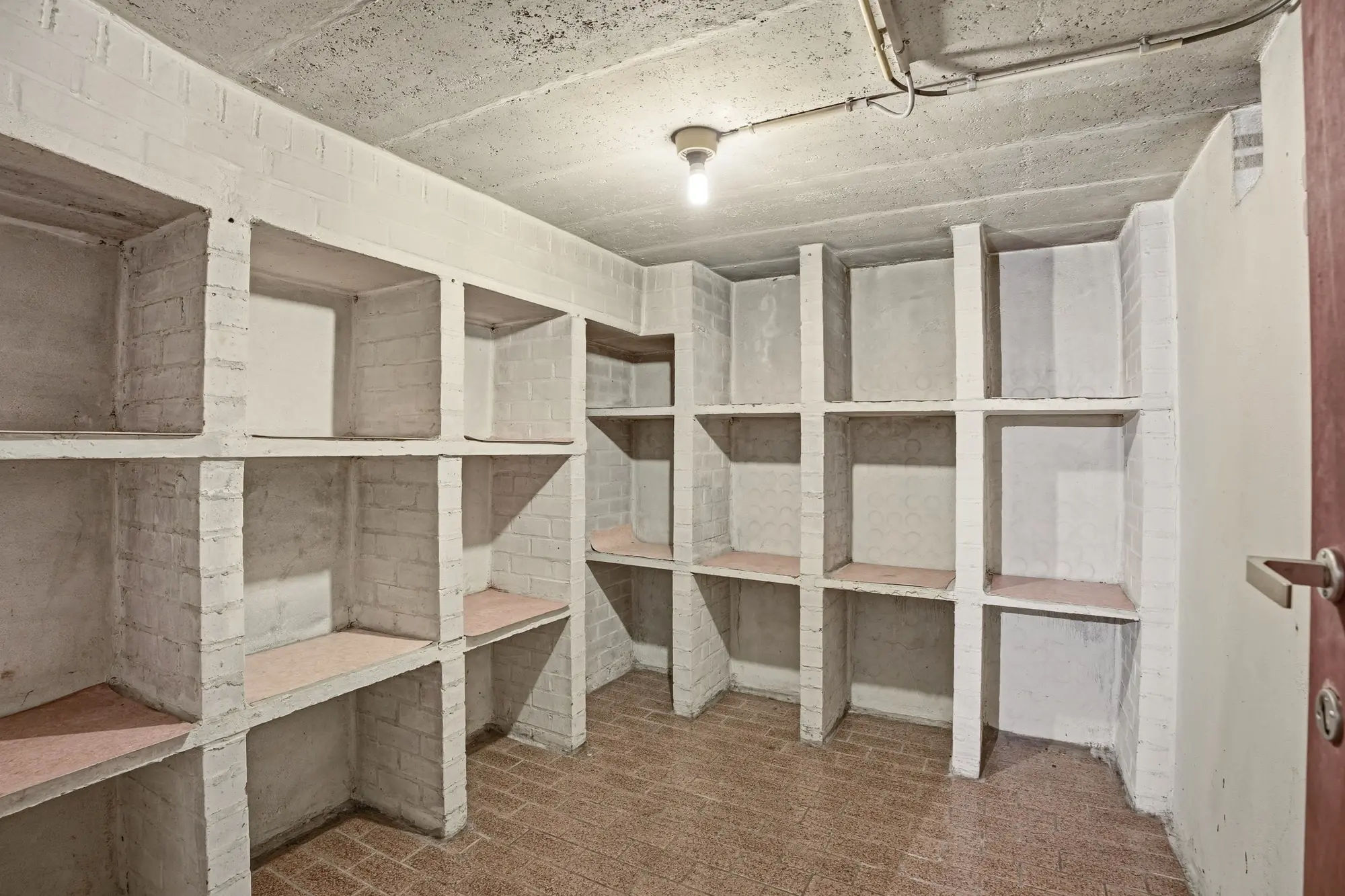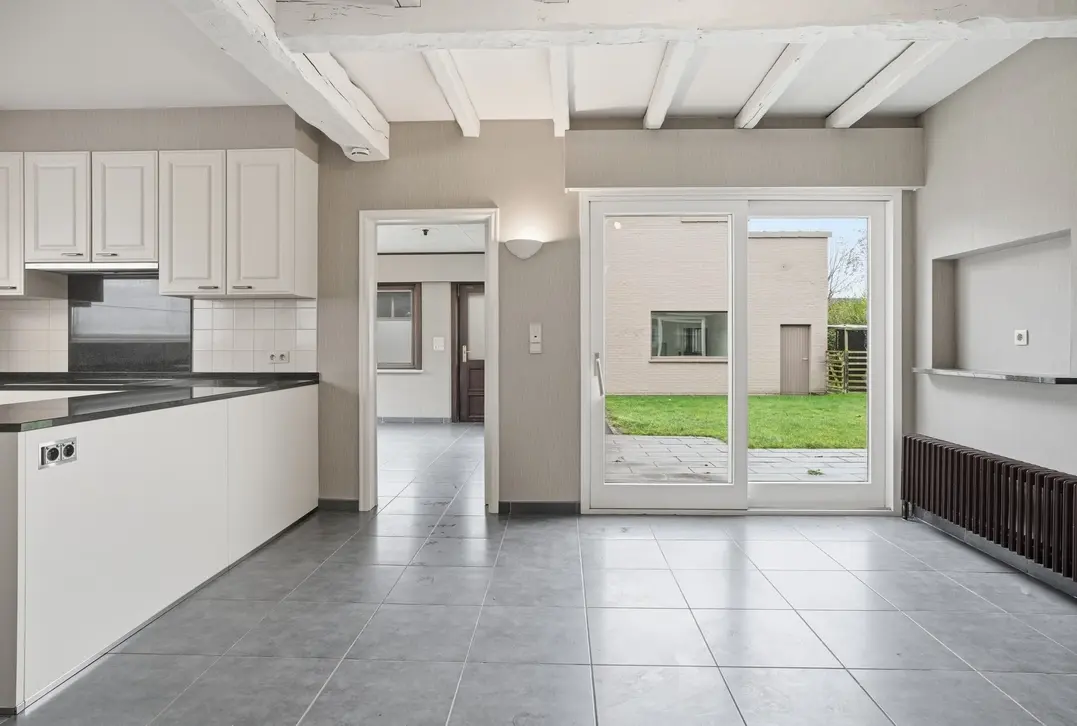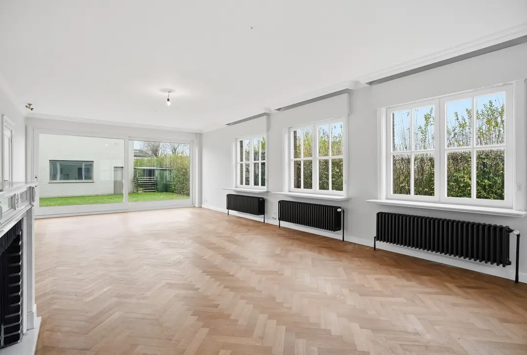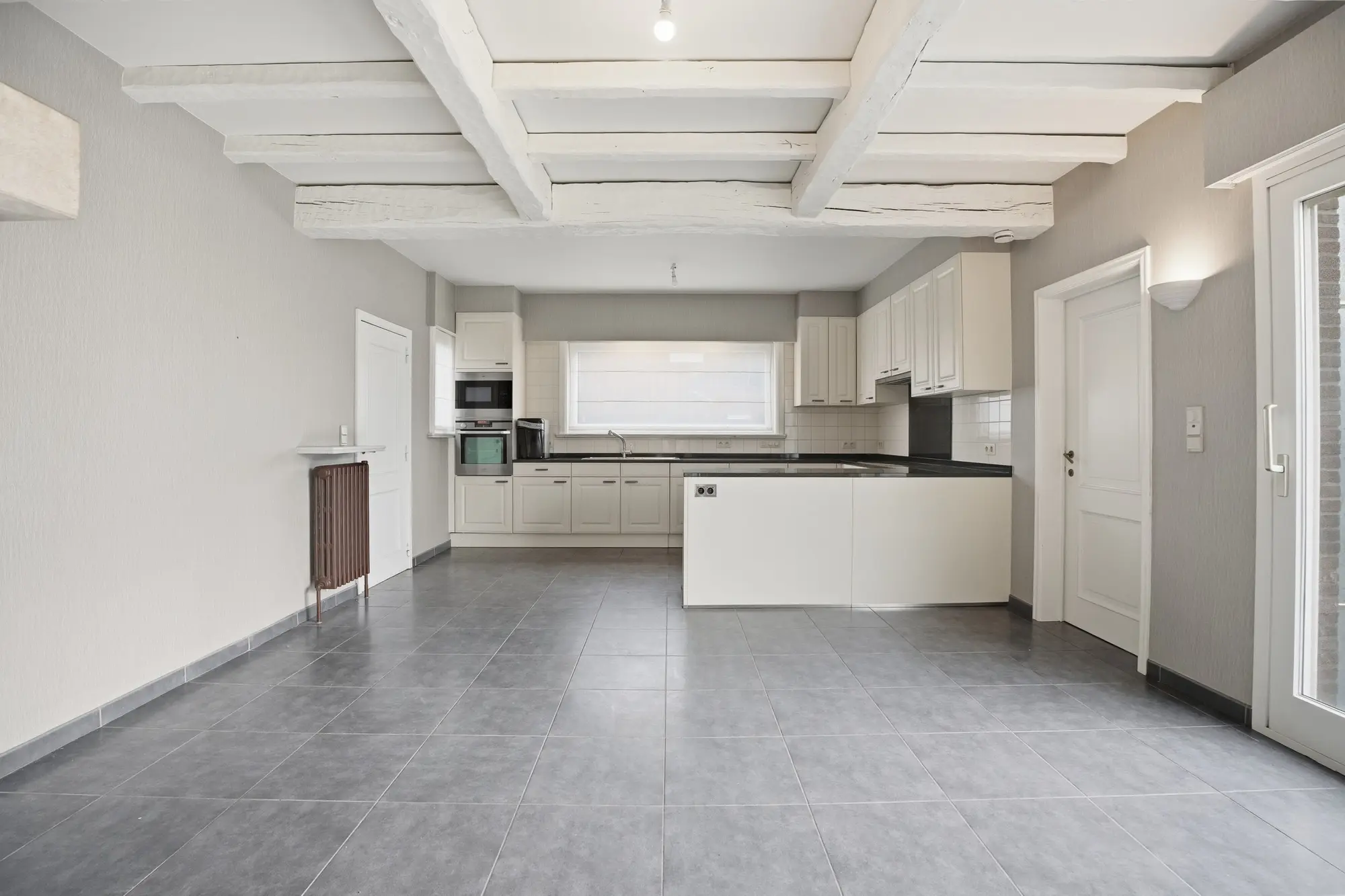Via de statische inkomhal met gastentoilet kom je de woning binnen. Verder kom je in de leefruimte met open haard, mozaïek parket en zicht op de tuin. Aansluitend heb je een ruime leefkeuken met een extra houten haard en ook veel natuurlijk lichtinval. Achteraan de keuken is een bureel wat ook dienst kan doen als hobbykamer of slaapkamer. Naast de keuken heb je nog een berging en toegang tot de kelder, waar de verwarming en technieken aanwezig zijn en ruimte voor wijnliefhebbers.