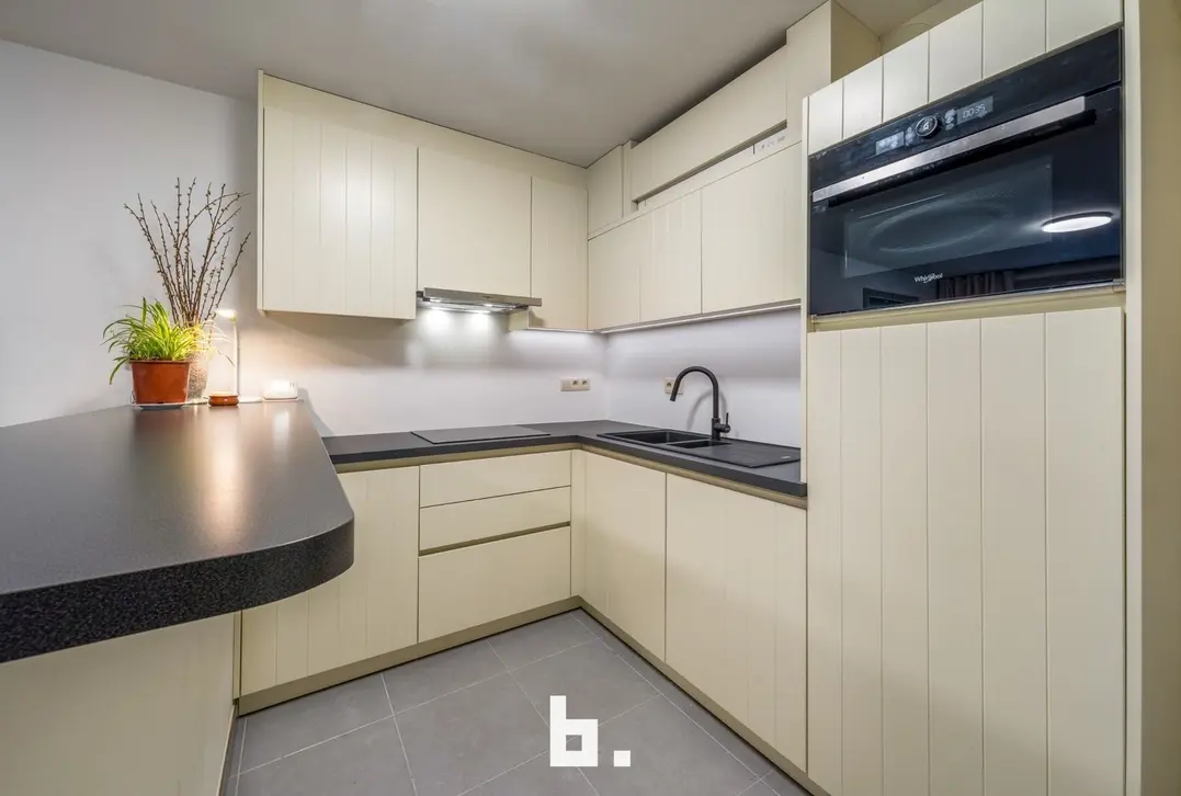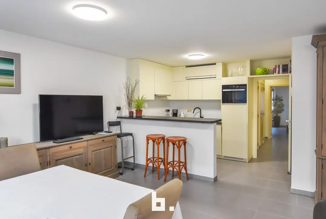 Op de eerste verdieping bevindt zich een mooi en lichtrijk appartement met een ruime living en open keuken. Aan de straatzijde is er een klein terras. Verder beschikt deze verdieping over een aparte berging, een apart toilet en een slaapkamer met aansluitend een open badkamer, uitgerust met een bad en inloopdouche. Achteraan is er bovendien een nog in te richten binnenterras.