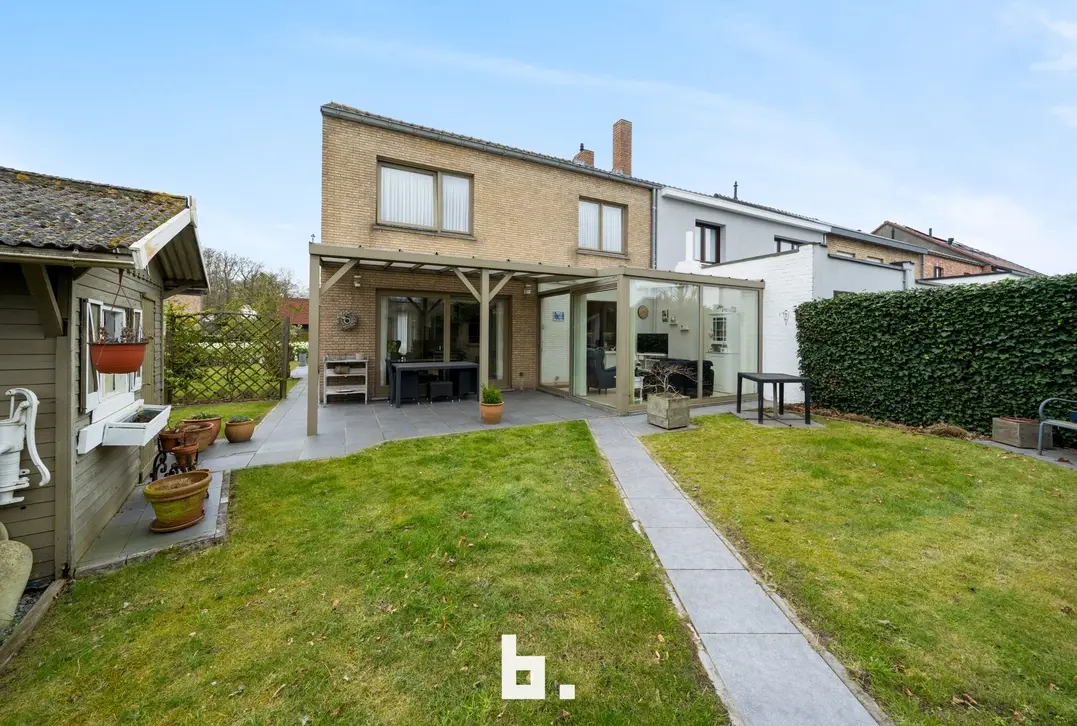 Deze halfopen bebouwing is zéér goed gelegen op een mooi perceel van 389 m². Heerlijk rustige ligging nabij supermarkten, winkels en handelszaken, scholen, openbaar vervoer, Expresweg ... en slechts een paar kilometer verwijderd van centrum Brugge. De indeling is als volgt: BENEDENVERDIEPING: ruime inkomhal met vestiairekast, gastentoilet, berging (aansluiting wasmachine/droogkast), lichtrijke woonkamer met zicht op de tuin, aparte ingerichte keuken (inductiekookplaat, dampkap, microgolfoven, oven, vaatwasser en dubbele spoelbak) met eetmogelijkheid en aanpalende veranda. BOVENVERDIEPING: 3 slaapkamers, badkamer (douche, wastafelmeubel en toilet). ZOLDERVERDIEPING: grote opbergzolder met uitschuifbare trap. BUITENOMGEVING: zijdelingse oprit naar garage en berging, gezellige tuin met terras achteraan.