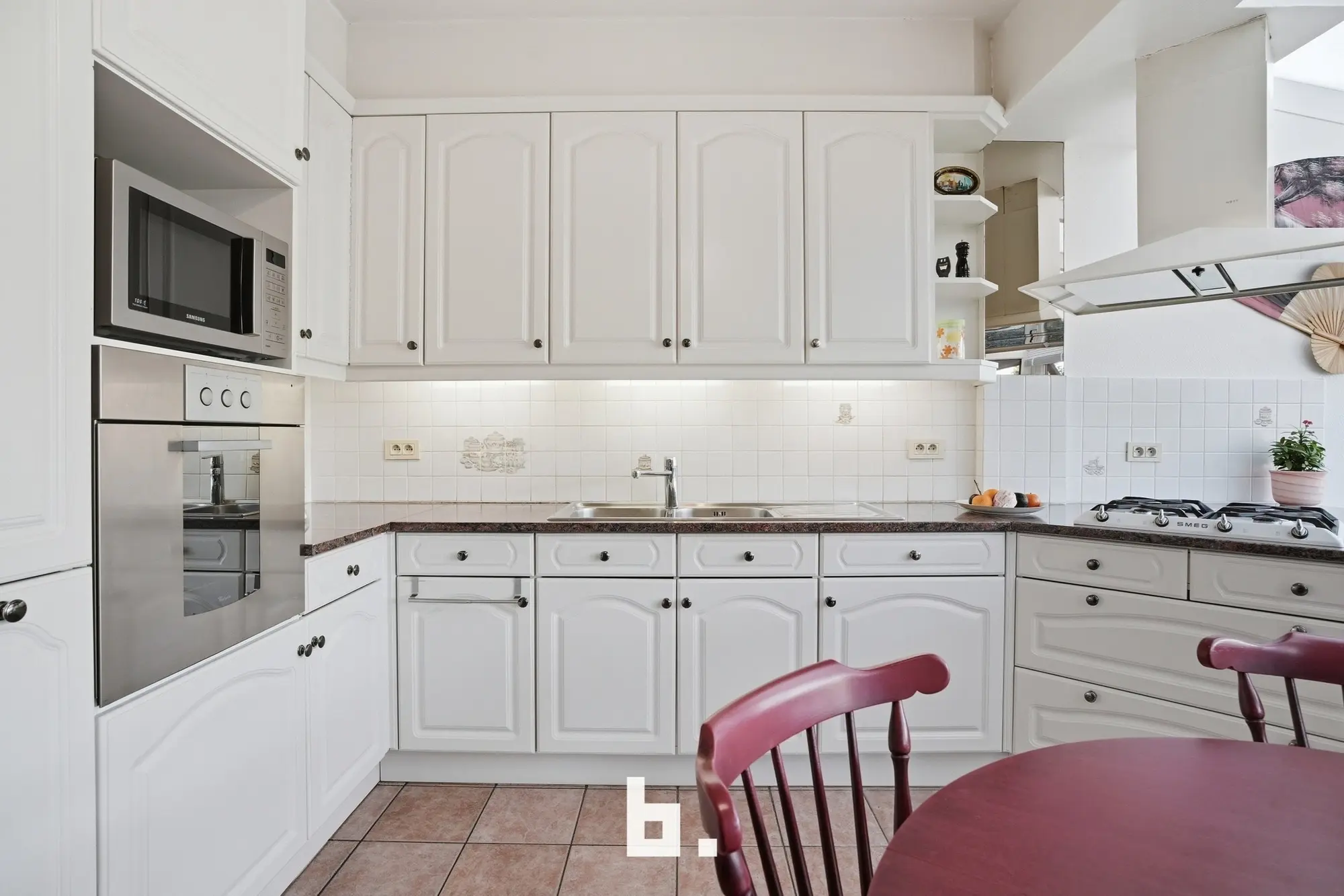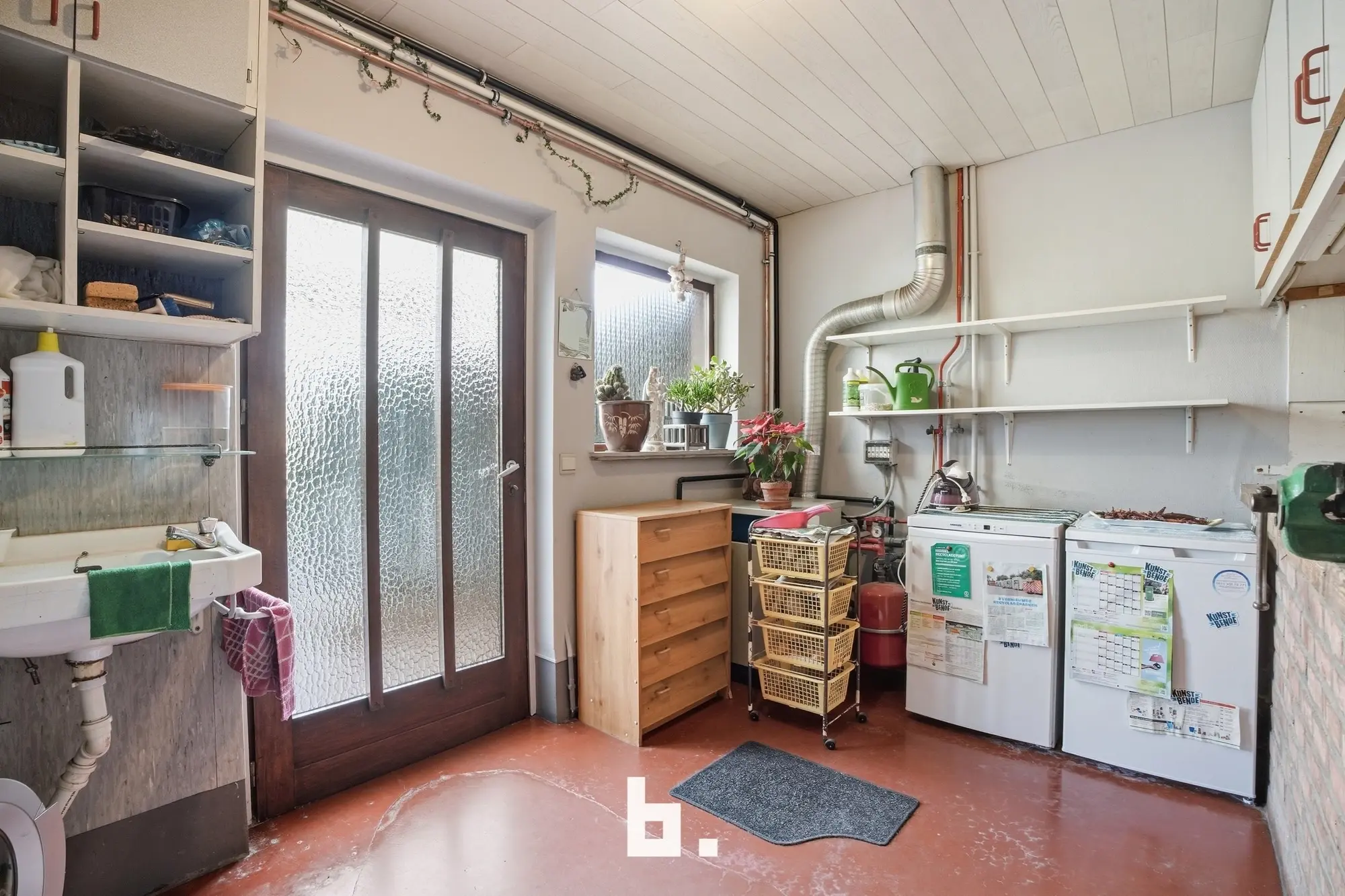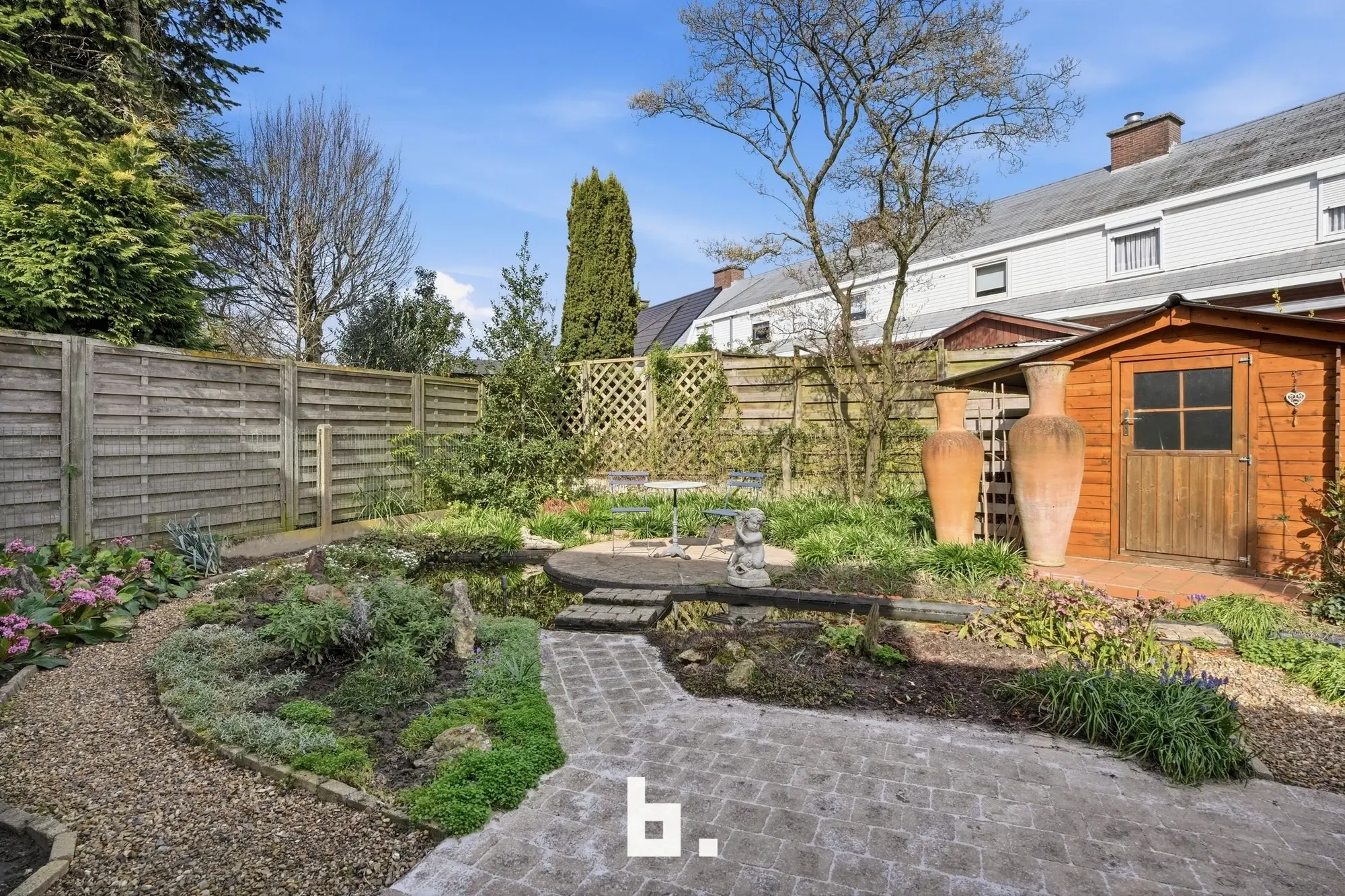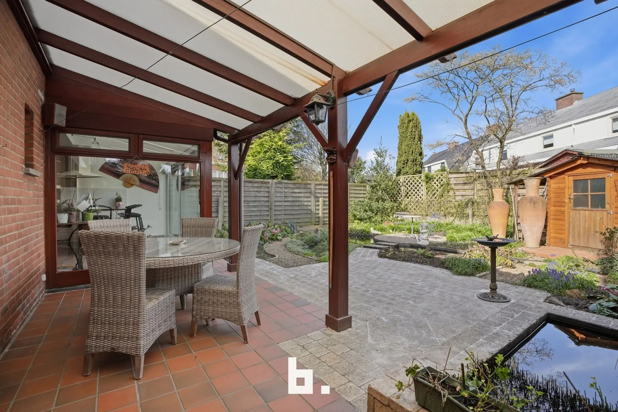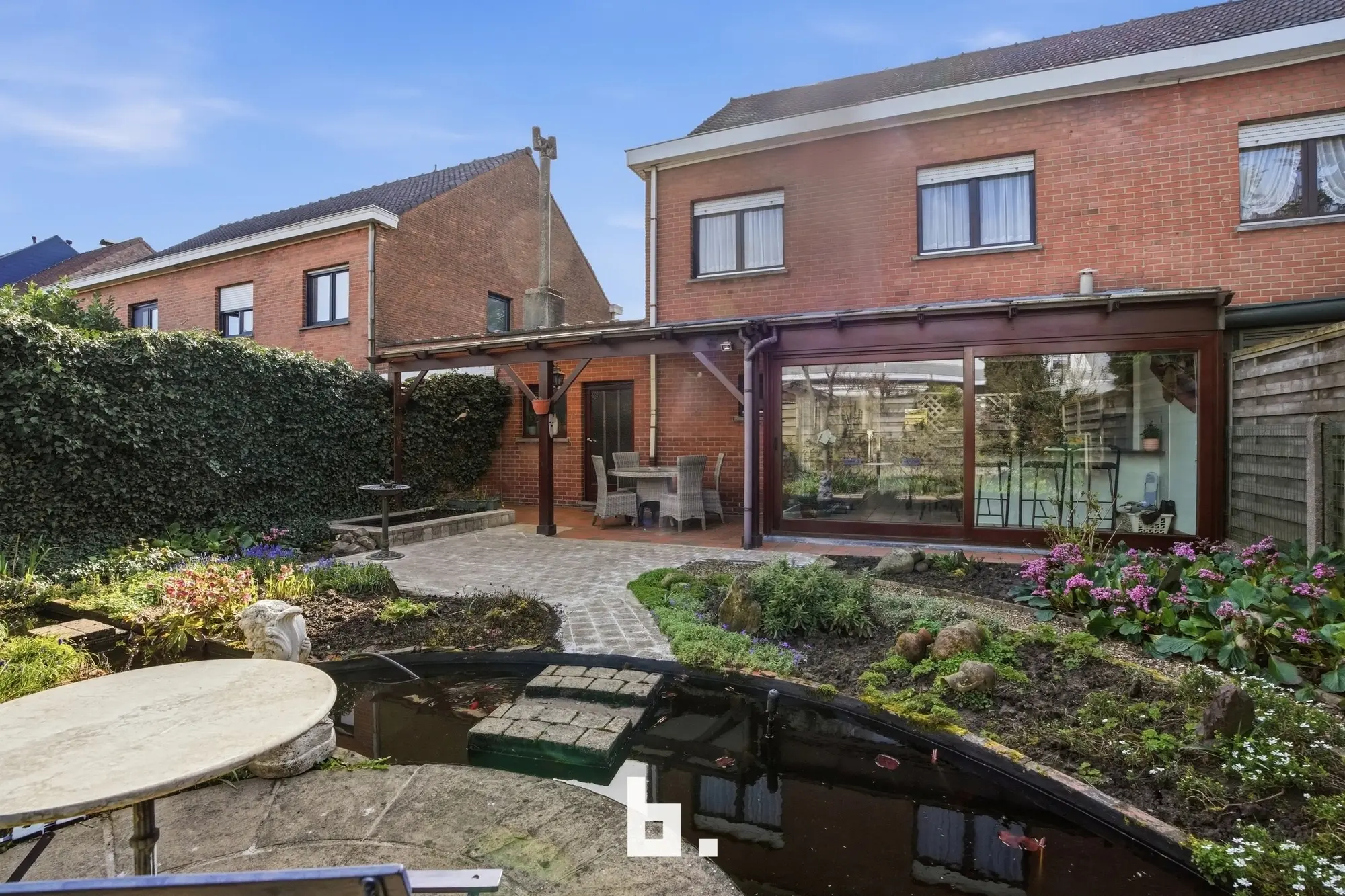 De indeling van deze stevige gezinswoning is als volgt: Inkomhal, lichtrijke eet- en leefruimte, keuken met eetplaats en zicht op de fraai aangelegde tuin. Verder is er nog een praktische bergruimte, toilet, wasplaats en ruime garage terug te vinden. In het stadstuintje met waterpartij is het uiterst aangenaam vertoeven. Op de verdieping bevinden zich 3 slaapkamers en de vernieuwde badkamer. De geïsoleerde zolder is te bereiken via een valtrap. Bovendien bevindt er zich vooraan de woning nog een gezellige, zonovergoten voortuin.