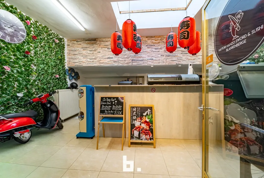 De ruimte werd jarenlang uitgebaat als sushibar met takeaway, wat meteen de uitstekende ligging en visibiliteit bewijs, ook perfect geschikt voor boetiek, kantoor of andere handelsactiviteit.