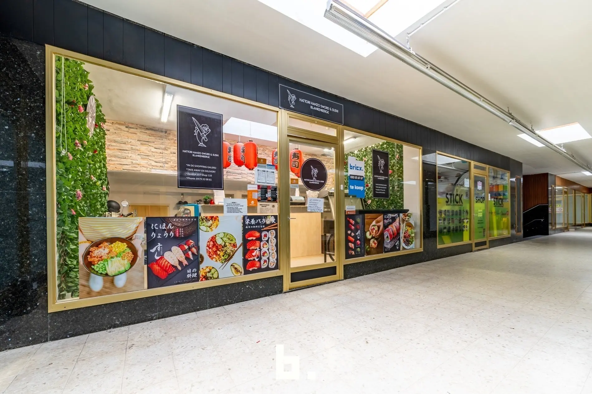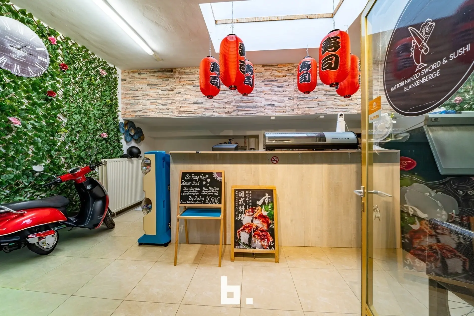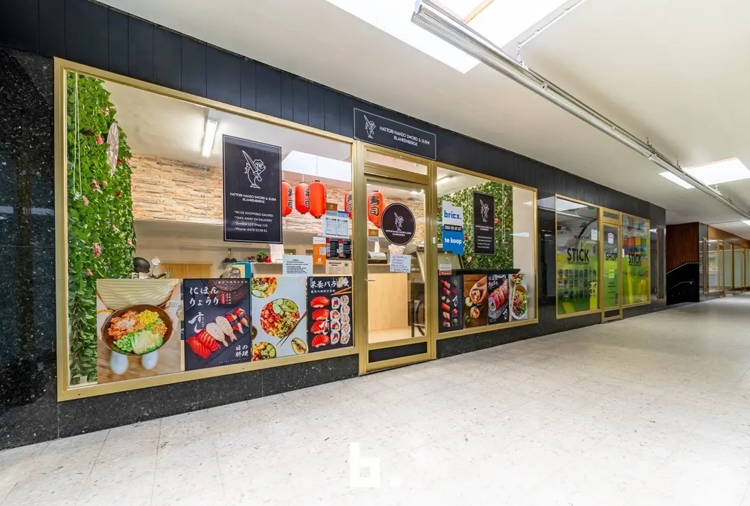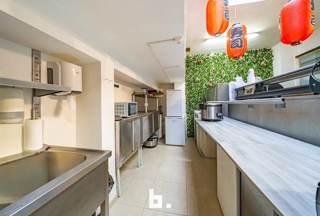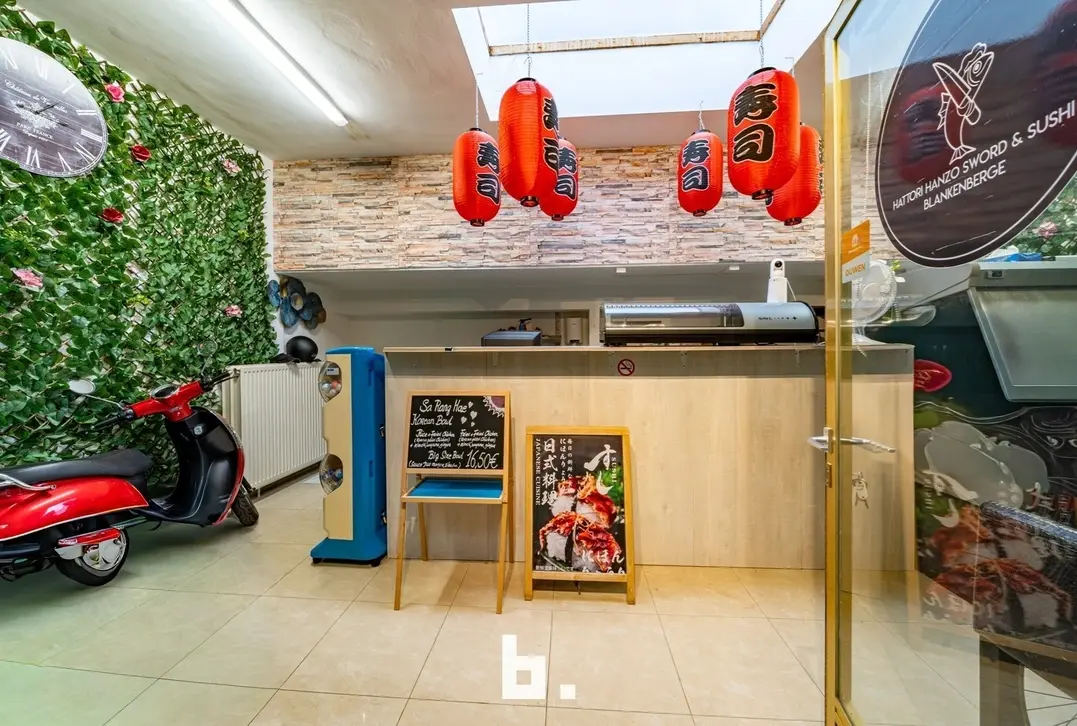 De ruimte werd jarenlang uitgebaat als sushibar met takeaway, wat meteen de uitstekende ligging en visibiliteit bewijs, ook perfect geschikt voor boetiek, kantoor of andere handelsactiviteit.