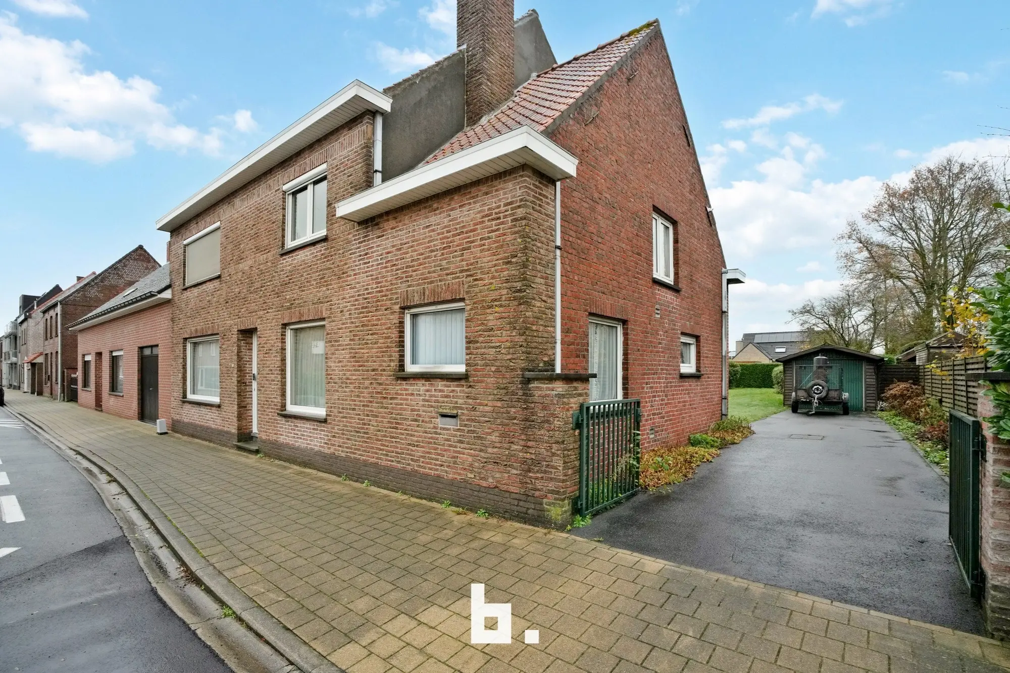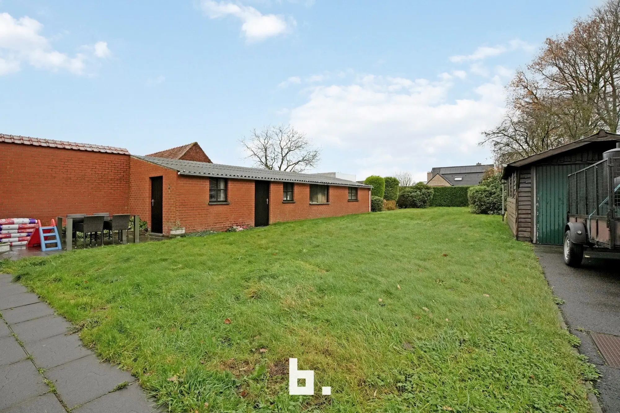 Naast de woning bevindt zich een vrijstaande garage met ruime oprit, geschikt voor meerdere voertuigen. Aan de linkerzijde van de tuin zijn er bovendien bijgebouwen, perfect als extra berging, hobbyruimte of opslag.