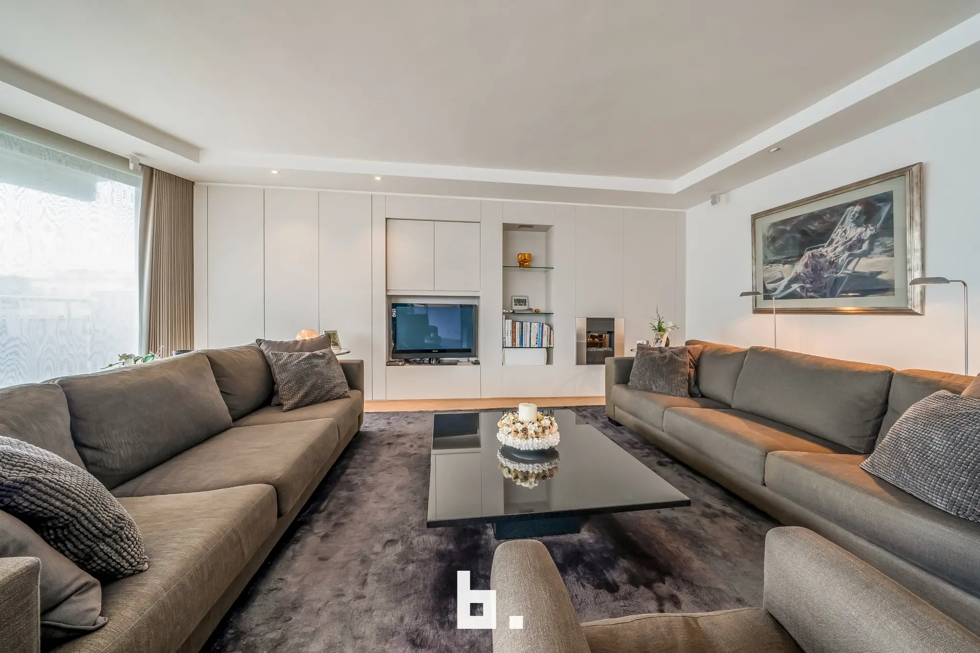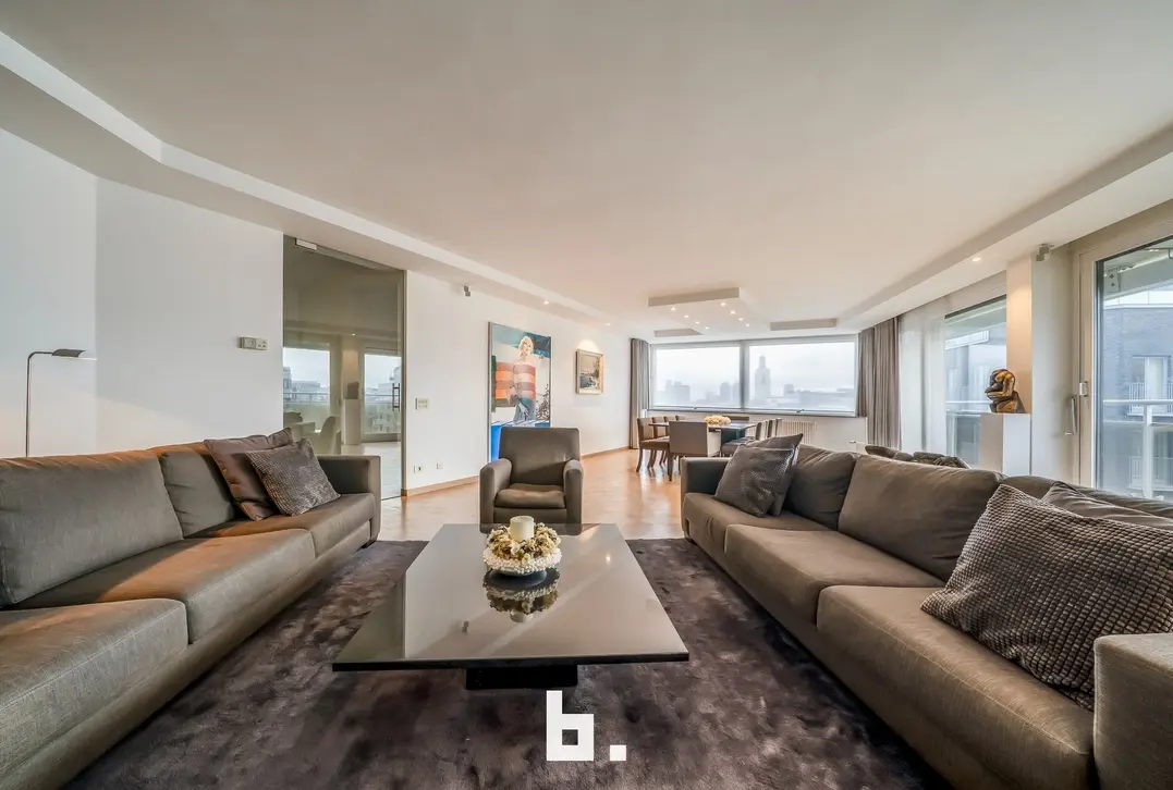 Grote, lichtrijke living met zitruimte en zicht op de stad