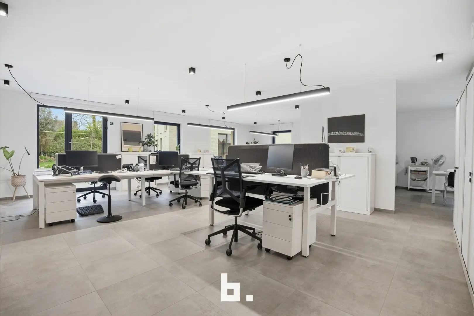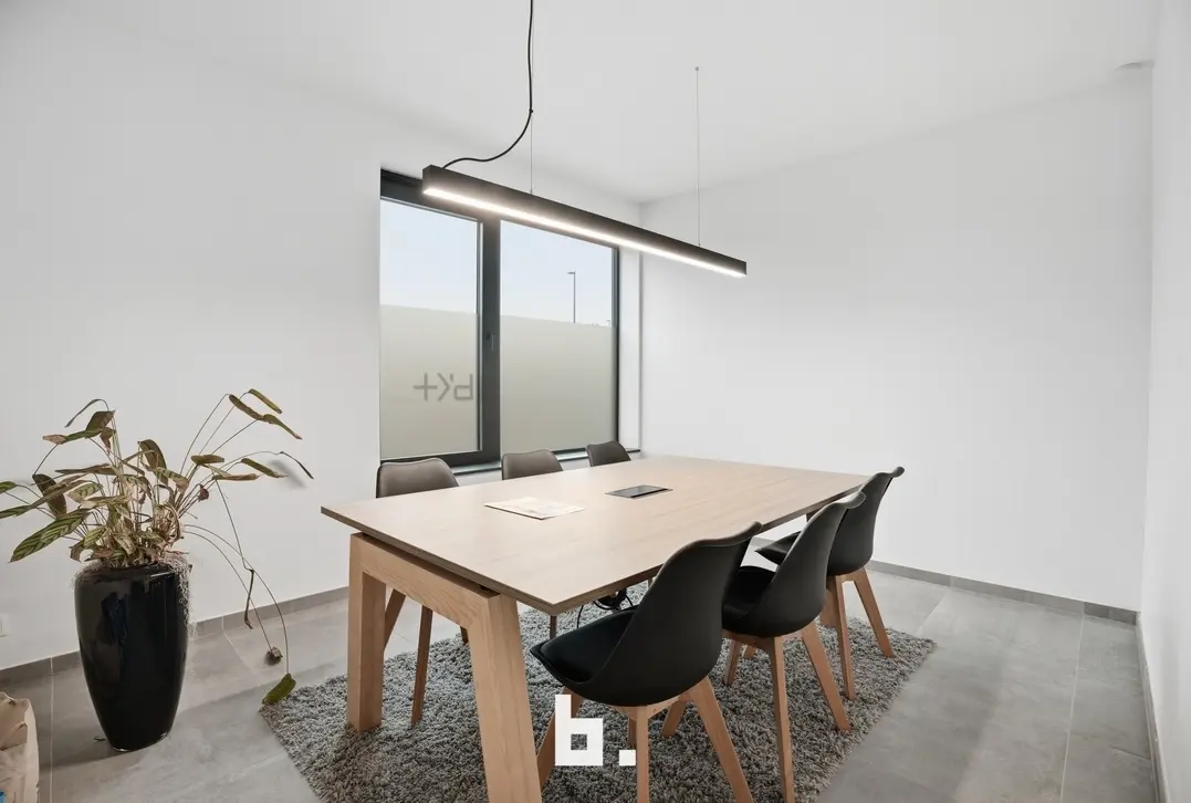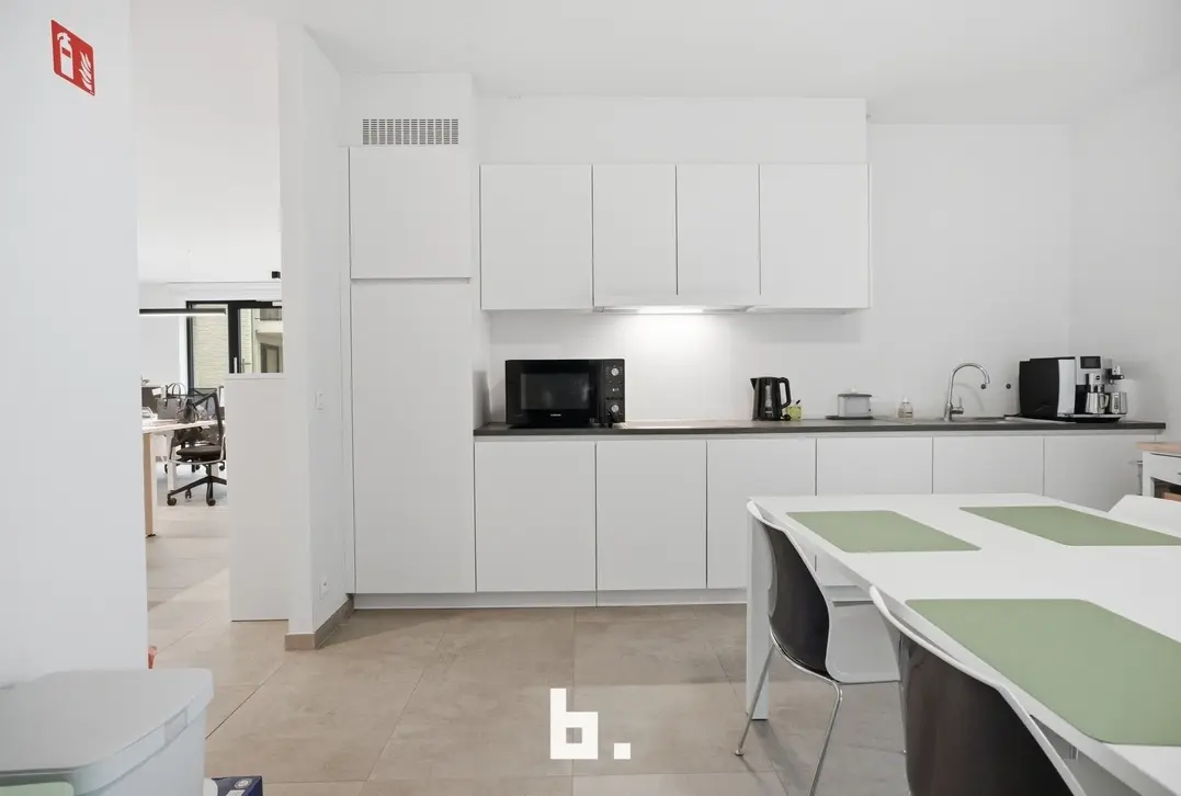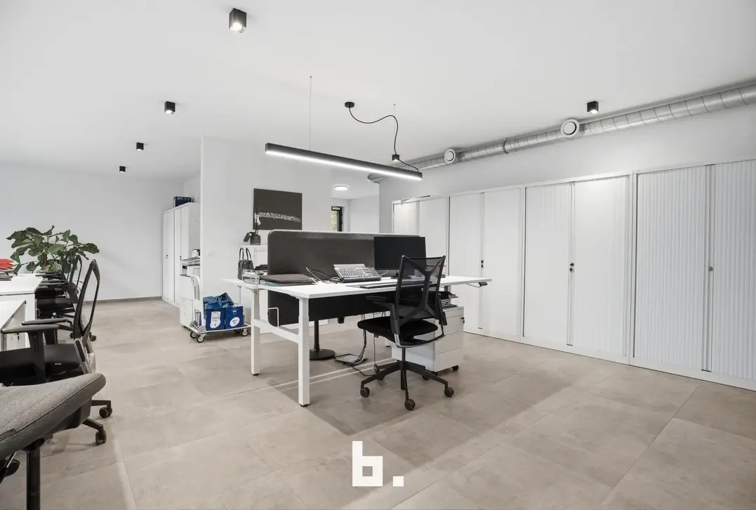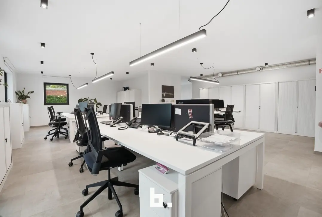De ruimte omvat een open landschapskantoor, aangevuld met twee afzonderlijke kantoren of vergaderruimtes, een volledig uitgeruste keuken, praktische bergruimte en sanitaire voorzieningen met douche. Aansluitend vindt u een terras in een groene omgeving, wat zorgt voor een extra troef en een aangename pauzeplek.