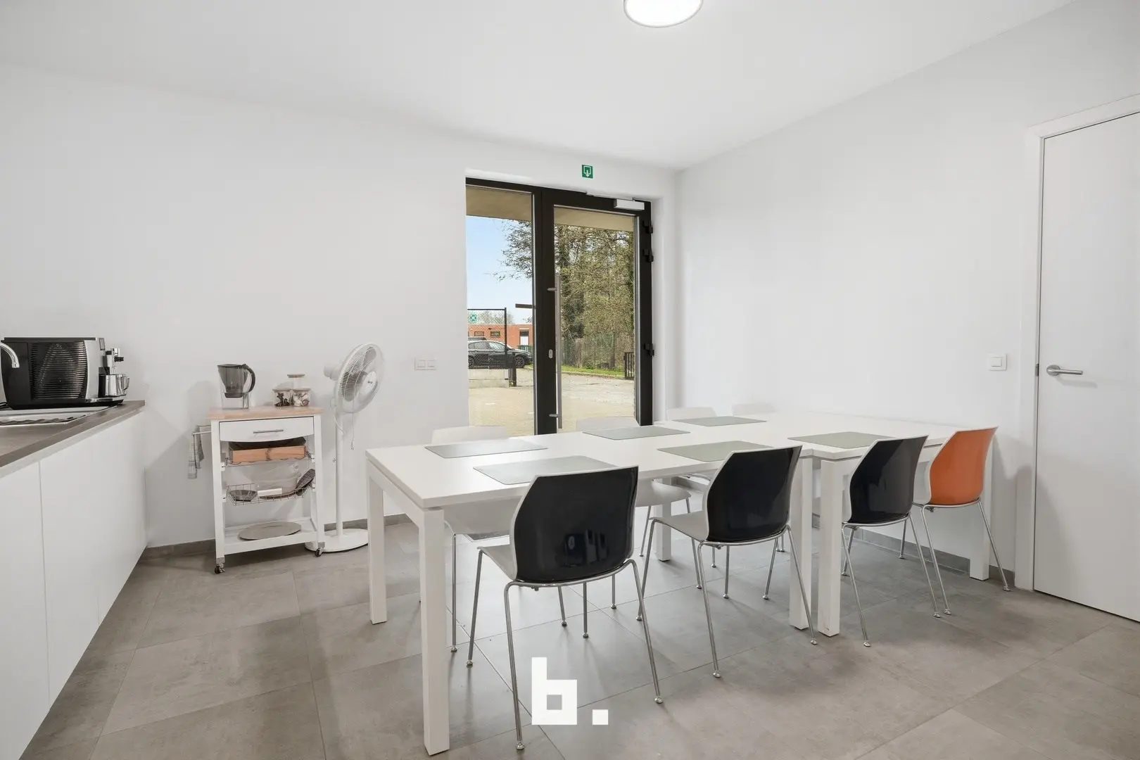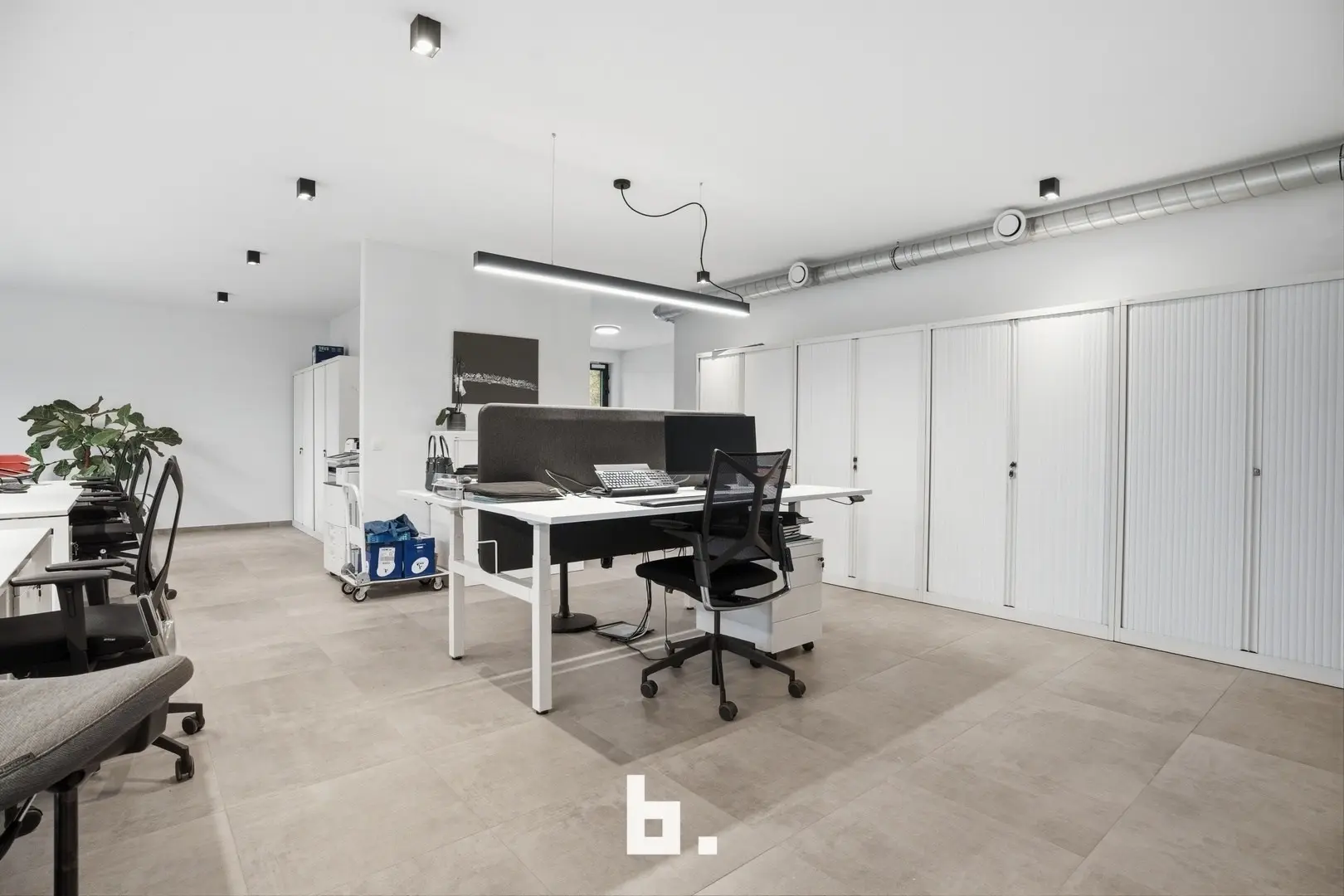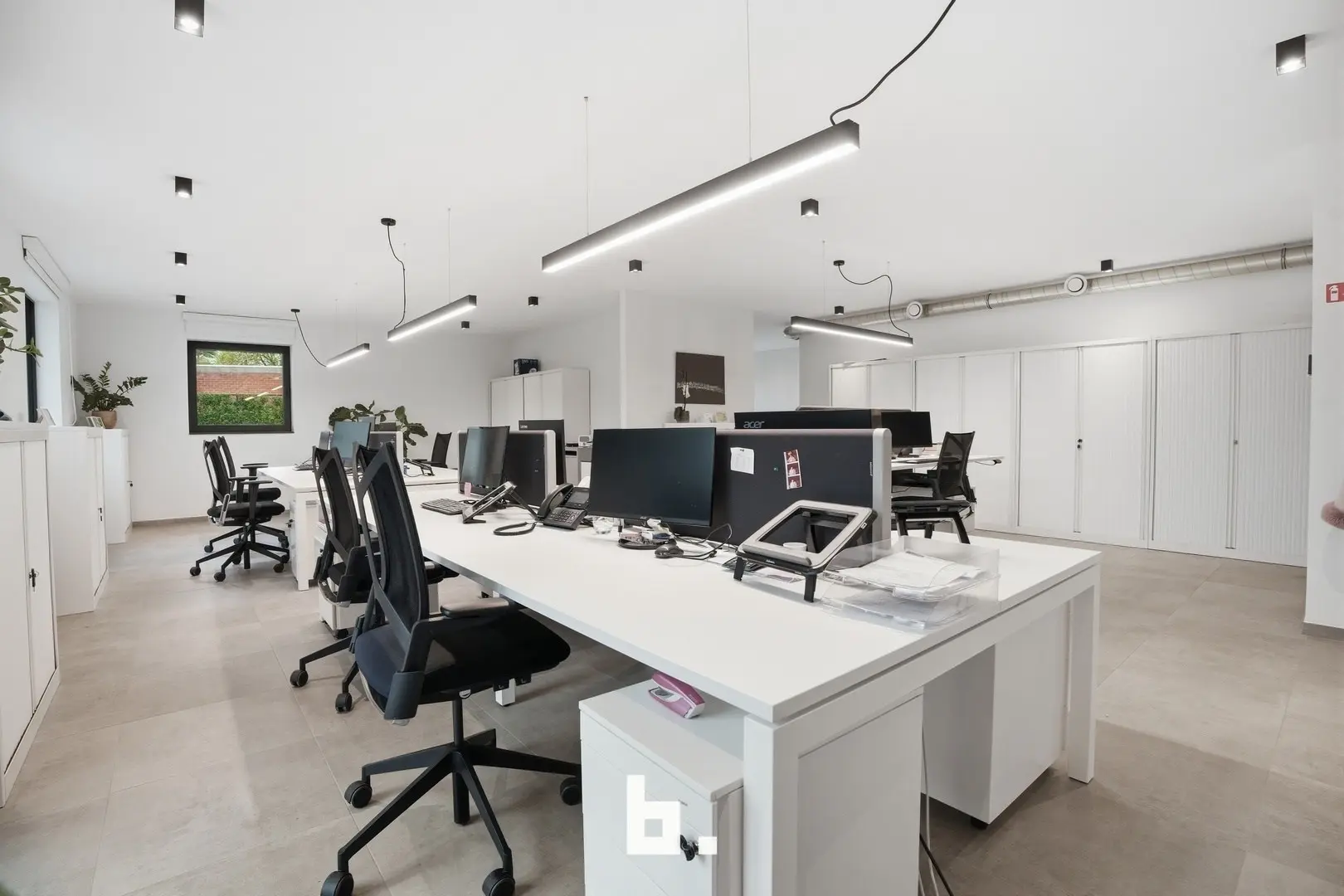 De ruimte omvat een open landschapskantoor, aangevuld met twee afzonderlijke kantoren of vergaderruimtes, een volledig uitgeruste keuken, praktische bergruimte en sanitaire voorzieningen met douche. Aansluitend vindt u een terras in een groene omgeving, wat zorgt voor een extra troef en een aangename pauzeplek.