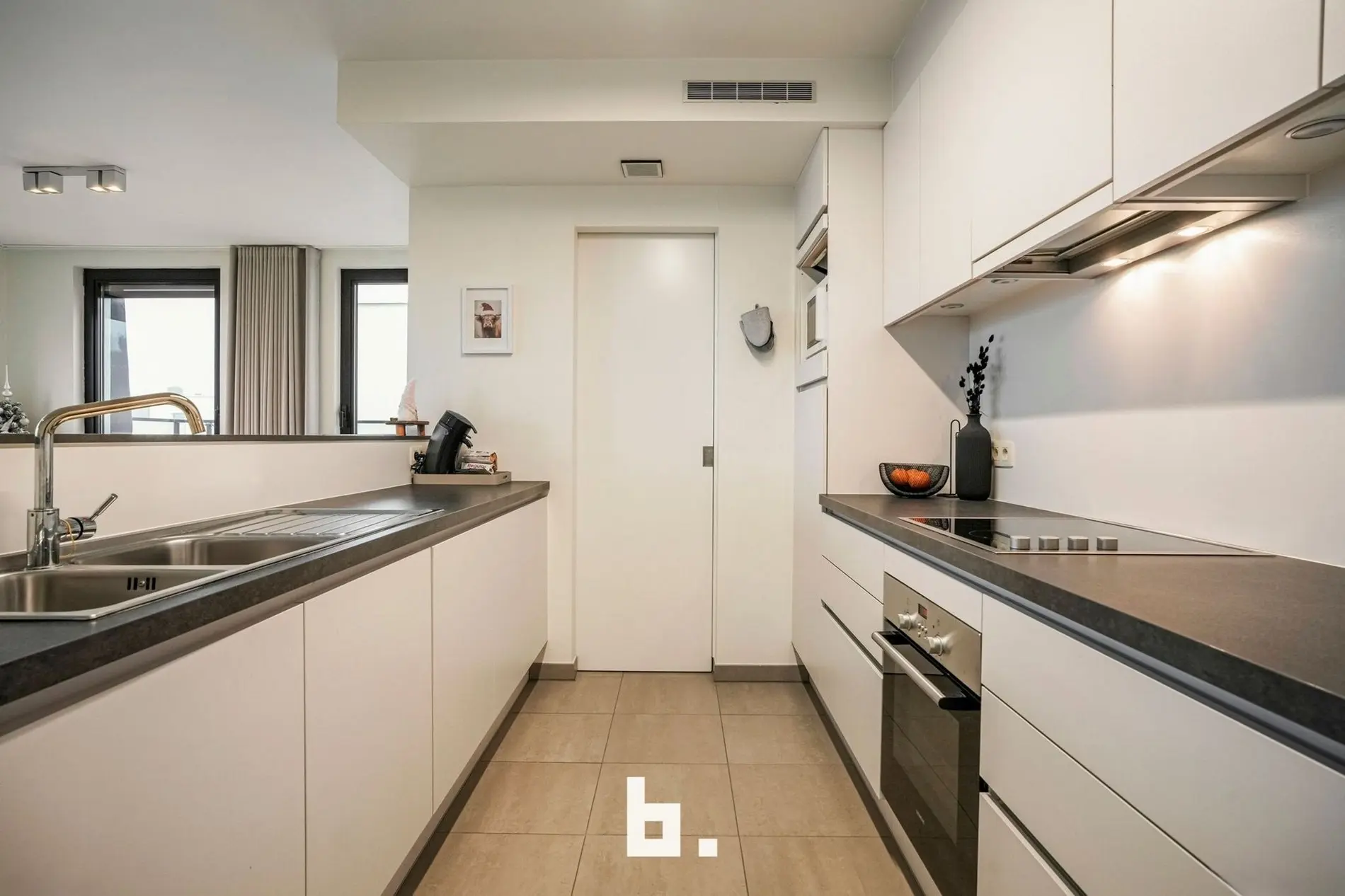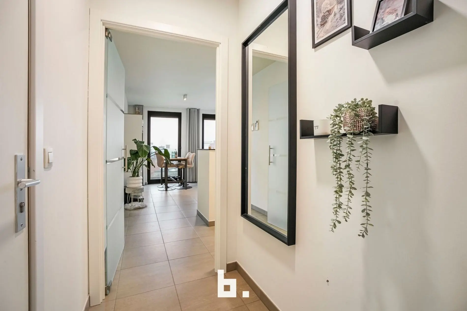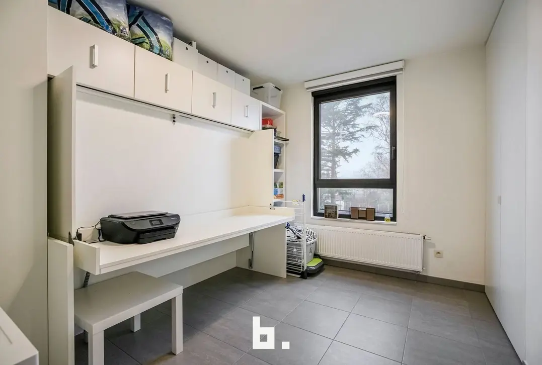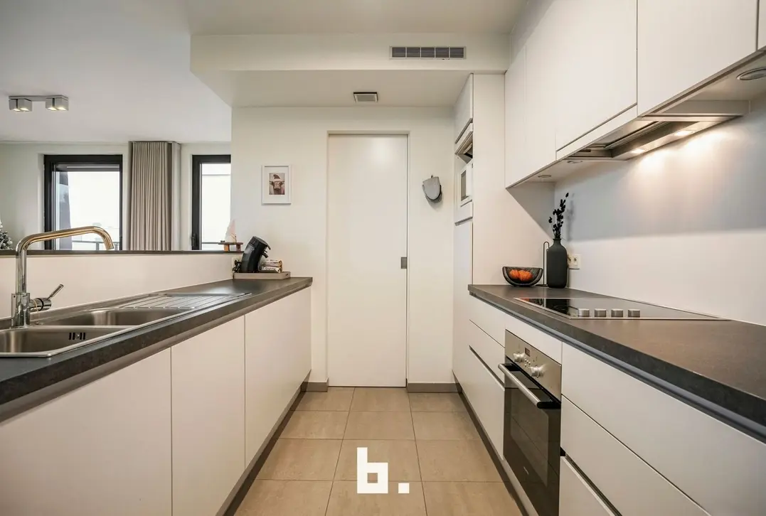 Bij het binnenkomen valt meteen de verzorgde en harmonieuze uitstraling op. Het appartement werd recent volledig opnieuw geschilderd en is uitgerust met op maat gemaakte inbouwkasten die niet alleen esthetisch, maar ook uiterst praktisch zijn. De lichtrijke leefruimte sluit naadloos aan op de volledig uitgeruste keuken en vormt een aangename plek om te ontspannen of gasten te ontvangen.