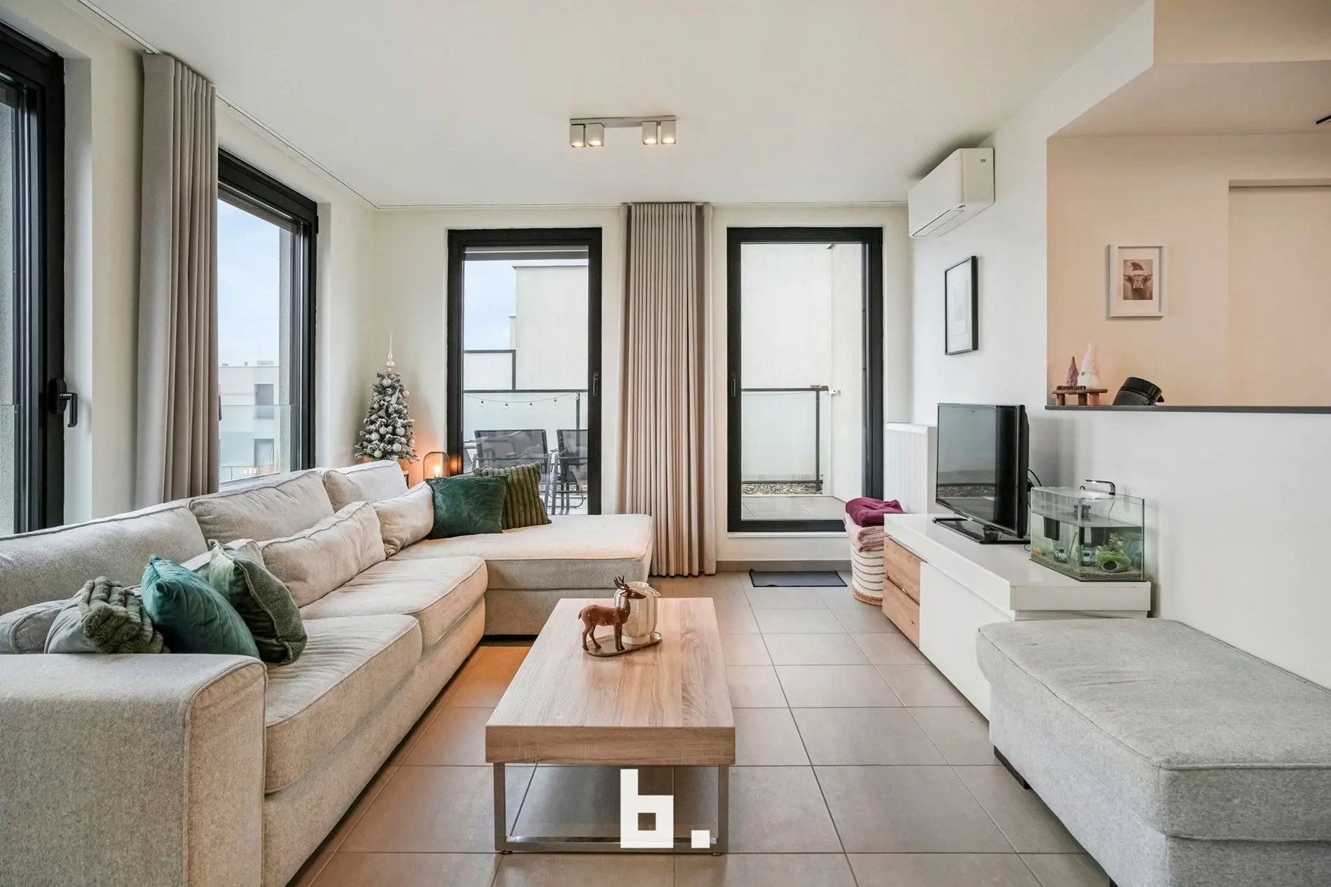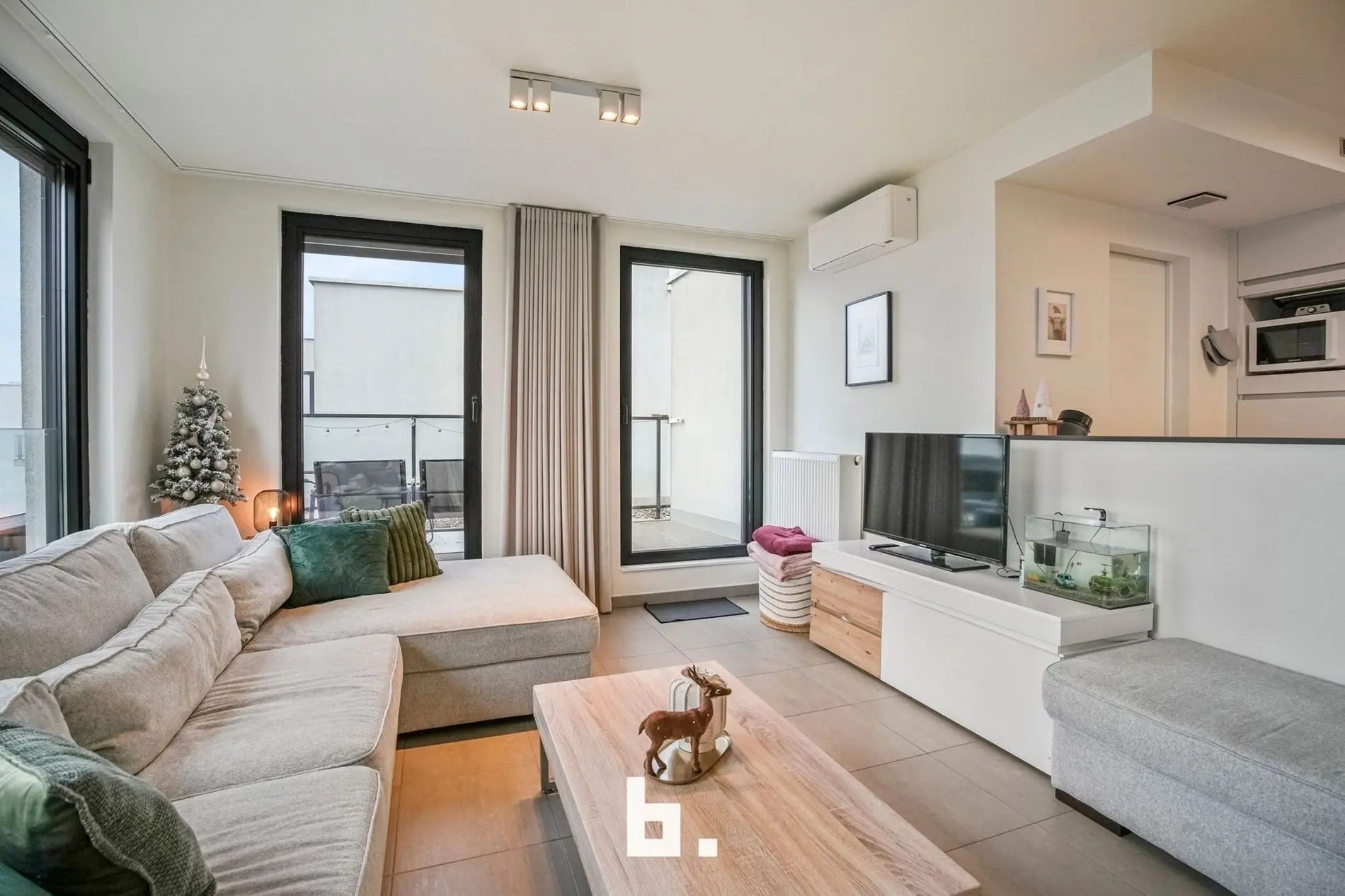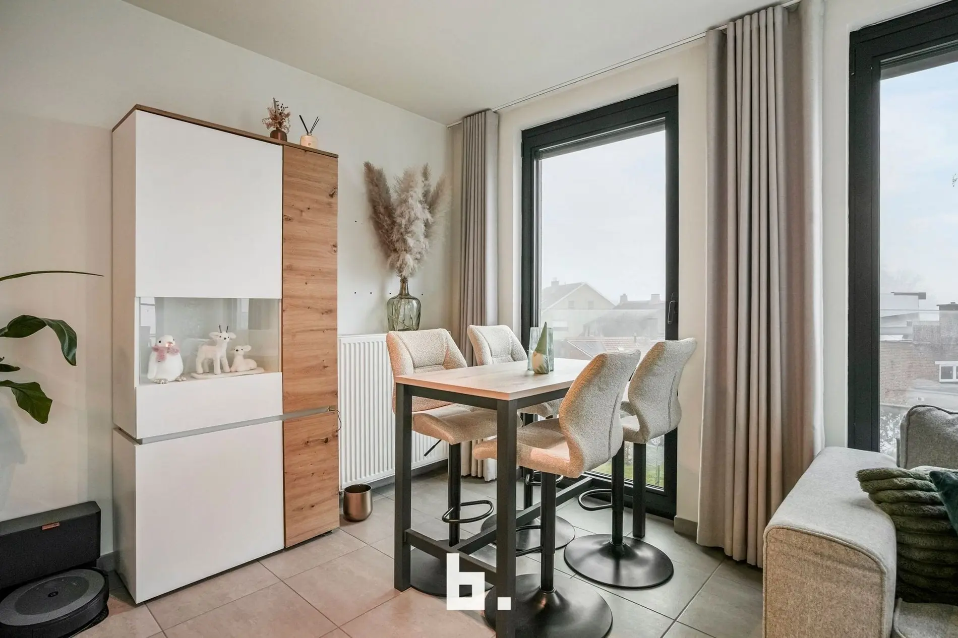 Bij het binnenkomen valt meteen de verzorgde en harmonieuze uitstraling op. Het appartement werd recent volledig opnieuw geschilderd en is uitgerust met op maat gemaakte inbouwkasten die niet alleen esthetisch, maar ook uiterst praktisch zijn. De lichtrijke leefruimte sluit naadloos aan op de volledig uitgeruste keuken en vormt een aangename plek om te ontspannen of gasten te ontvangen.