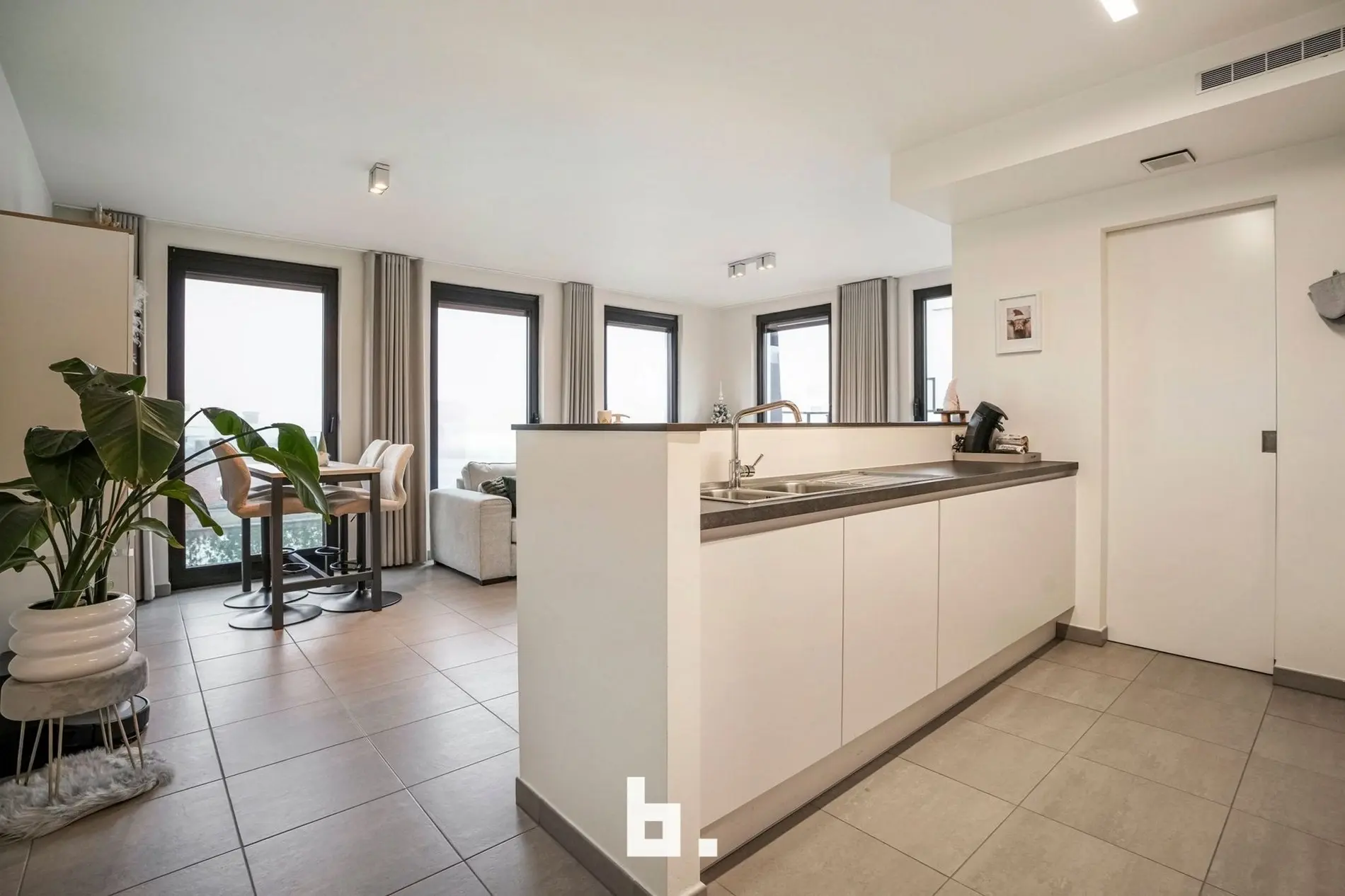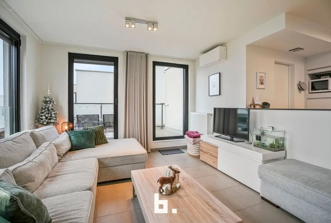 Bij het binnenkomen valt meteen de verzorgde en harmonieuze uitstraling op. Het appartement werd recent volledig opnieuw geschilderd en is uitgerust met op maat gemaakte inbouwkasten die niet alleen esthetisch, maar ook uiterst praktisch zijn. De lichtrijke leefruimte sluit naadloos aan op de volledig uitgeruste keuken en vormt een aangename plek om te ontspannen of gasten te ontvangen.