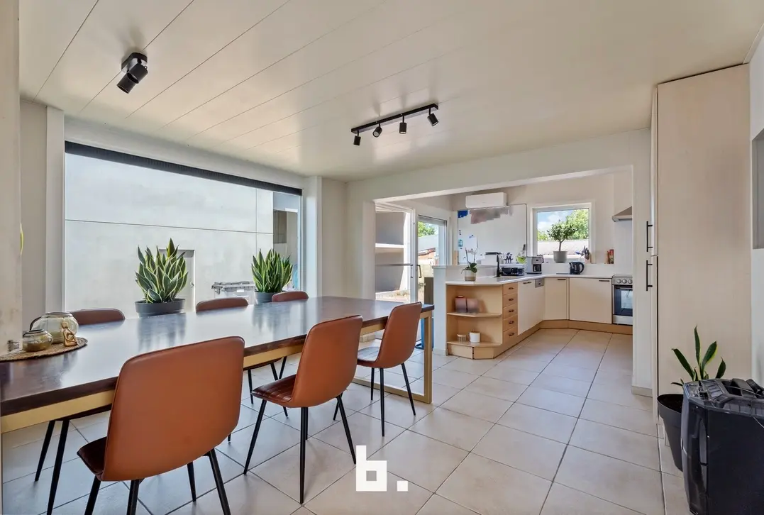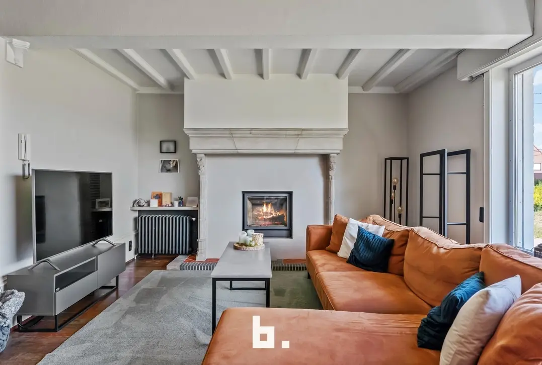 De leefruimte is bijzonder ruim (65 m²) en baadt in het natuurlijke licht. De gezellige houtcassette zorgt voor extra sfeer tijdens de koudere maanden, wat deze ruimte tot het hart van de woning maakt.
