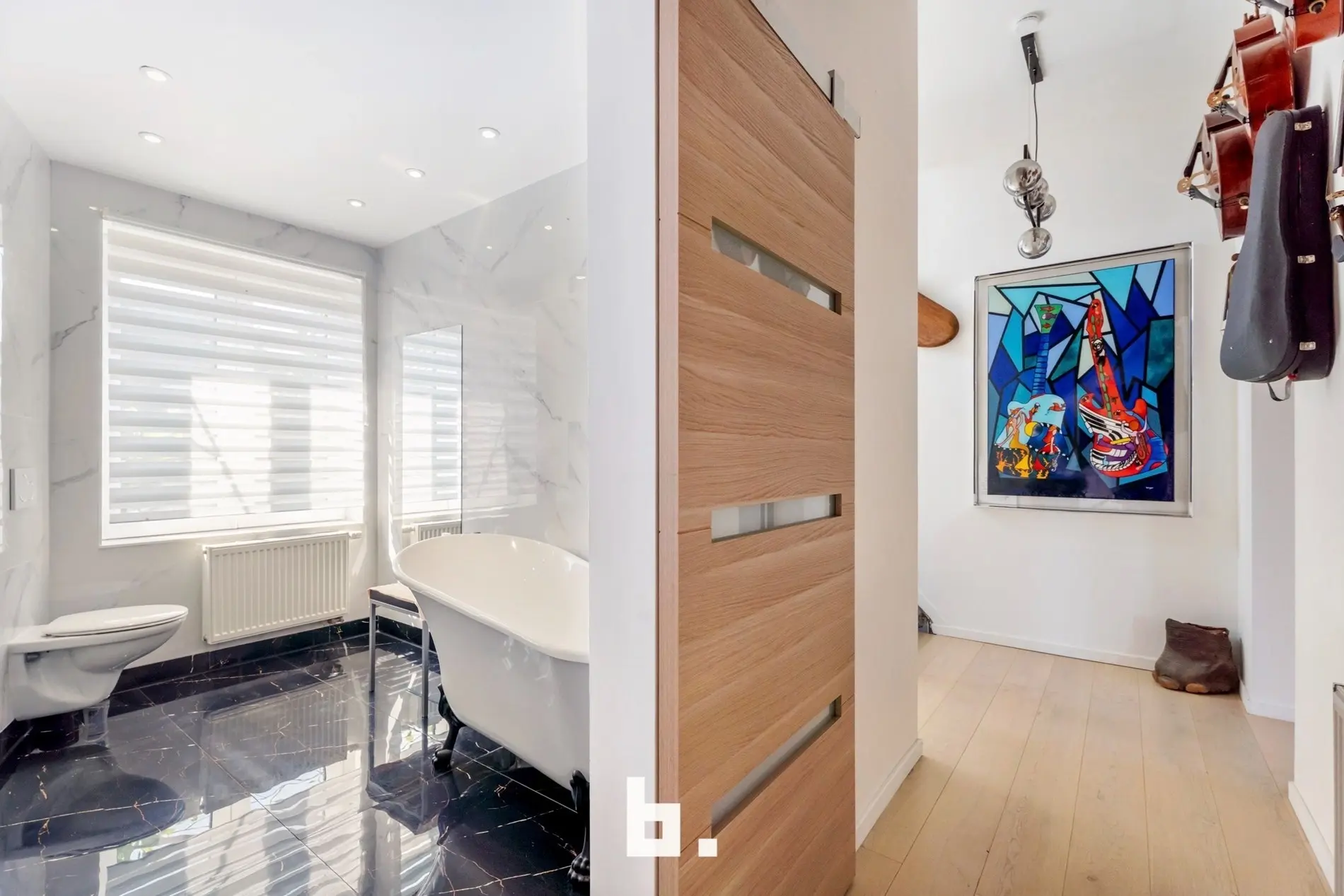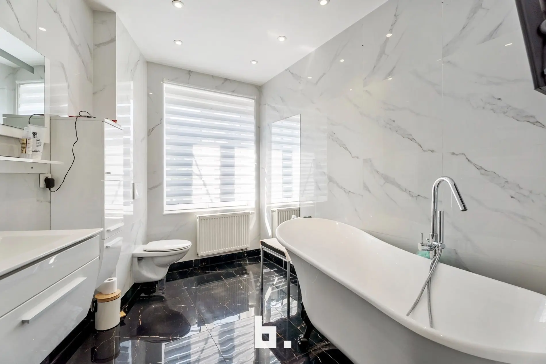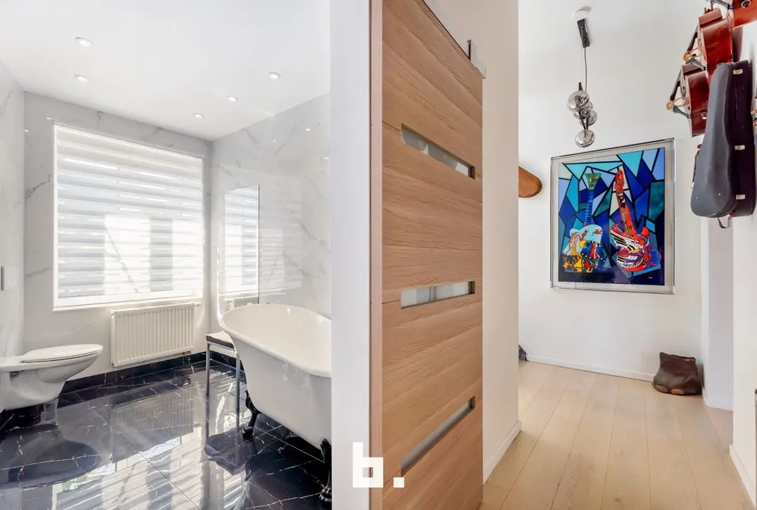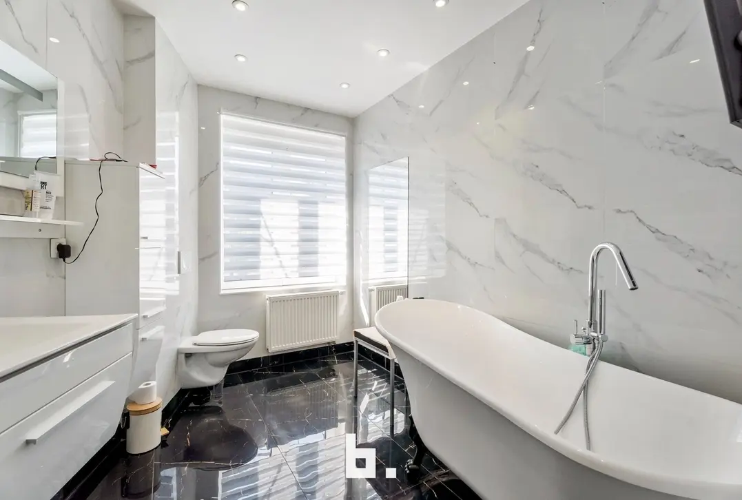 Verder op deze verdieping is een eerste badkamer met ligbad, toilet en wastafel terug te vinden.