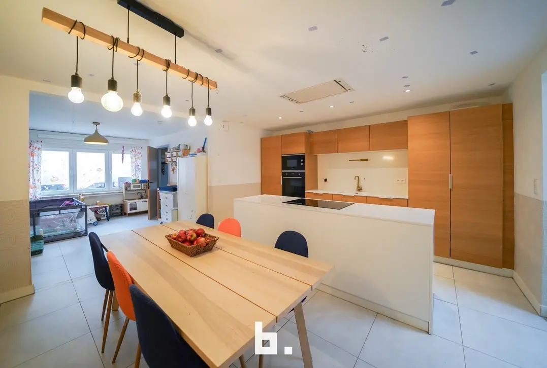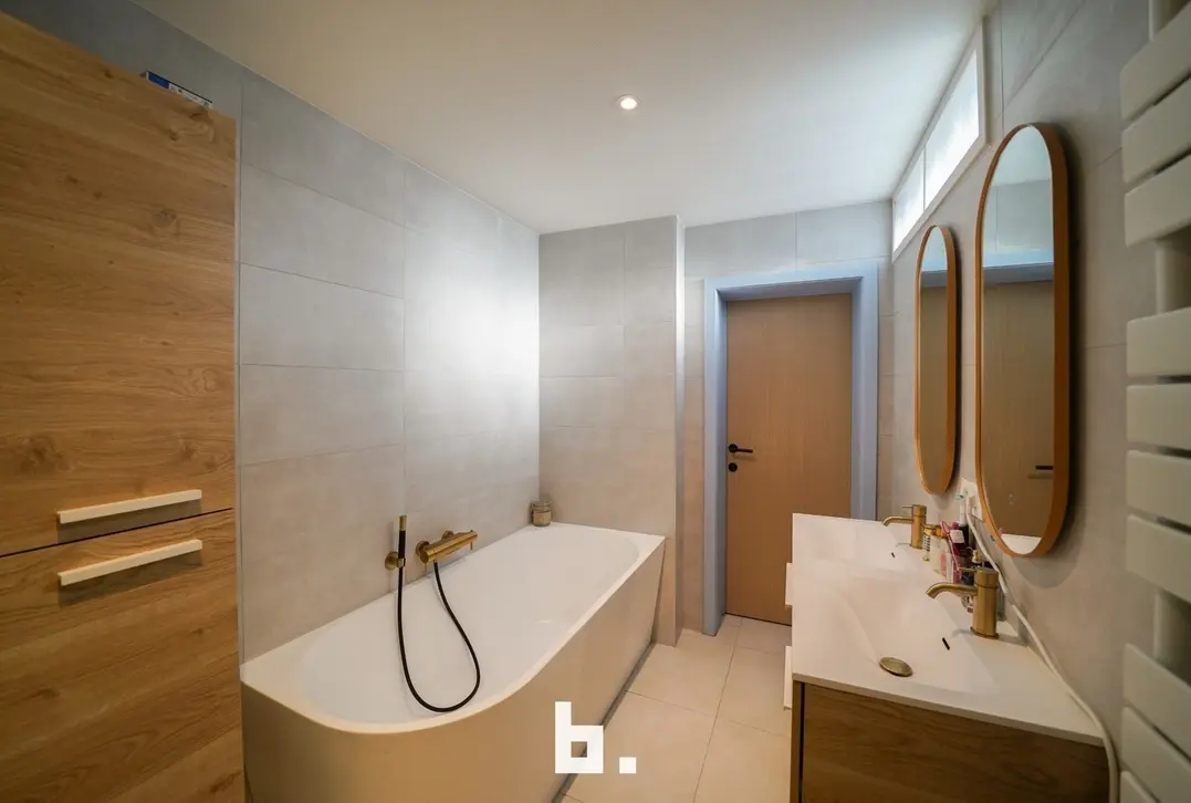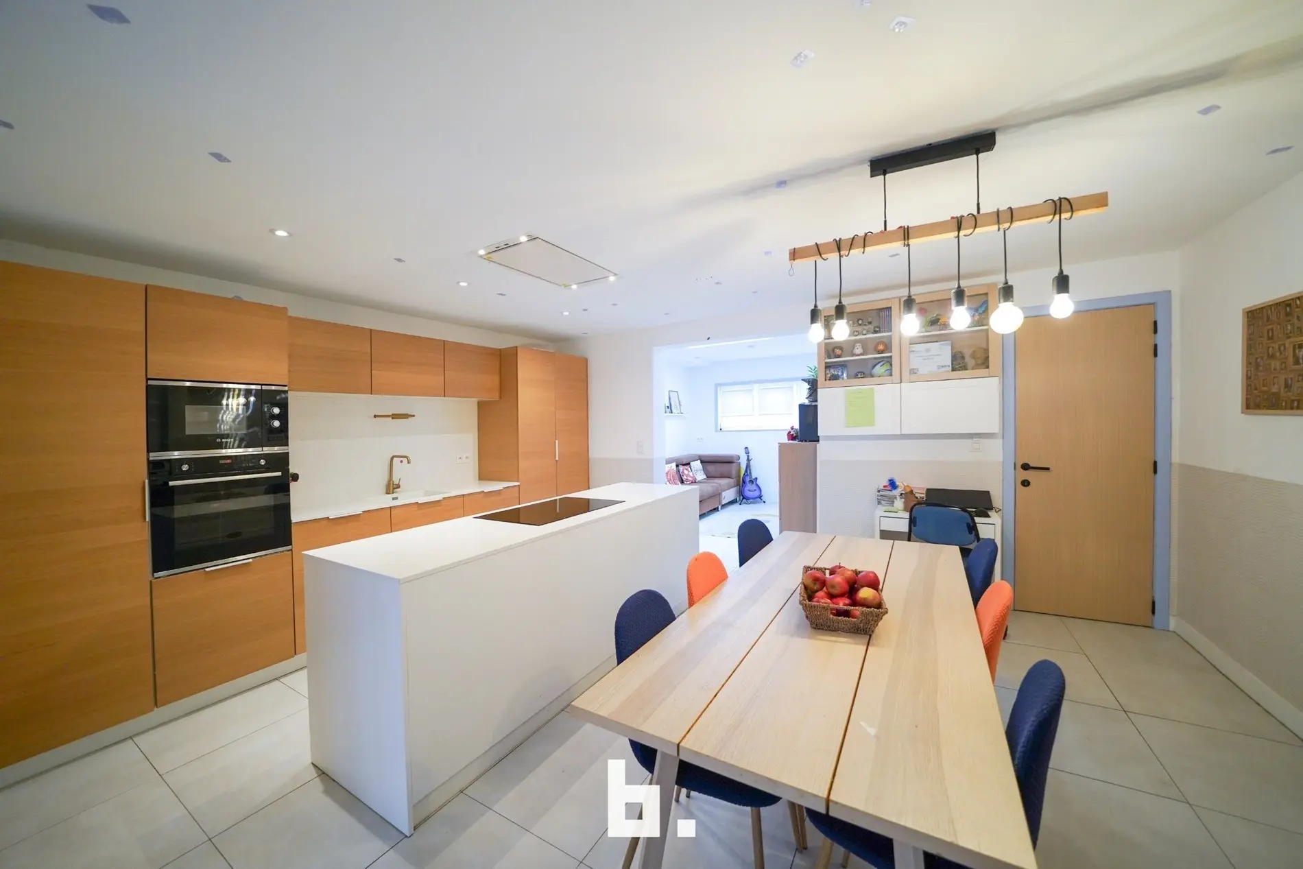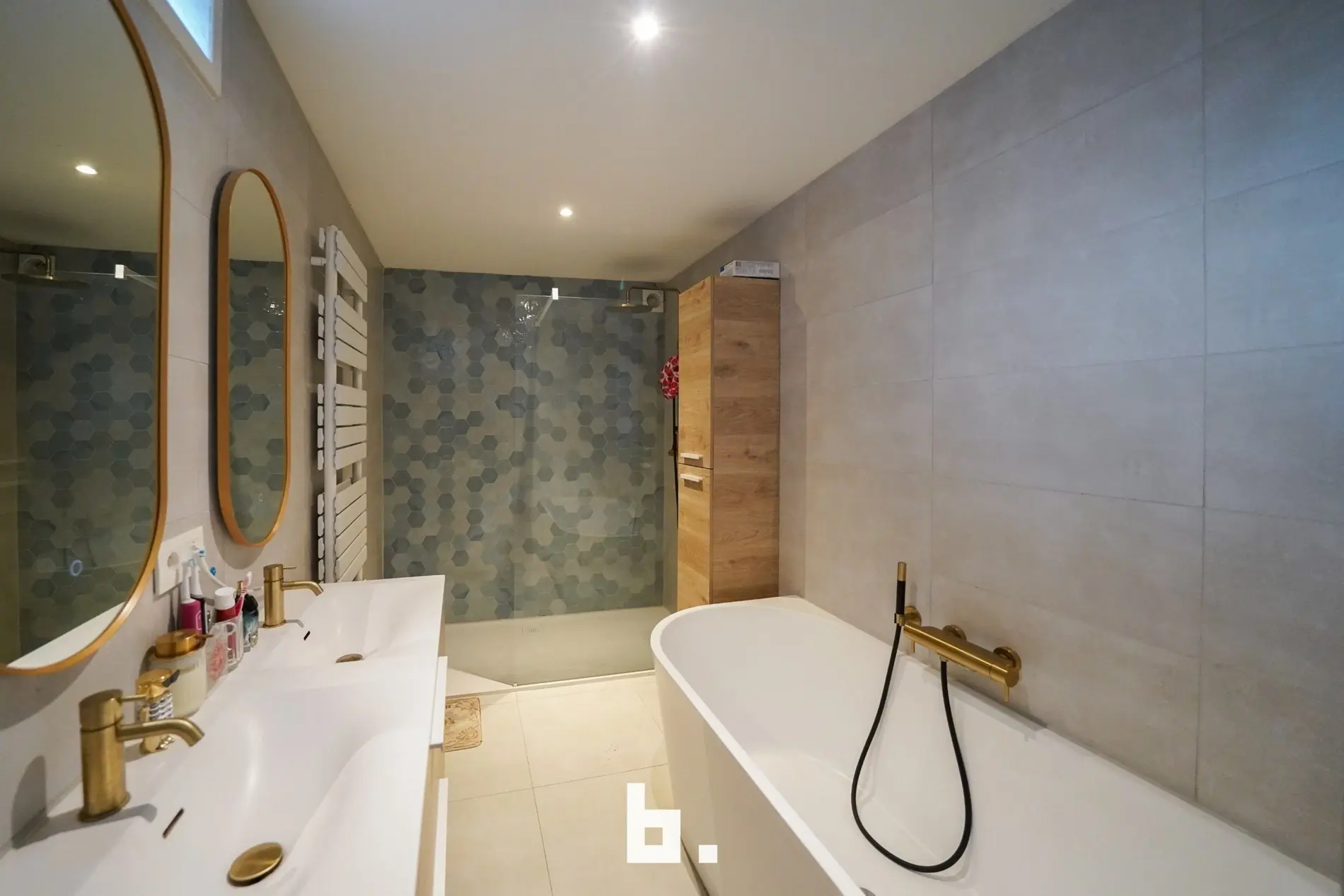 De woning is volledig instapklaar. De volledige benedenverdieping werd recent vernieuwd met een moderne open keuken, een luxueuze badkamer met inloopdouche, dubbele wastafel en toilet, en een nieuwe, doorlopende tegelvloer met vloerverwarming. Boven zijn er drie volwaardige slaapkamers en een kleine slaapkamer.