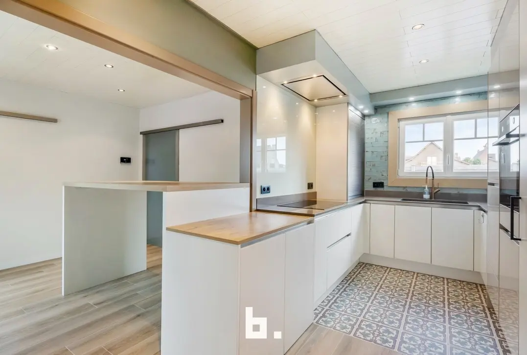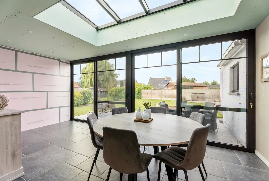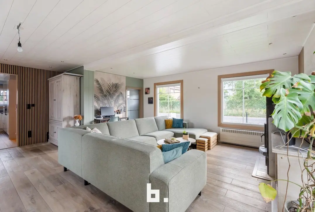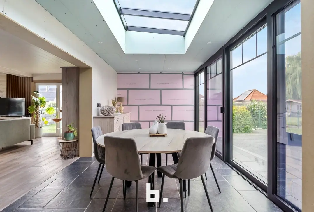 Binnenkomen doen we in de ruime inkomhal met gastentoilet en toegang tot de lichtrijke leefruimte. Verder vinden we hier nog een prachtige uitbouw, volledig ingerichte keuken, berging, badkamer en slaapkamer