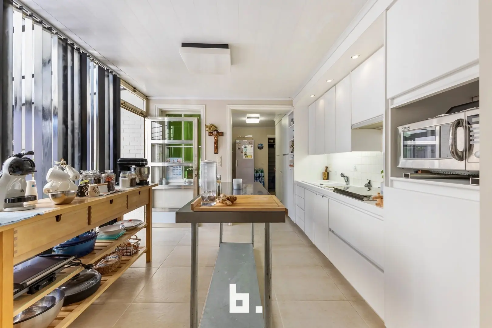Via de ruime inkomhal komen we in de lichtrijke woonkamer die leidt naar de gezellige leefruimte voorzien van houtkachel. Verder hebben we de ruime keuken, veranda, extra berging en kelder