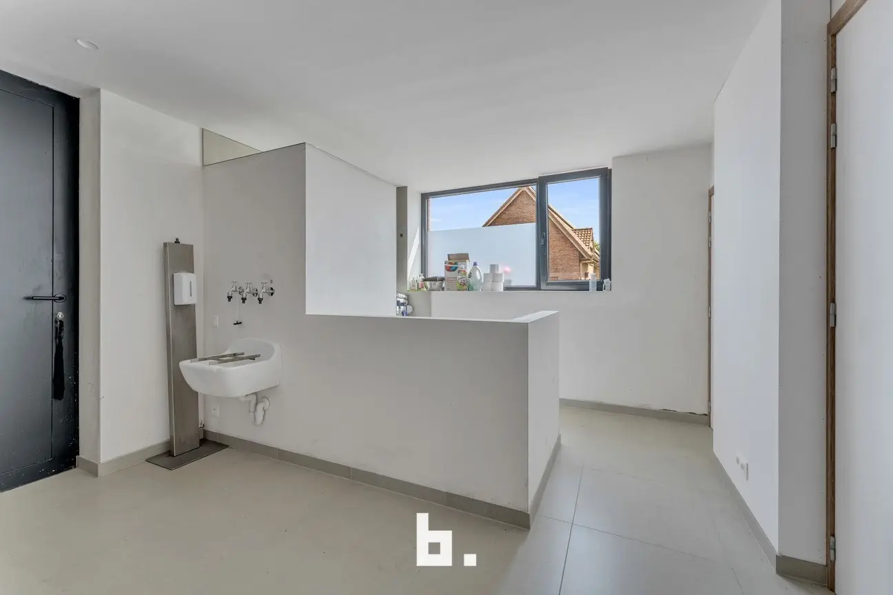 Gelijkvloers: ruime inkomhal met gastentoilet, gezellig ruime leefruimte met veel lichtinval die vlot overgaat in de riante leefkeuken. Midden in de woning is er een koele berging. Daarnaast bevindt zich de was-, strijk- en douchekamer. Er is een inpandige autostaanplaats en een ruim atelier/hobbyruimte.