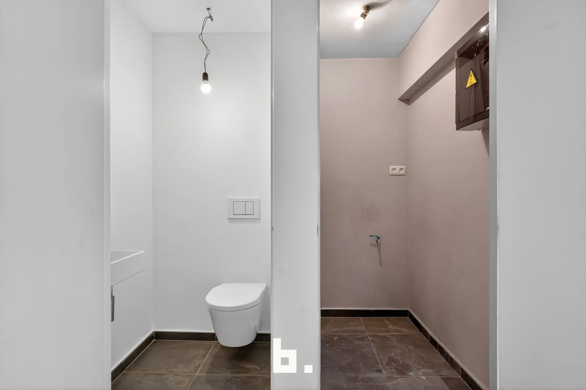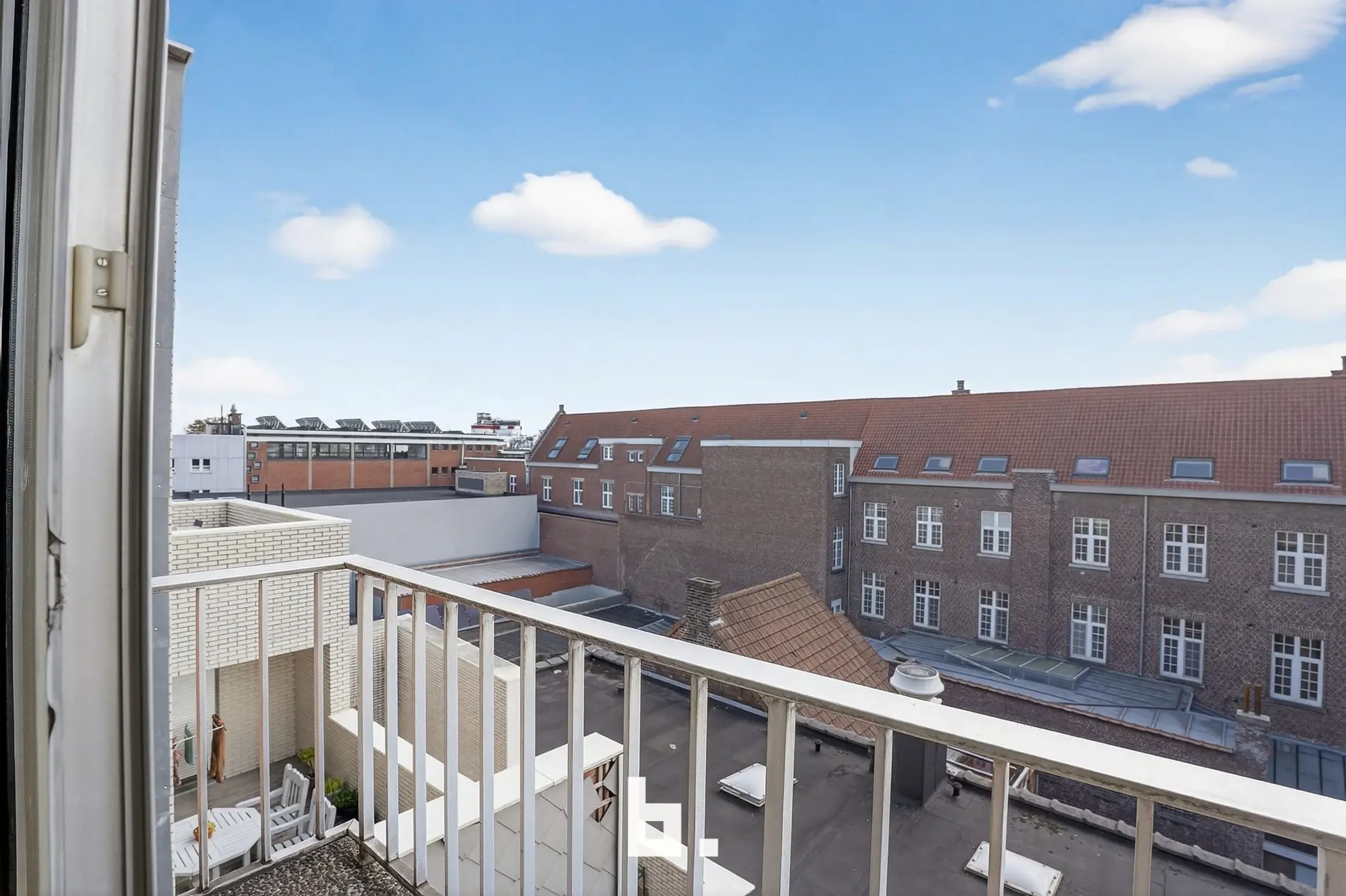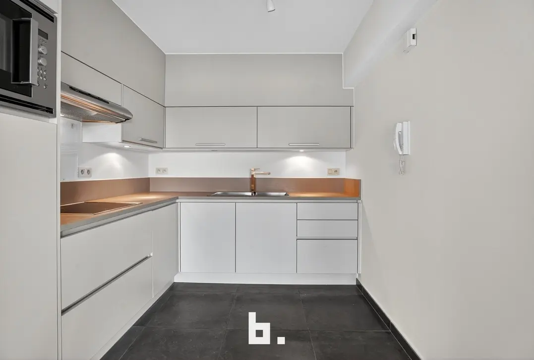 Links van de inkom kom je in de lichtrijke leefruimte, volledig omgeven door glas langs de voorzijde. De schuiframen brengen je naar een zonnig balkon met zicht op de bruisende winkelstraat. De open, volledig vernieuwde keuken sluit naadloos aan bij de woonkamer en vormt het hart van dit appartement.