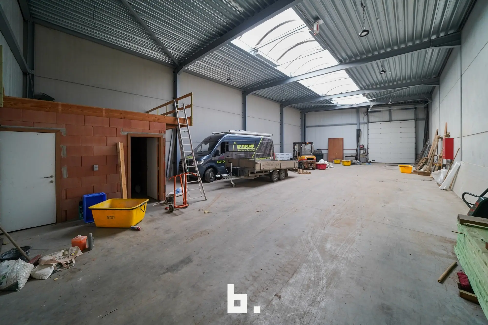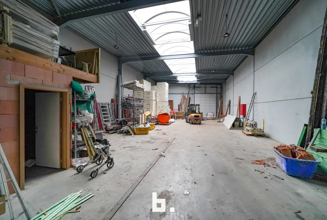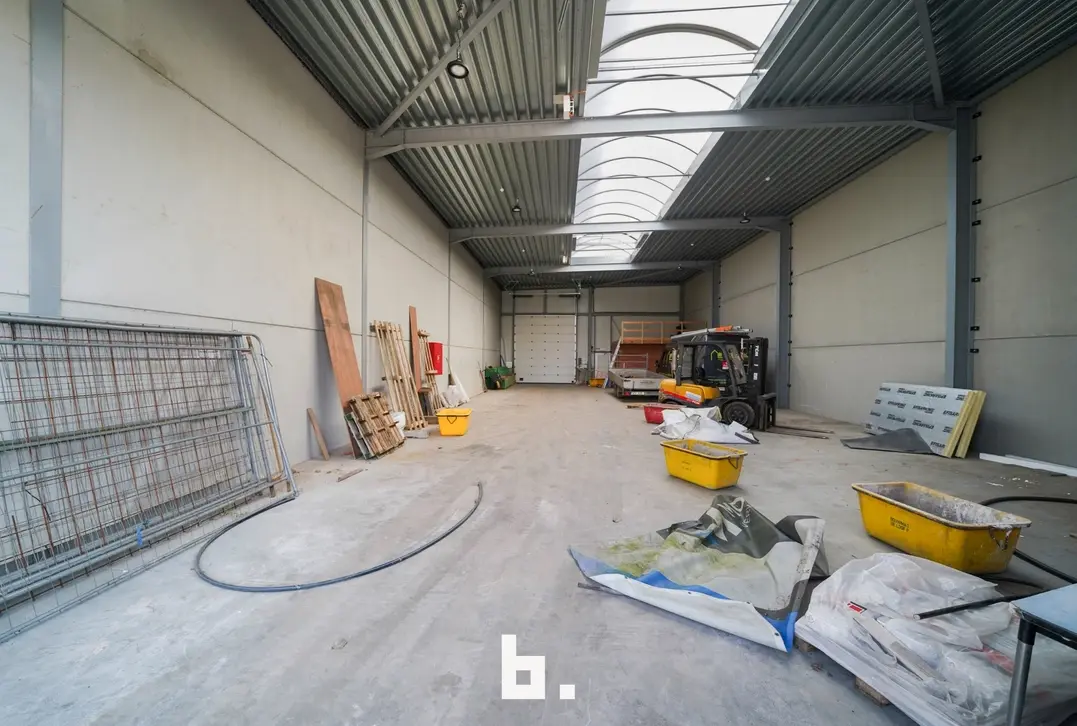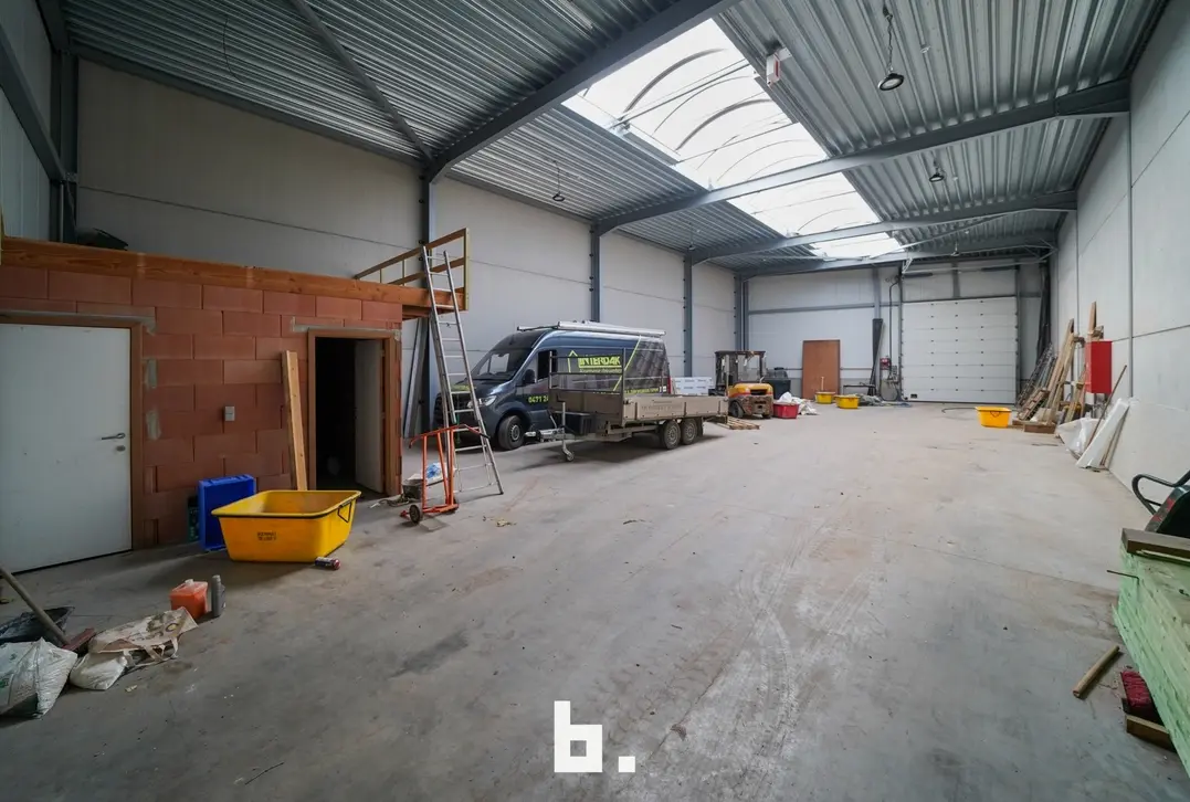 Deze multi- functionele loods is uitgerust met een 2 automatische sectionaalpoorten en een aparte inkomdeur met groot lichtstraat, wat zorgt voor aangename lichtinval.