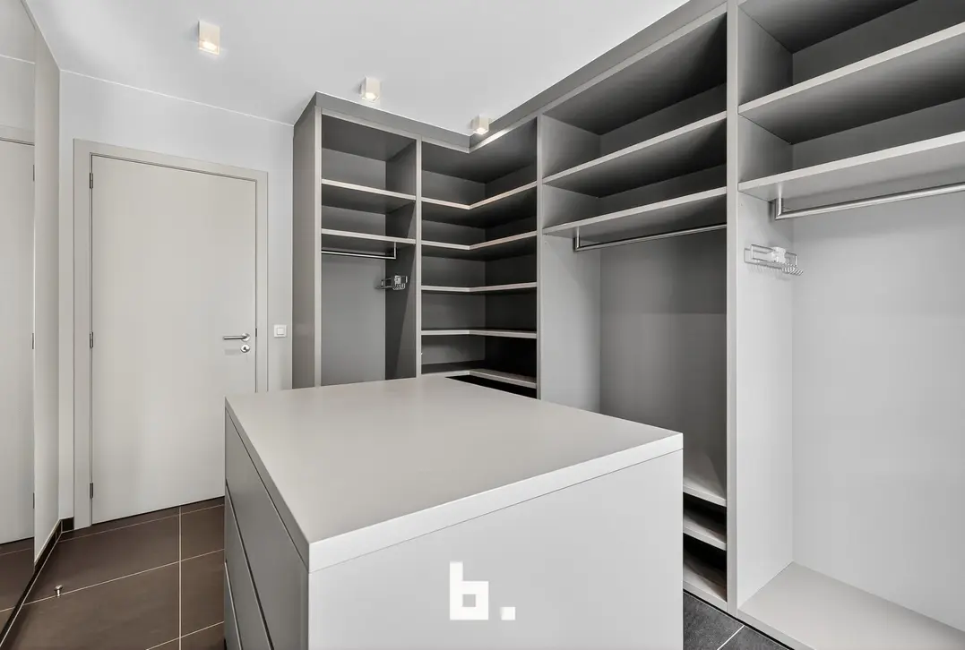 Het appartement beschikt over drie slaapkamers, waarvan één met ensuite badkamer. De tweede slaapkamer doet momenteel dienst als dressing, en er is bovendien nog een volwaardige tweede badkamer aanwezig. Een praktische wasplaats en technische berging bieden extra comfort en functionaliteit.