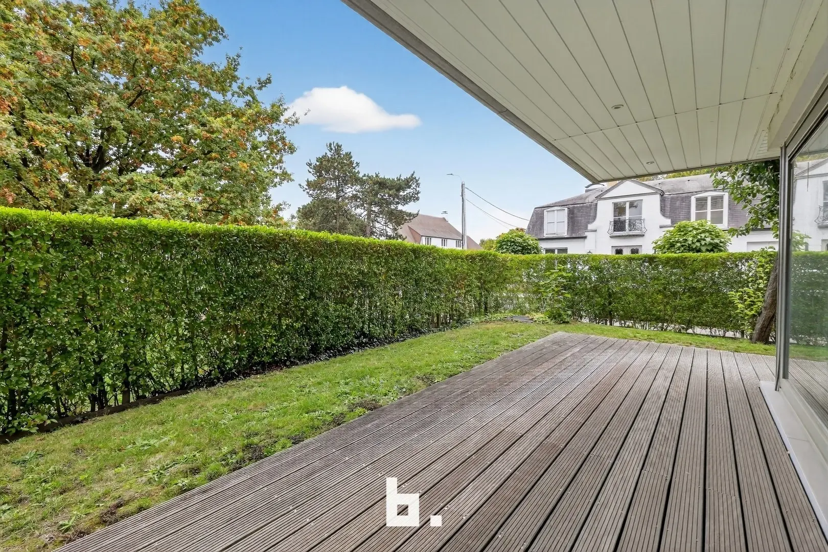 Buiten geniet je van een volledig afgesloten tuin met overdekt terras, perfect om in alle rust te ontspannen met zicht op groen.
