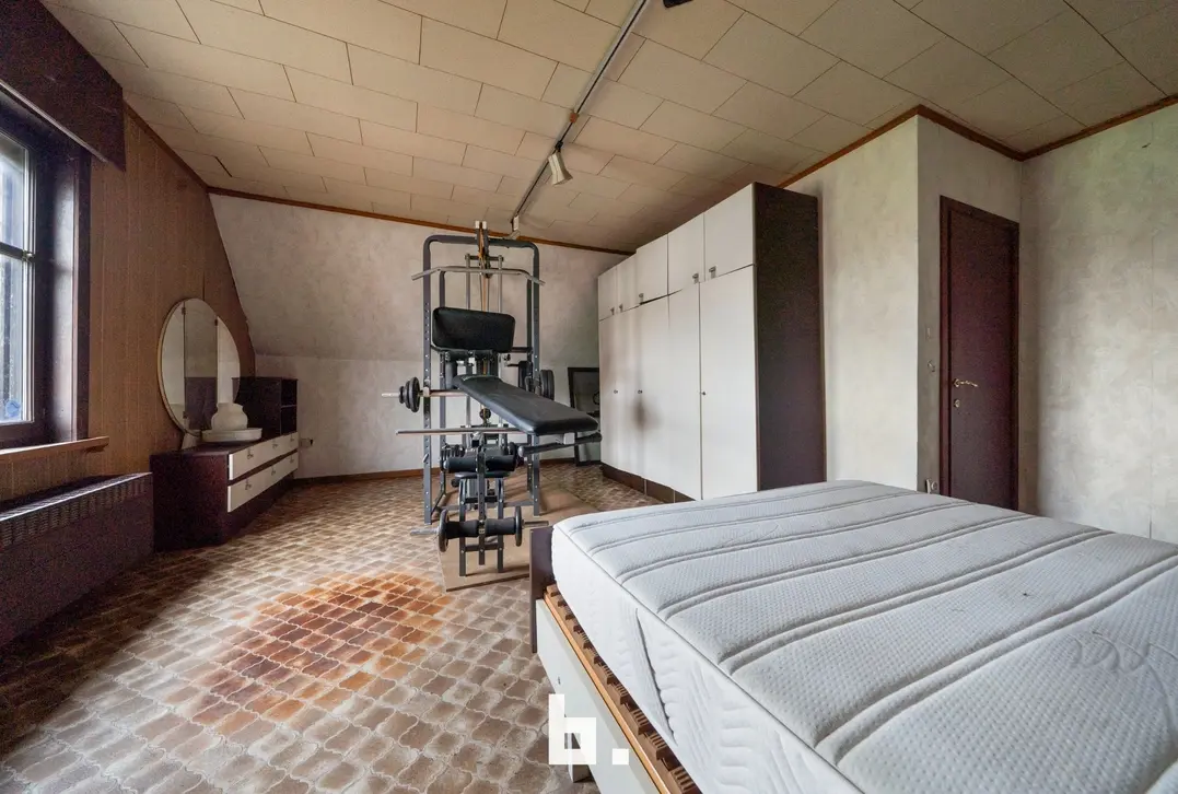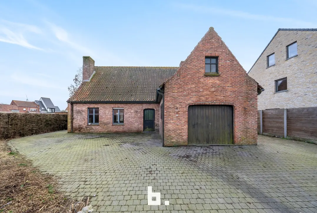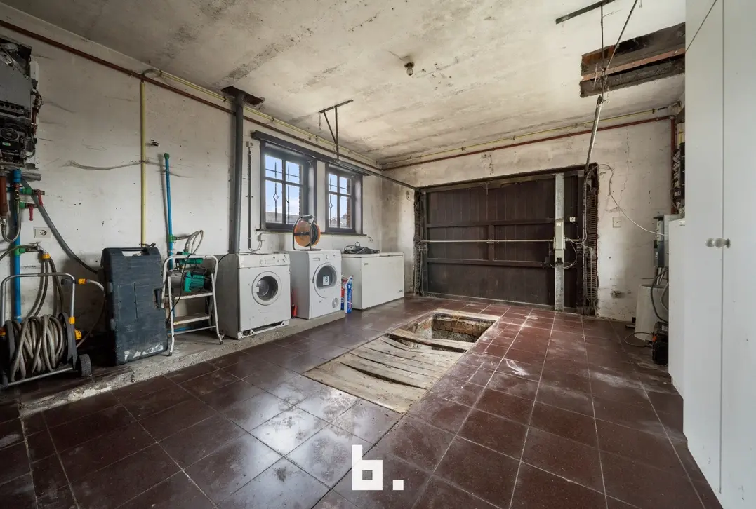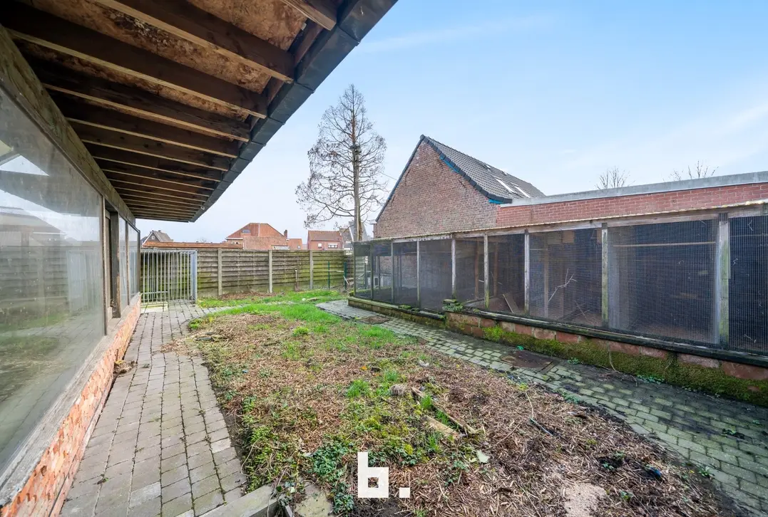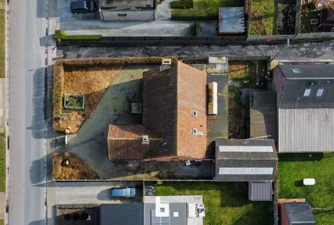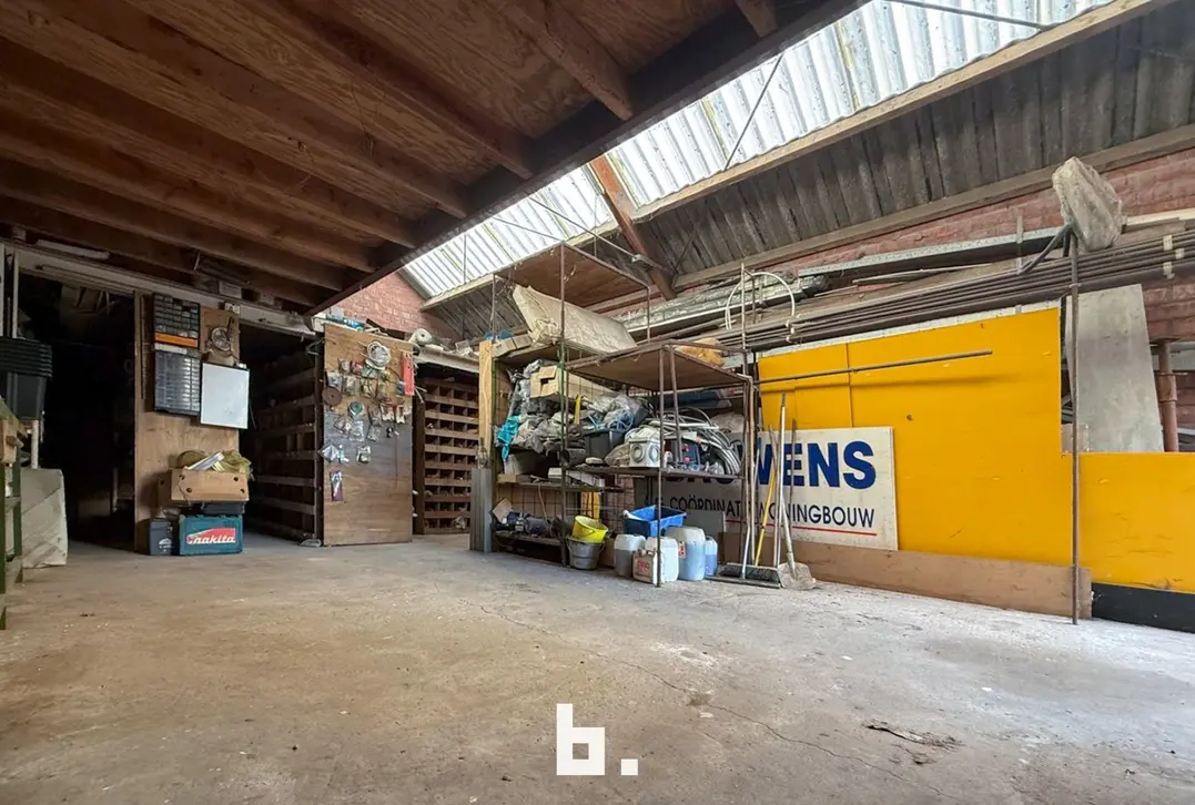 Indeling: Ruime oprit voor meerdere wagens, inkom, bureel, slaapkamer, woonkamer, keuken, toilet, ruim overdekt terras, tuin, garage en een ruime loods achteraan perceel.
