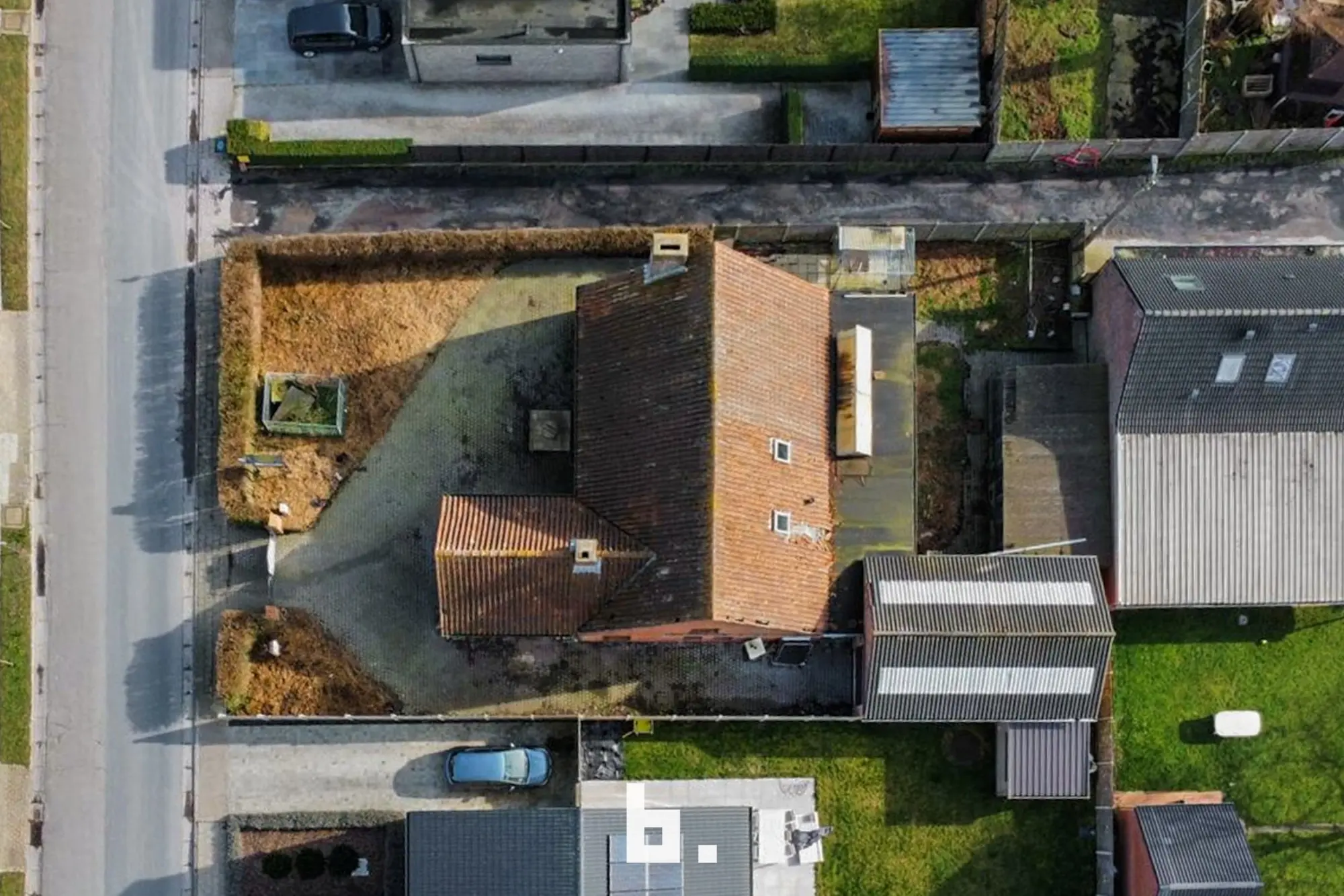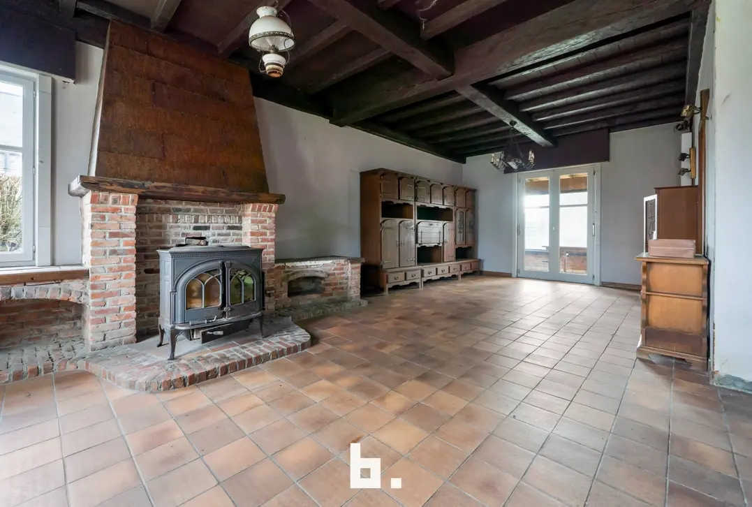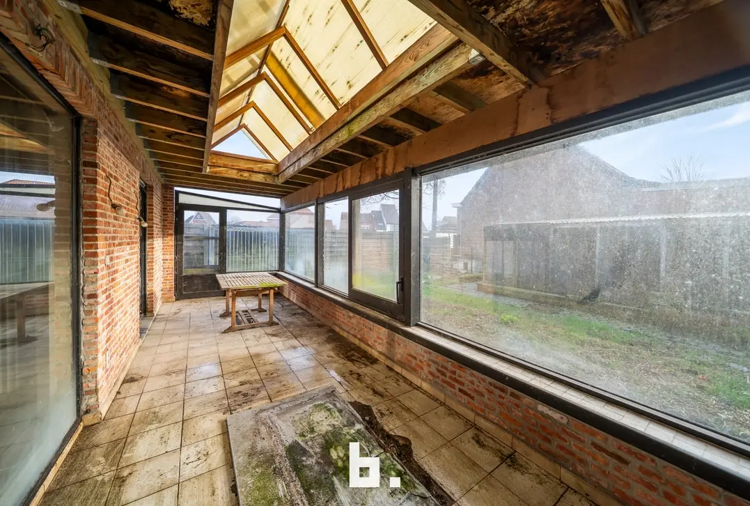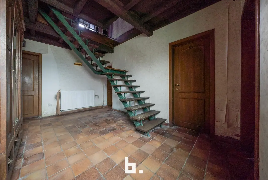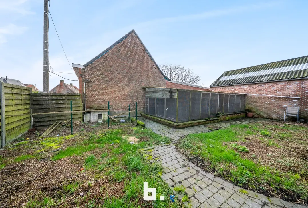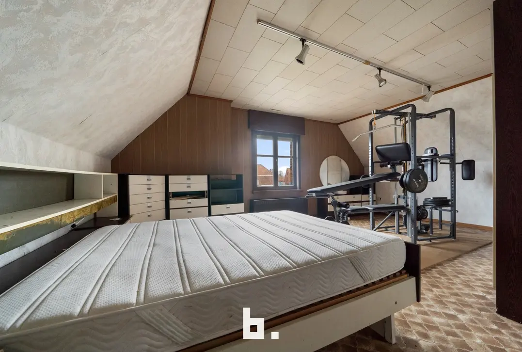 Indeling: Ruime oprit voor meerdere wagens, inkom, bureel, slaapkamer, woonkamer, keuken, toilet, ruim overdekt terras, tuin, garage en een ruime loods achteraan perceel.